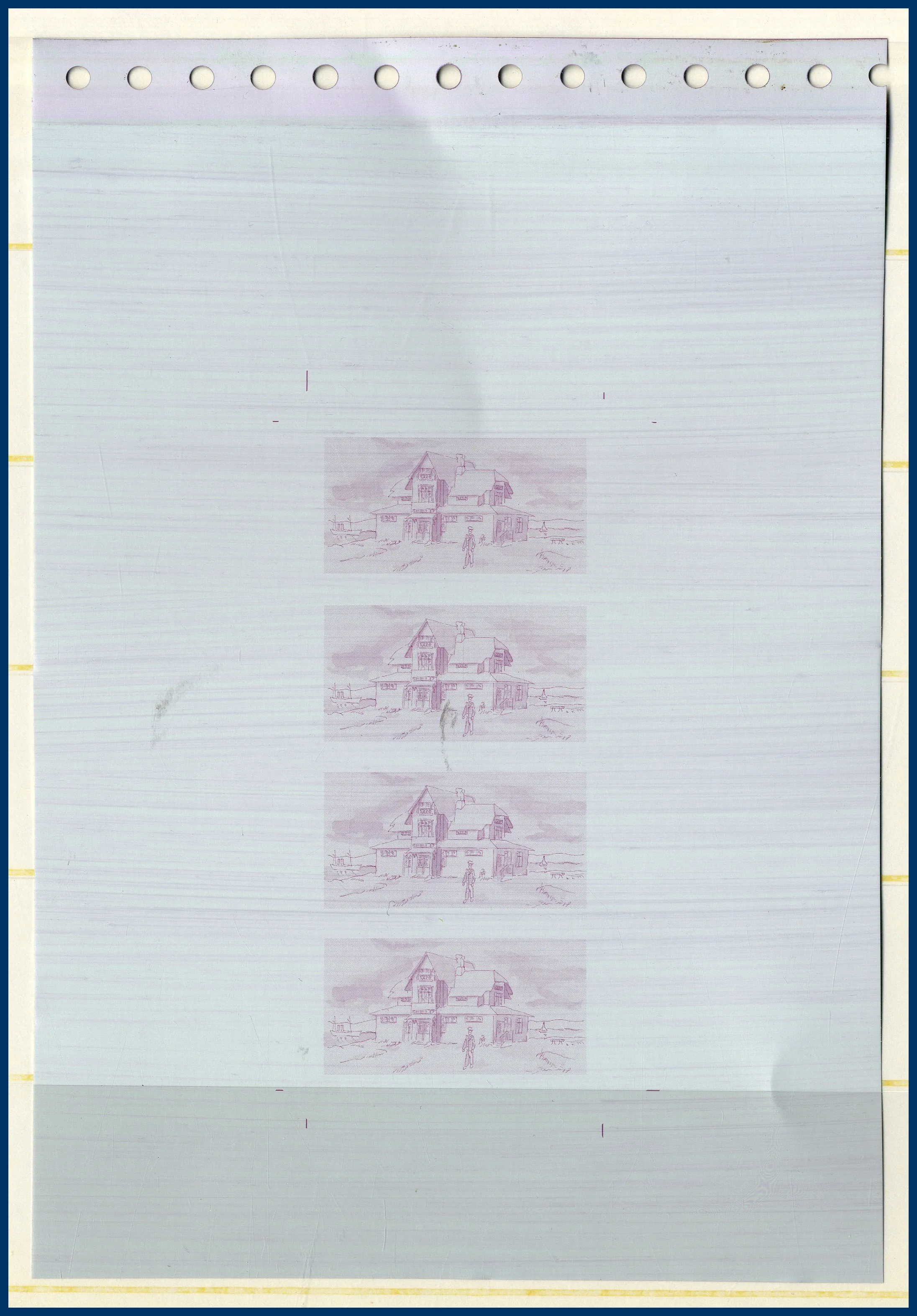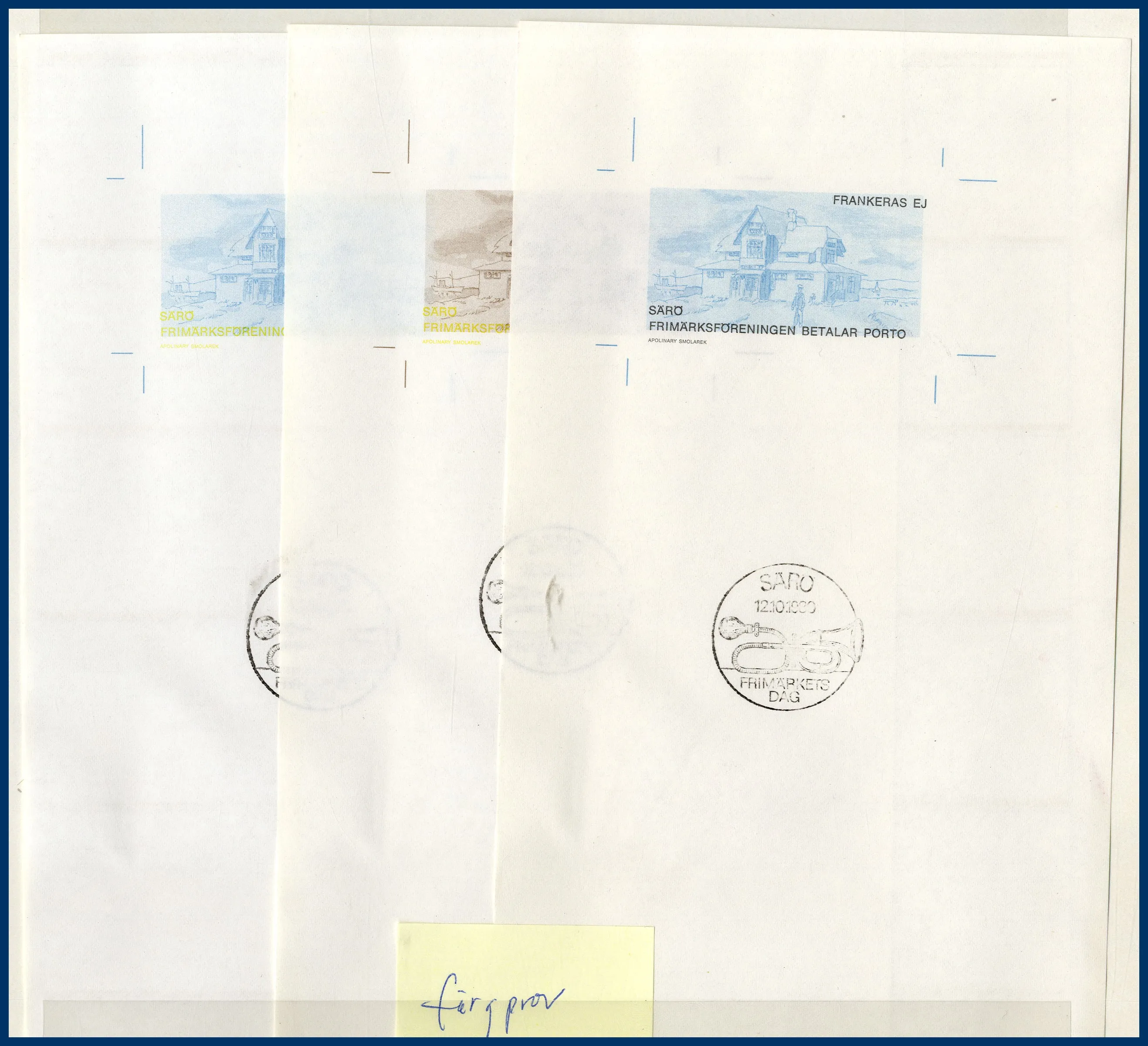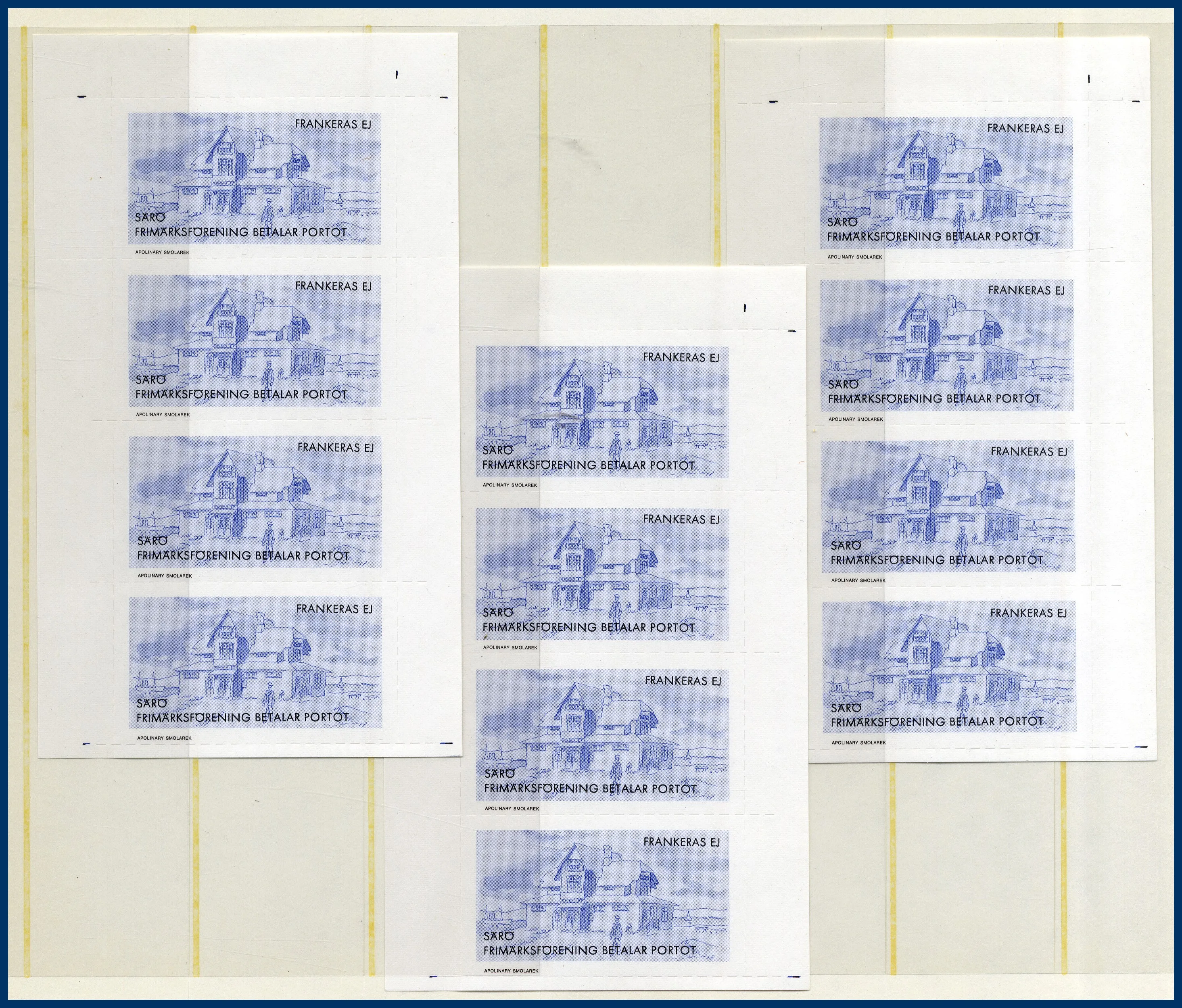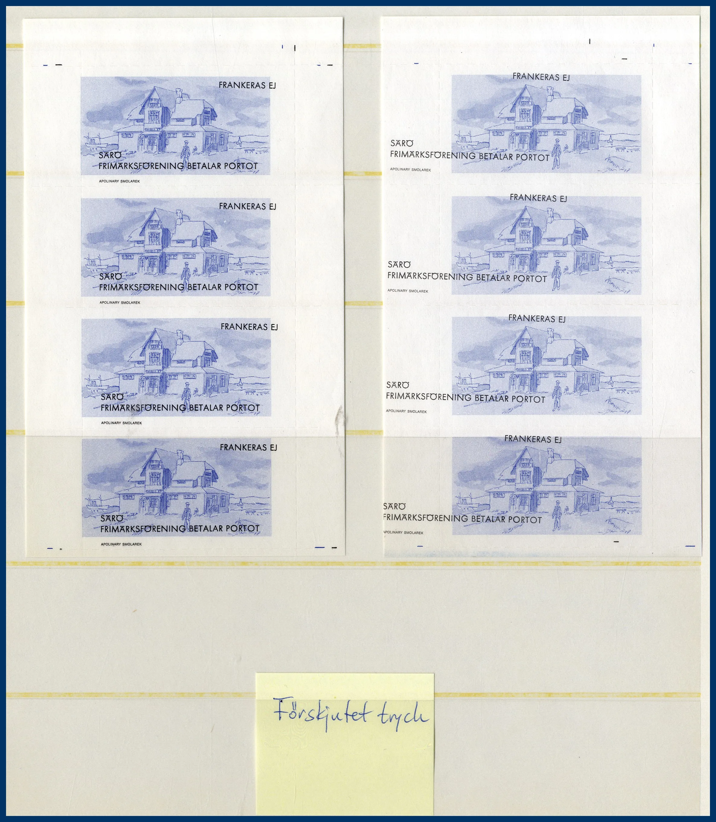 avbildar Särö Värdshus av konstnären Apolinary Smolarek. Samlingen beskriver hela framtagningsprocessen av märket med: Tryckplåtar i metall, Perforeringsprover, Förskjutet tryck, 6 olika Färgprover, Varianter i 2 olika nyanser, Dokumentation med Posten angående beställning etc. Allt prydligt samlat i visiralbum.