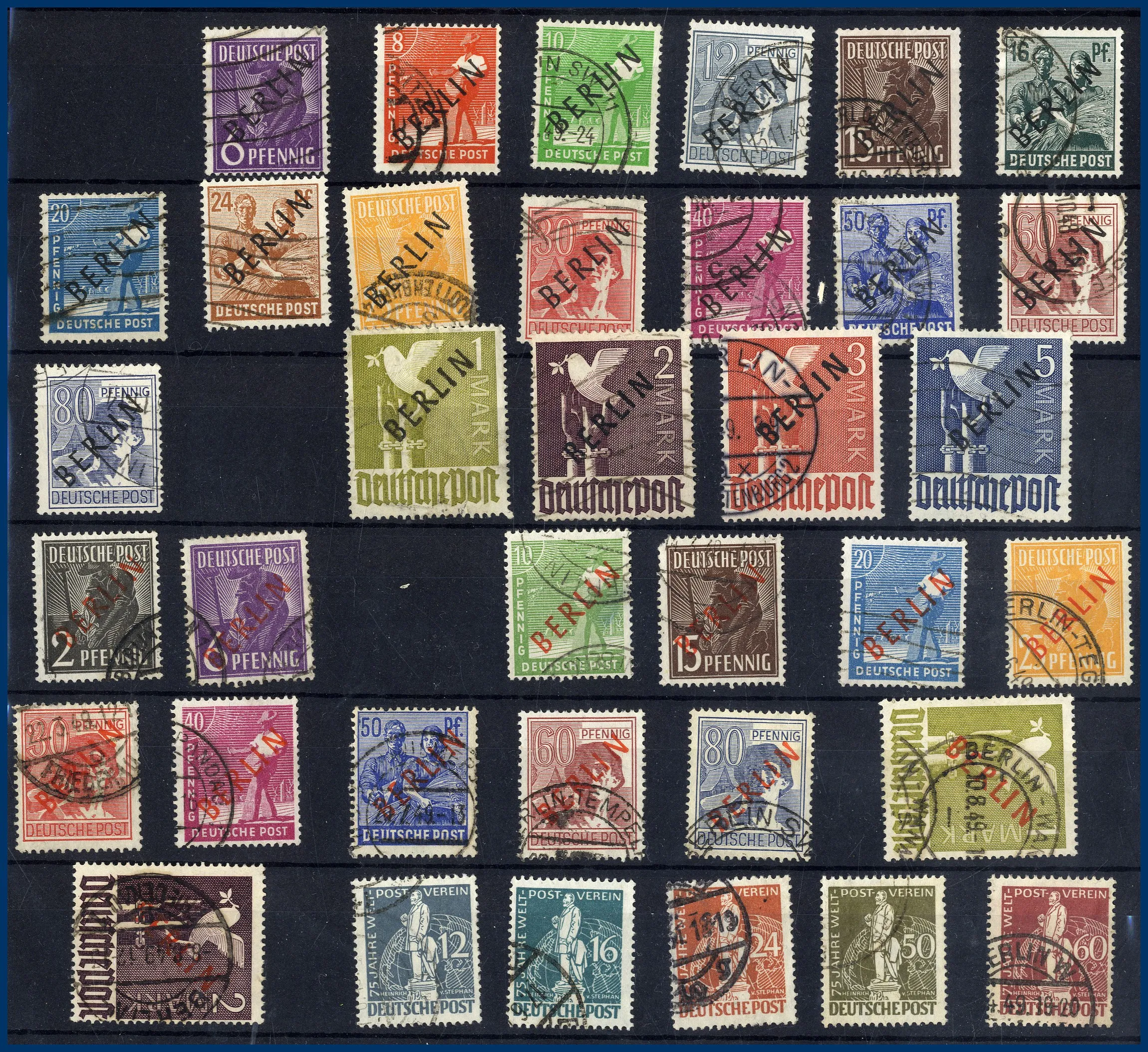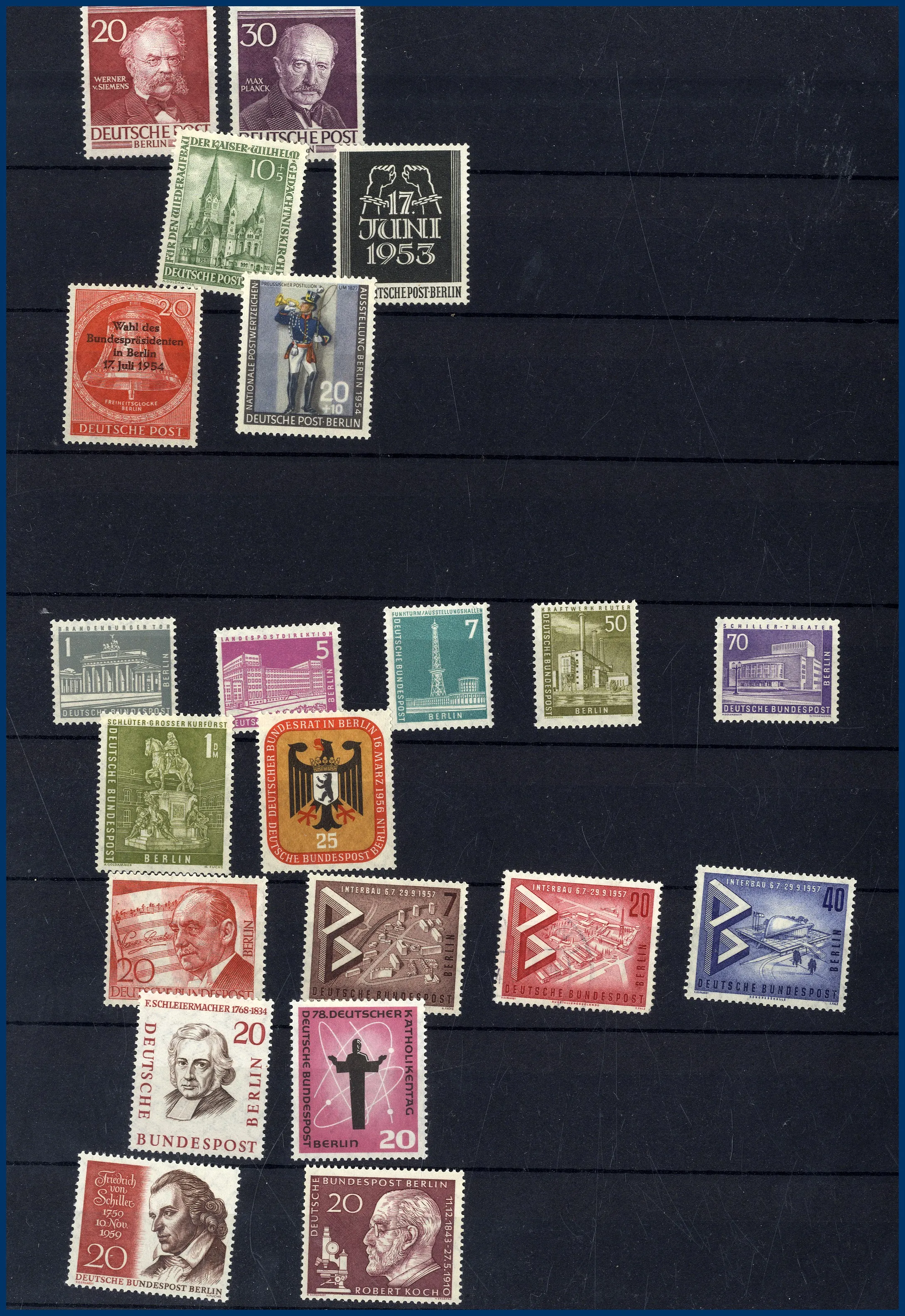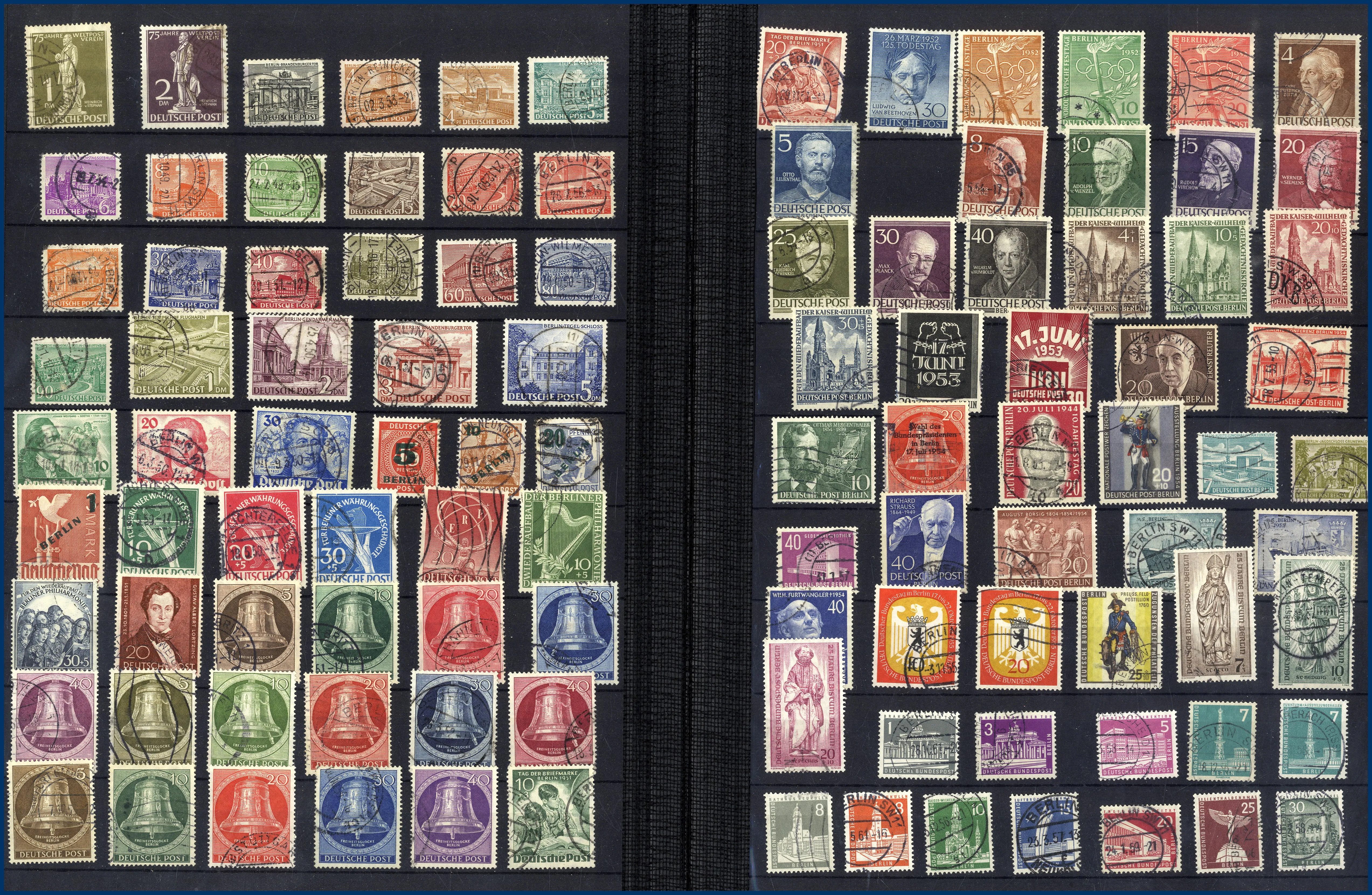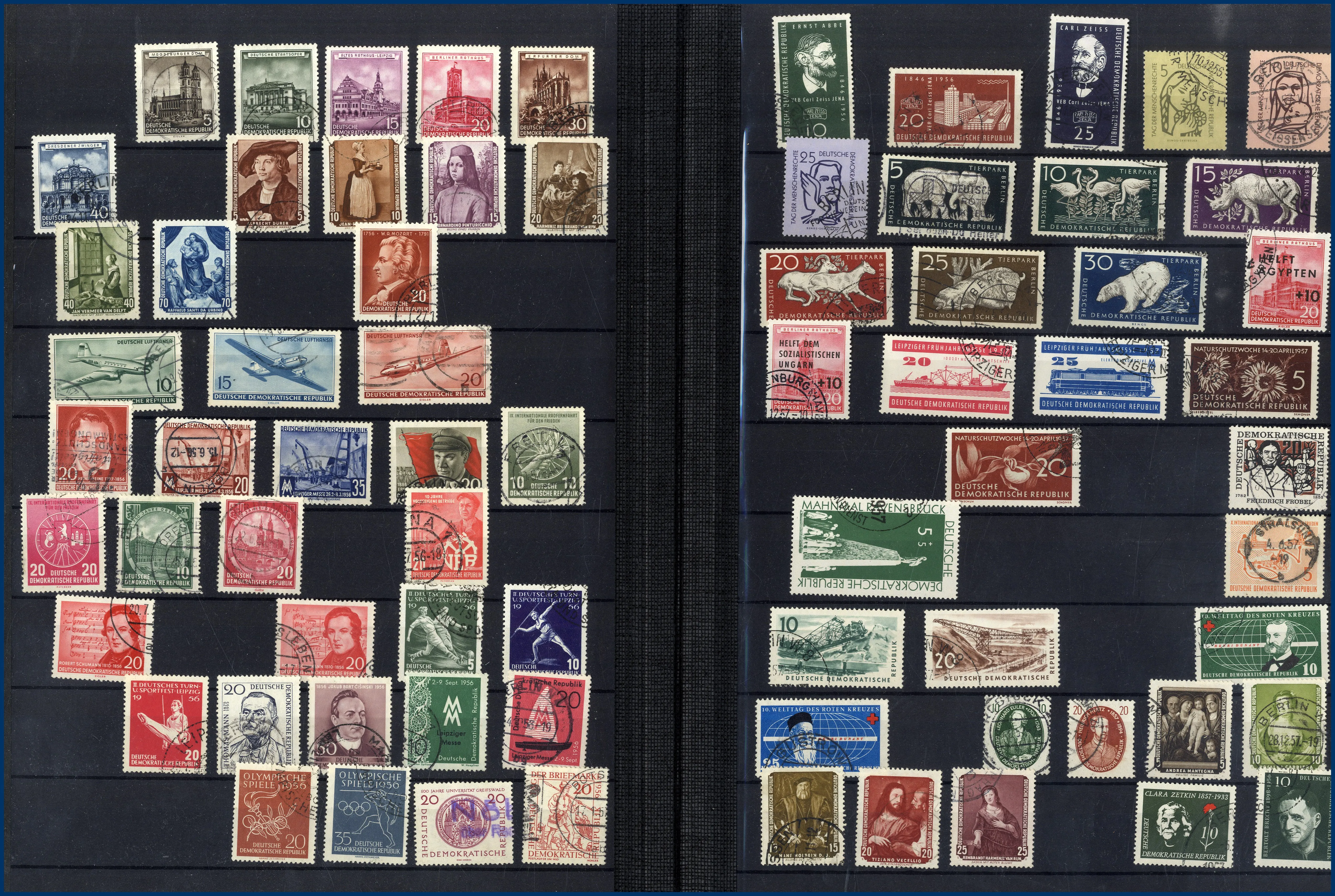 högvalörerna från serierna med rött och svart påtryck med, liksom även några andra bättre tidiga märken. Även en enklare samling DDR i 3 insticksalbum ingår i loten. Mest stämplat men **/* förekommer. Högt katalogvärde, lågt utrop.