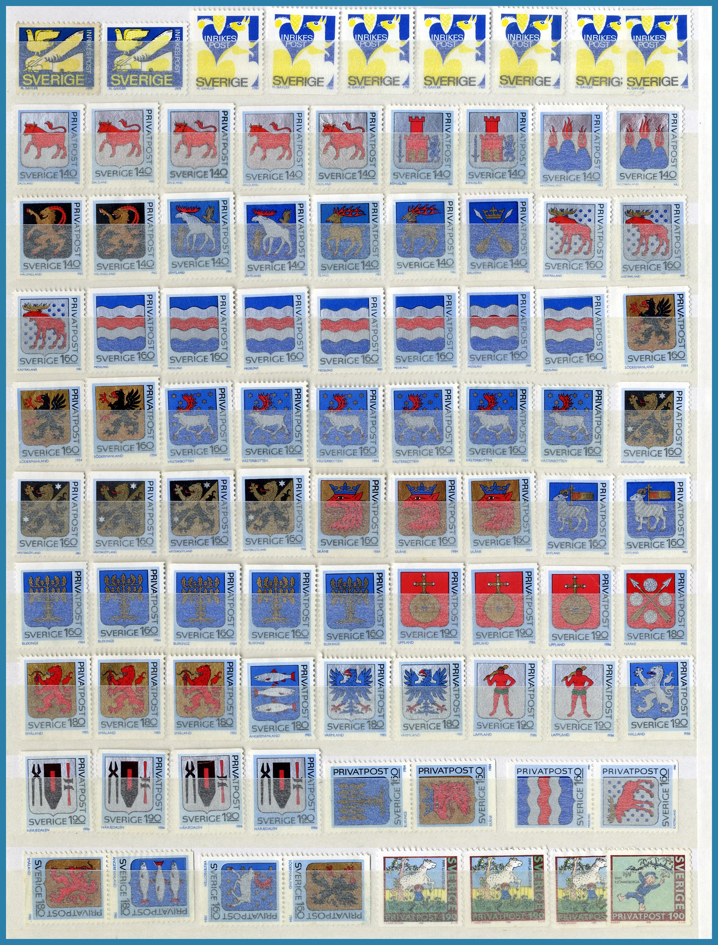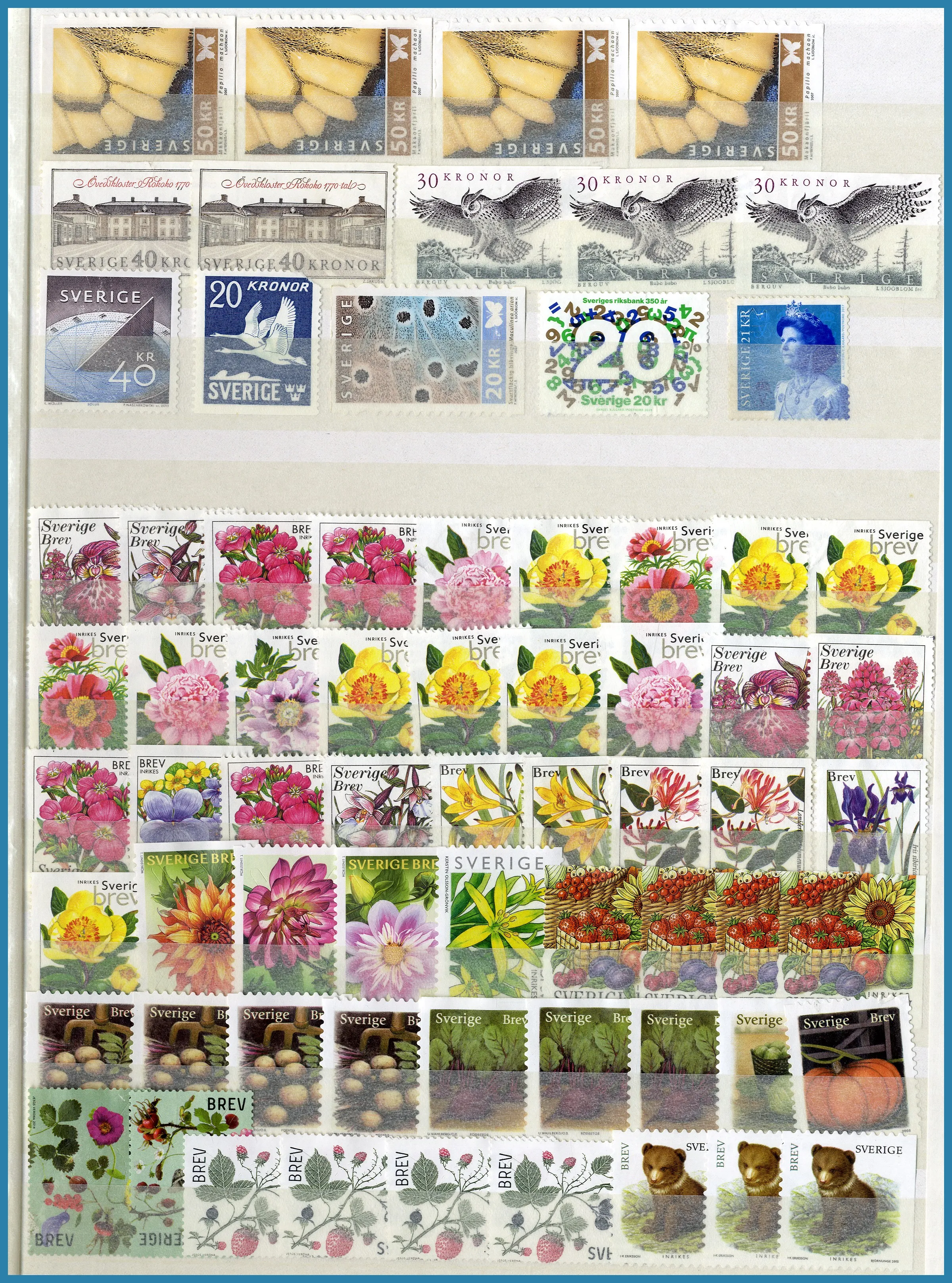 Valörer: 140 st rabattfrimärken, 14 st högvalörer 20-50 kr, 360 st Sverige BREV-märken, 30 st Ekonomibrev, 30 st Föreningsbrev, 285 st valörer 2-12 kr samt 38 st Julmärken.