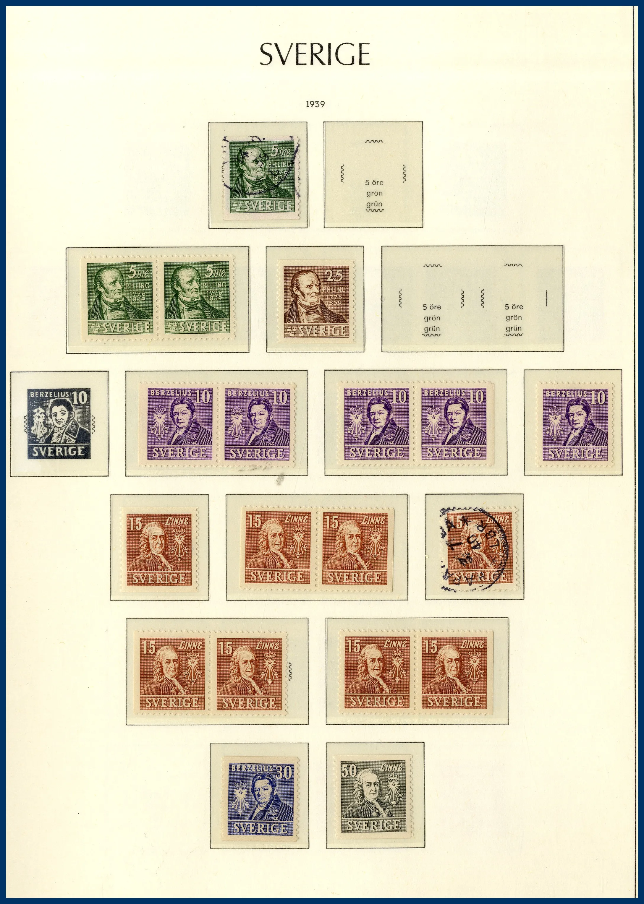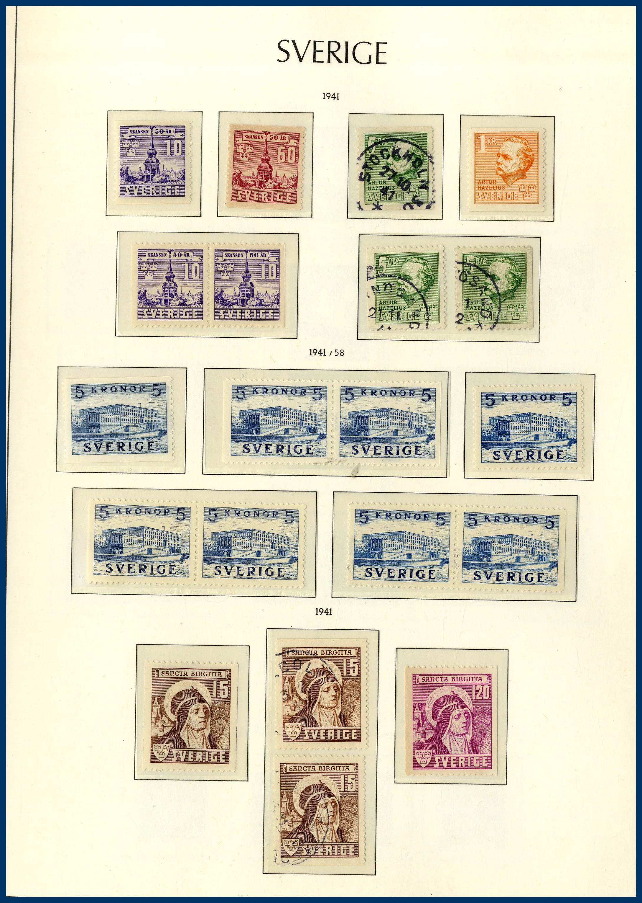 Glest på det klassiska materialet, sedan ökar det på 1900-talet med bl a Lützen **, 120 öre Birgitta **, en hel del bättre BC-/CB-par såsom Slottet, Berzelius, Linne m.m. alla **. Från 1955-2001 troligen komplett i huvudnummer **. Mycket högt nominalvärde oräknat, det finns exempelvis 175 st Sverige Brev samt många rabattmärken och Julmärken (21 kr st). Mycket lågt utrop!!
