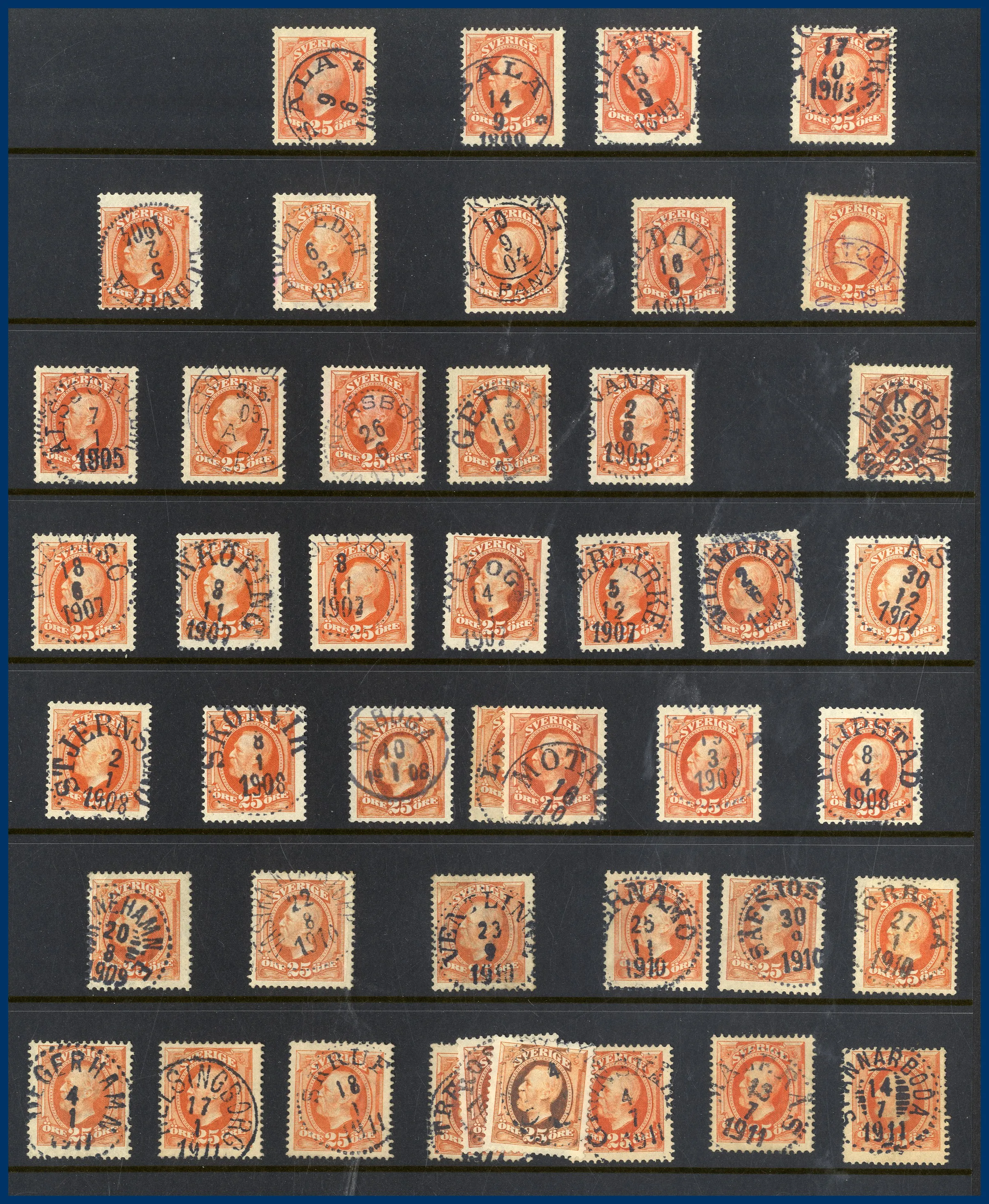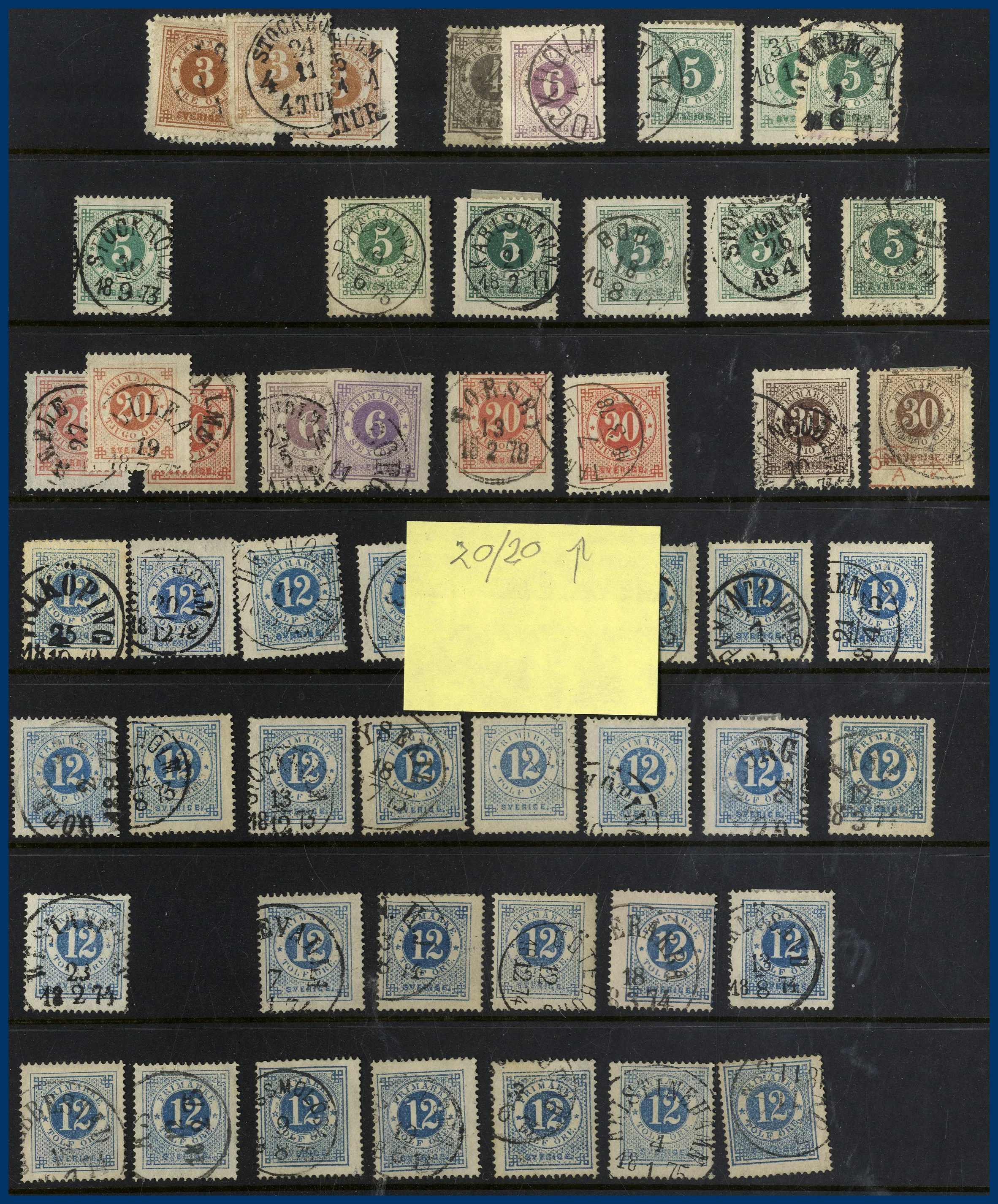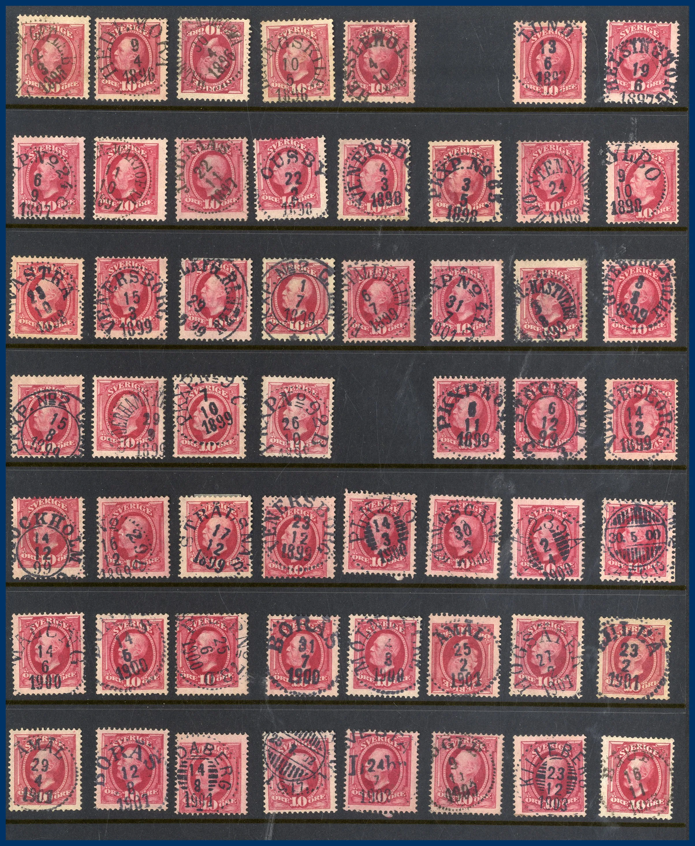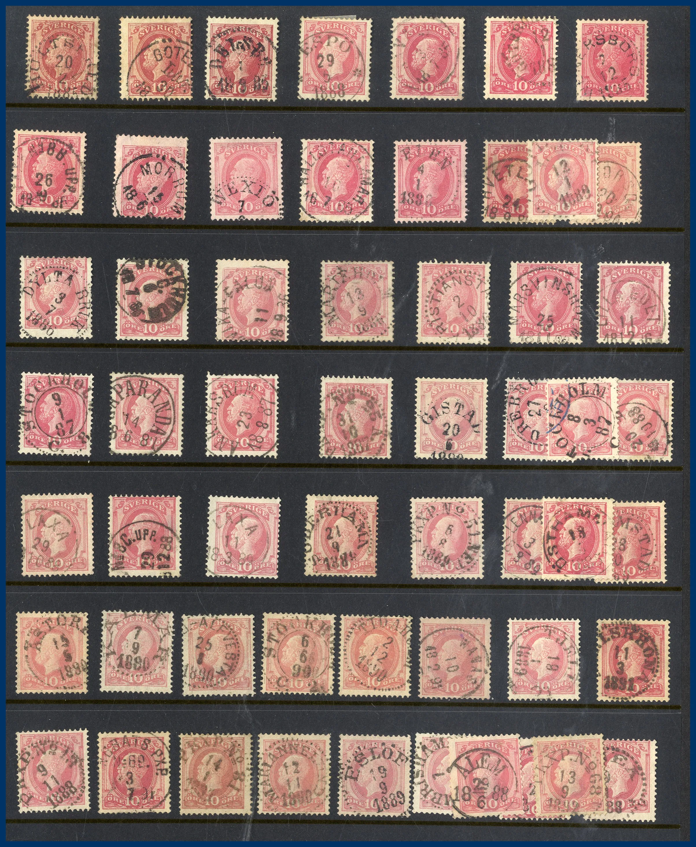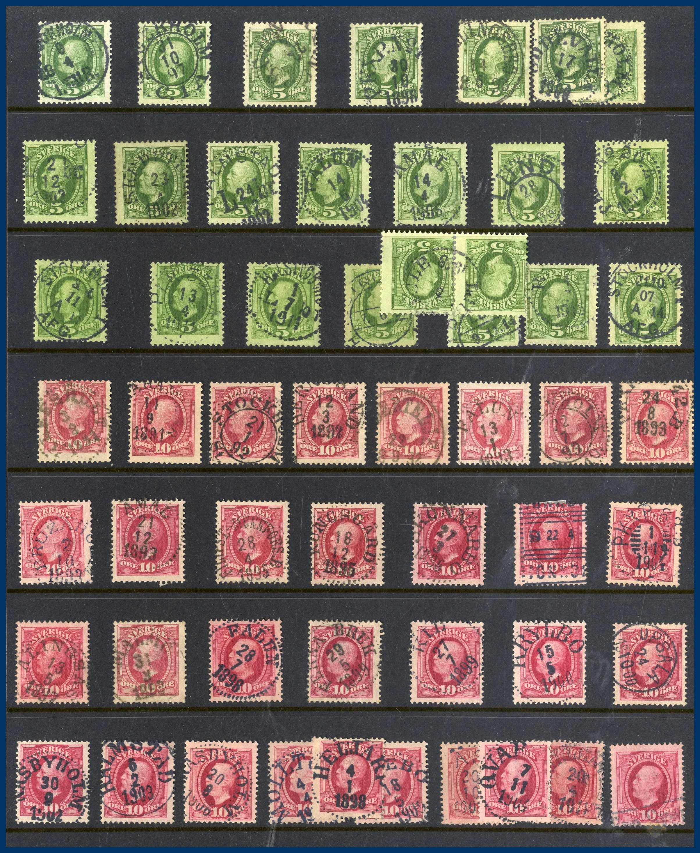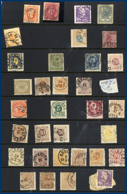Lite Vapentyp och Liggande lejon i blandad kvalitet, många sidor Ringtyp, mängder med Oscar II varav många med vackra stämplar samt lite avarter. Även några sidor Stående lejon, Medaljong och lite annat.