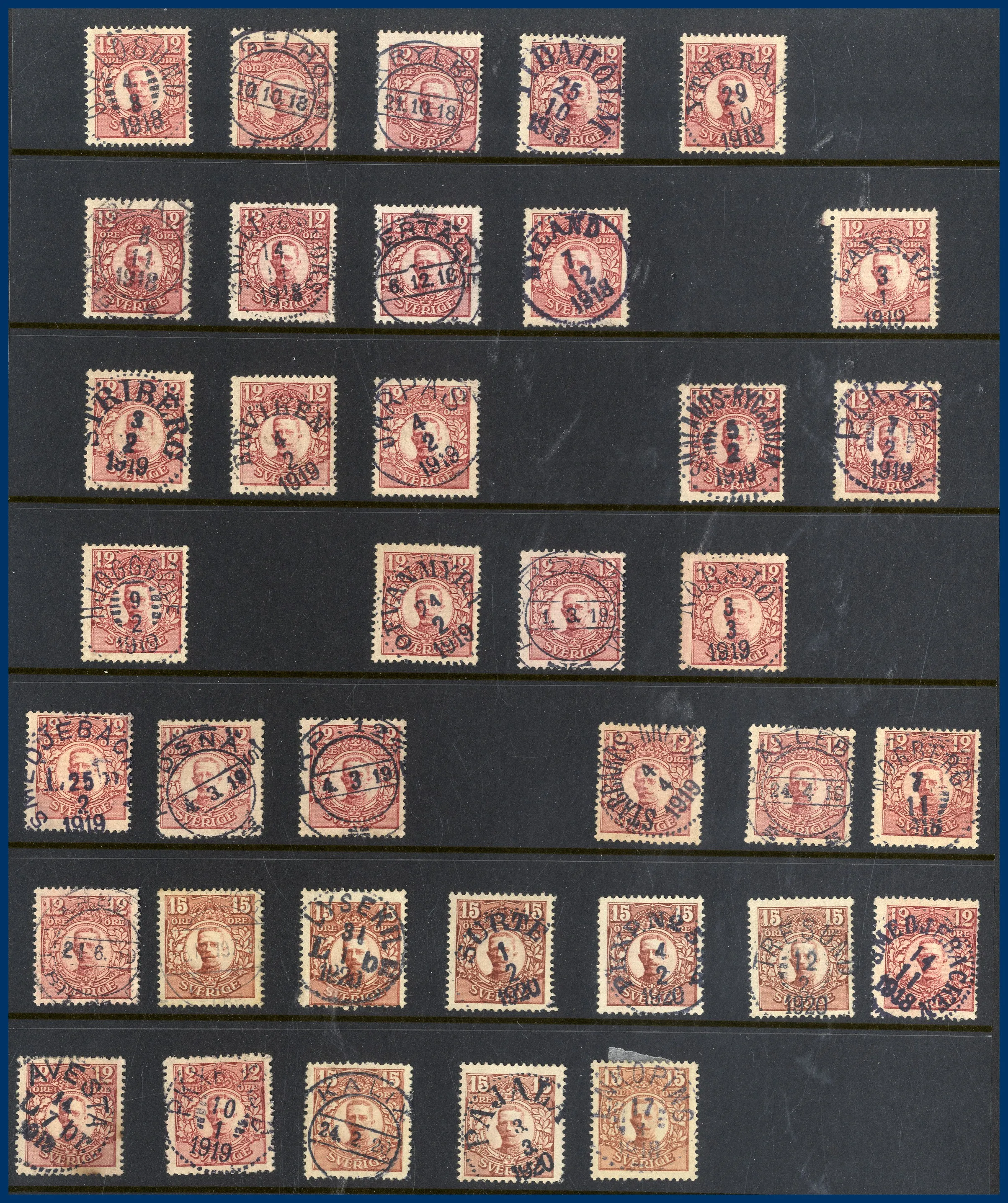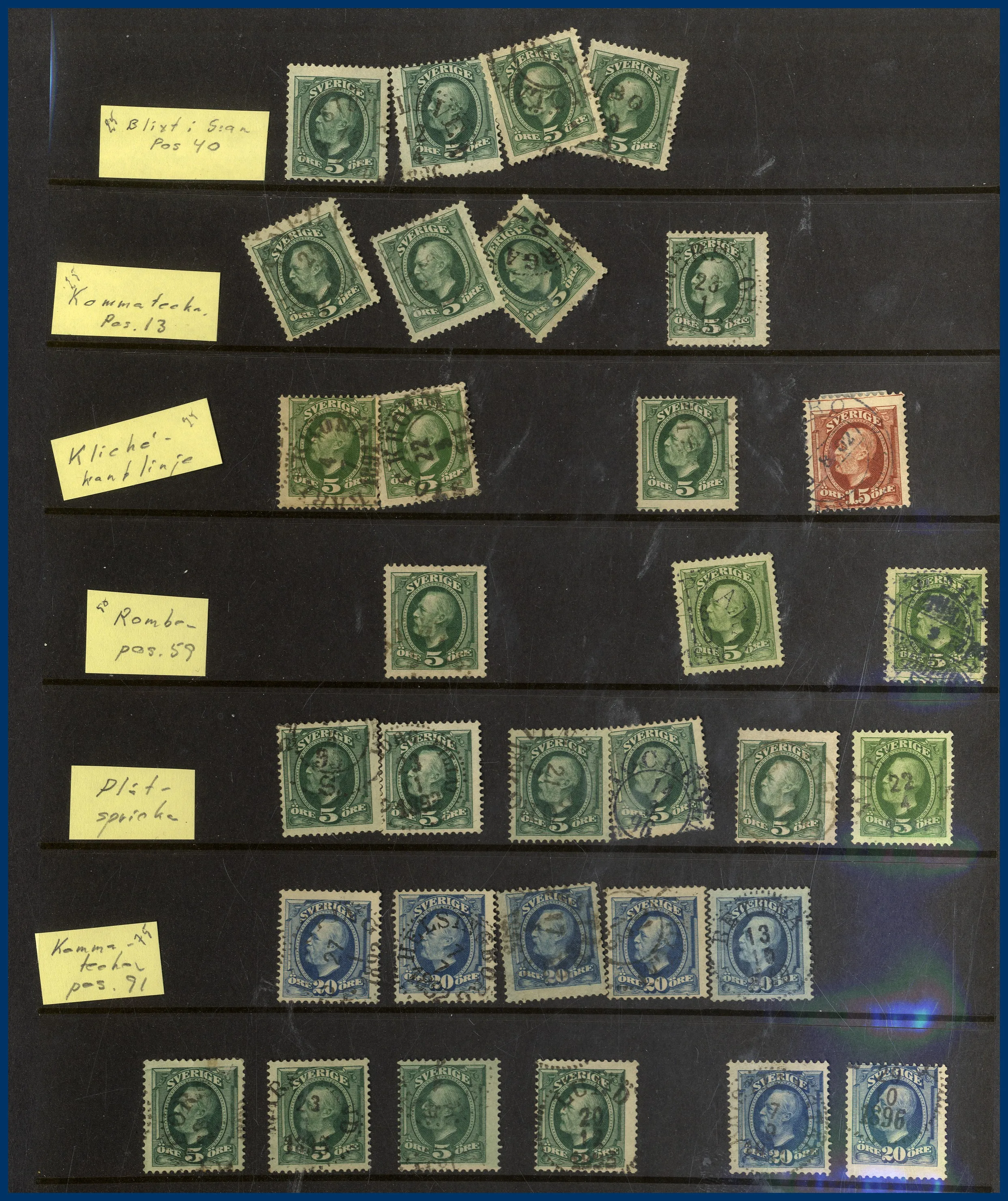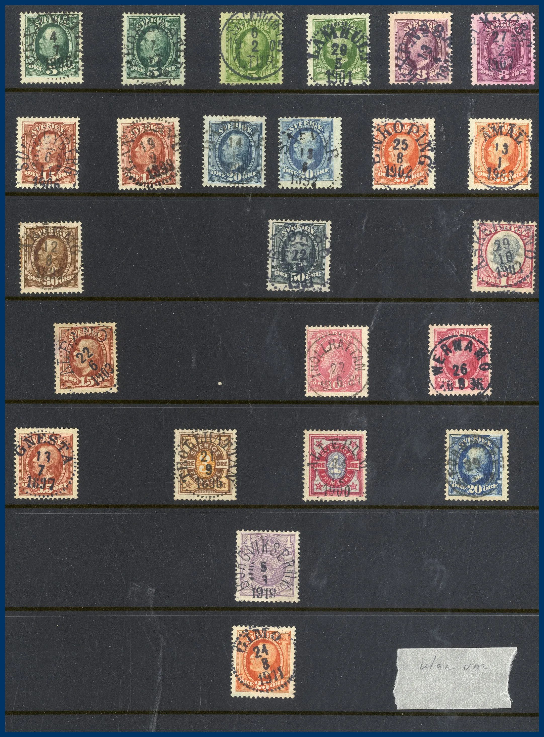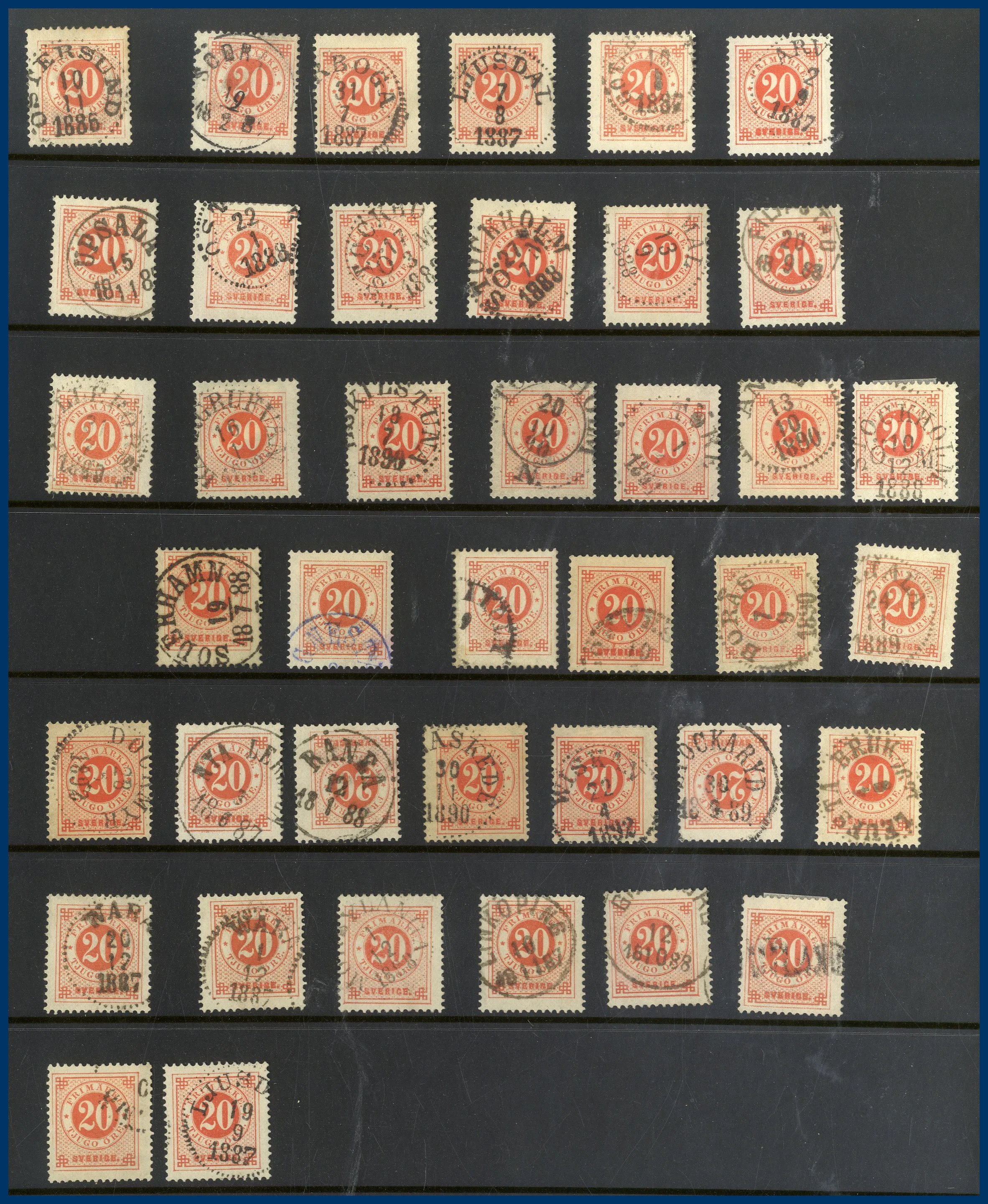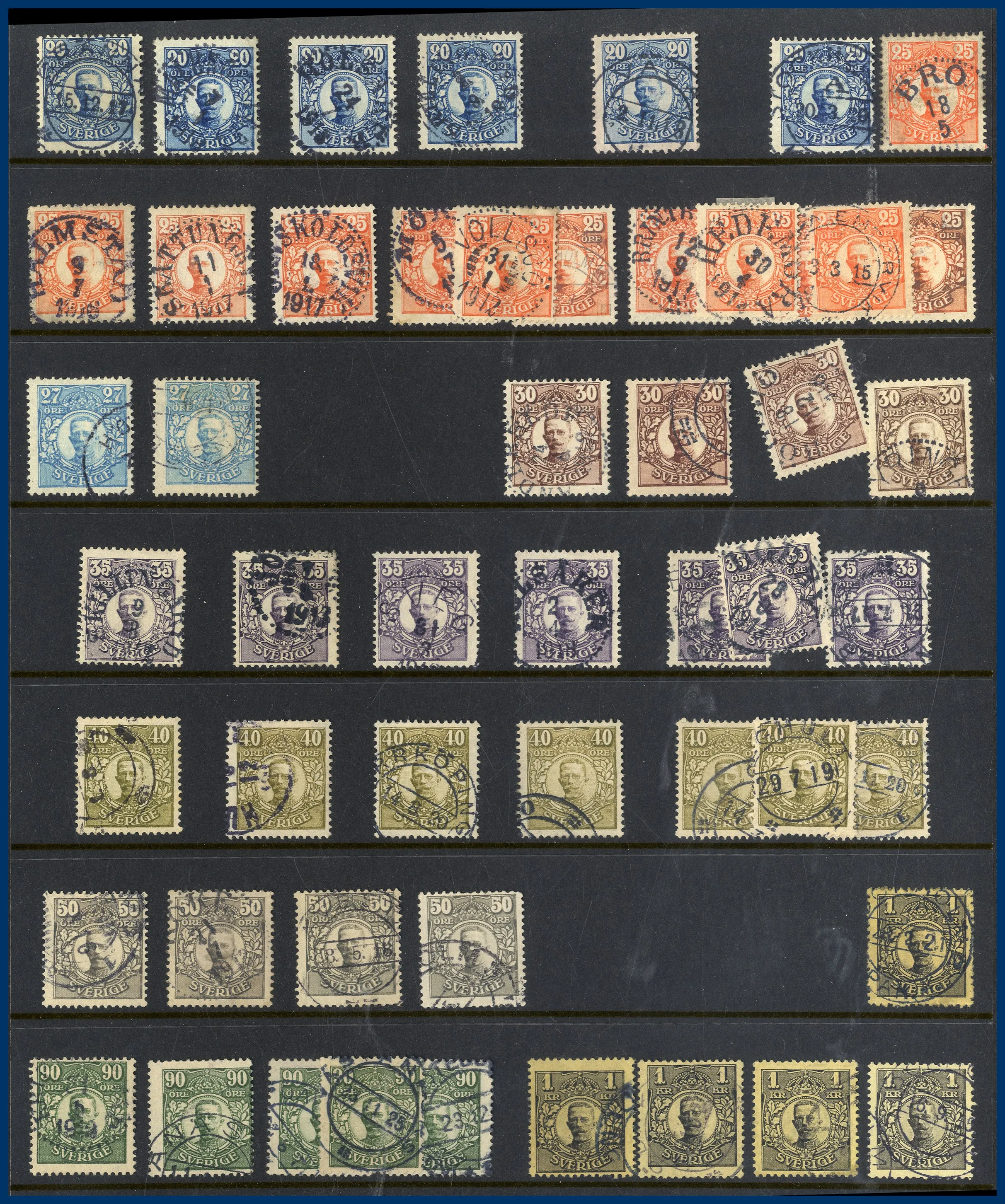 Lite Vapentyp och Liggande lejon i blandad kvalitet, många sidor Ringtyp, mängder med Oscar II varav många med vackra stämplar samt lite avarter. Även några sidor Stående lejon, Medaljong och lite annat.