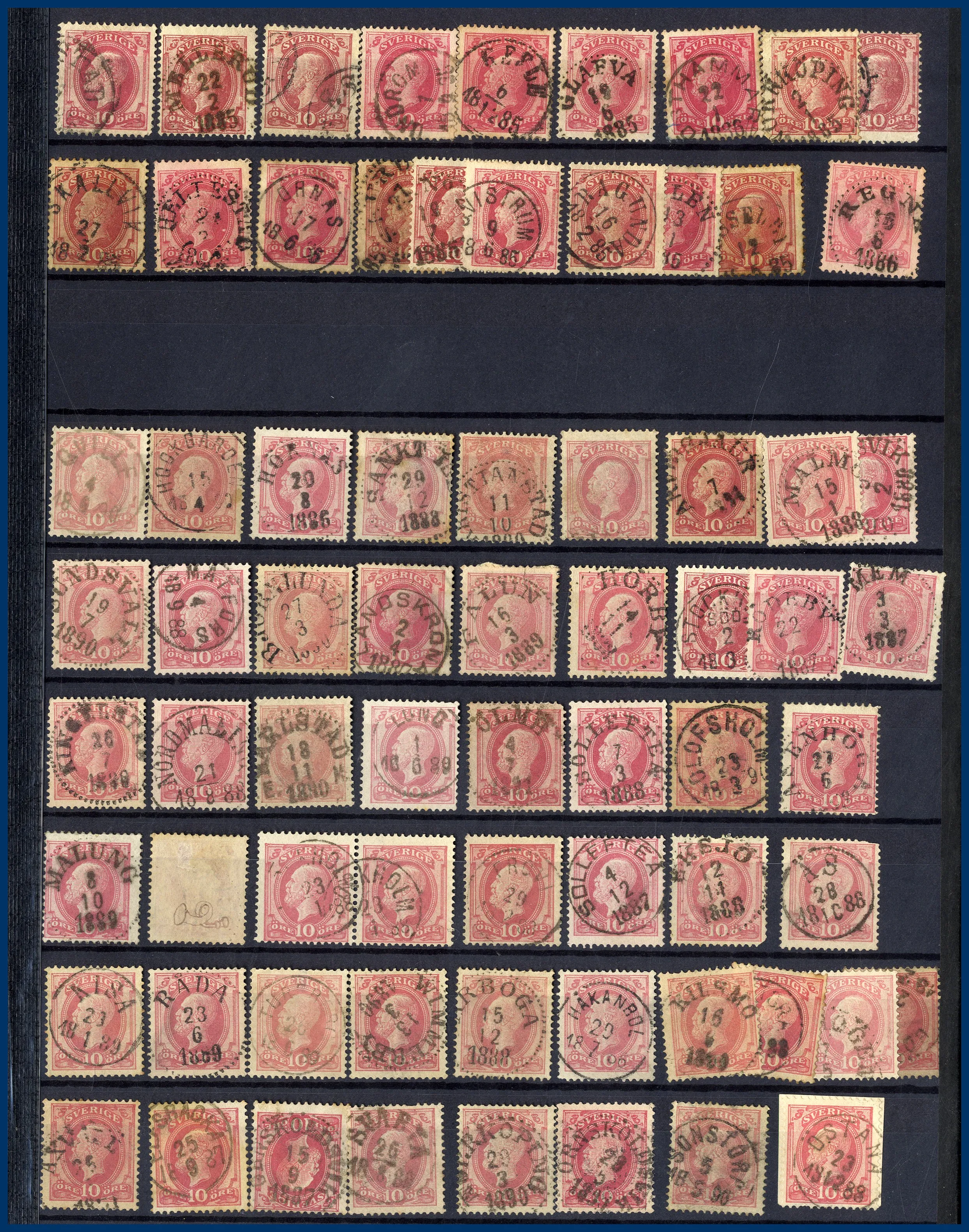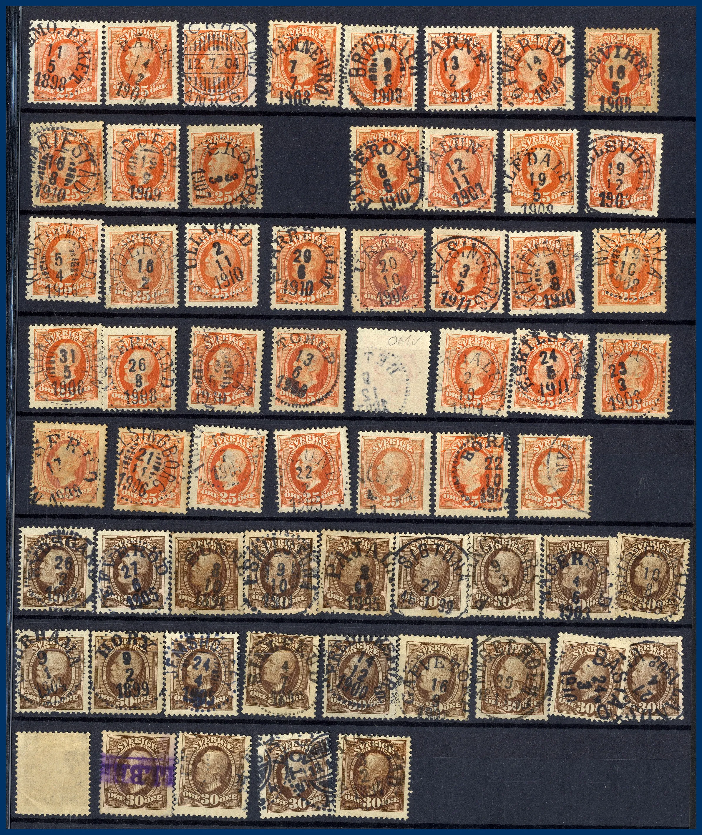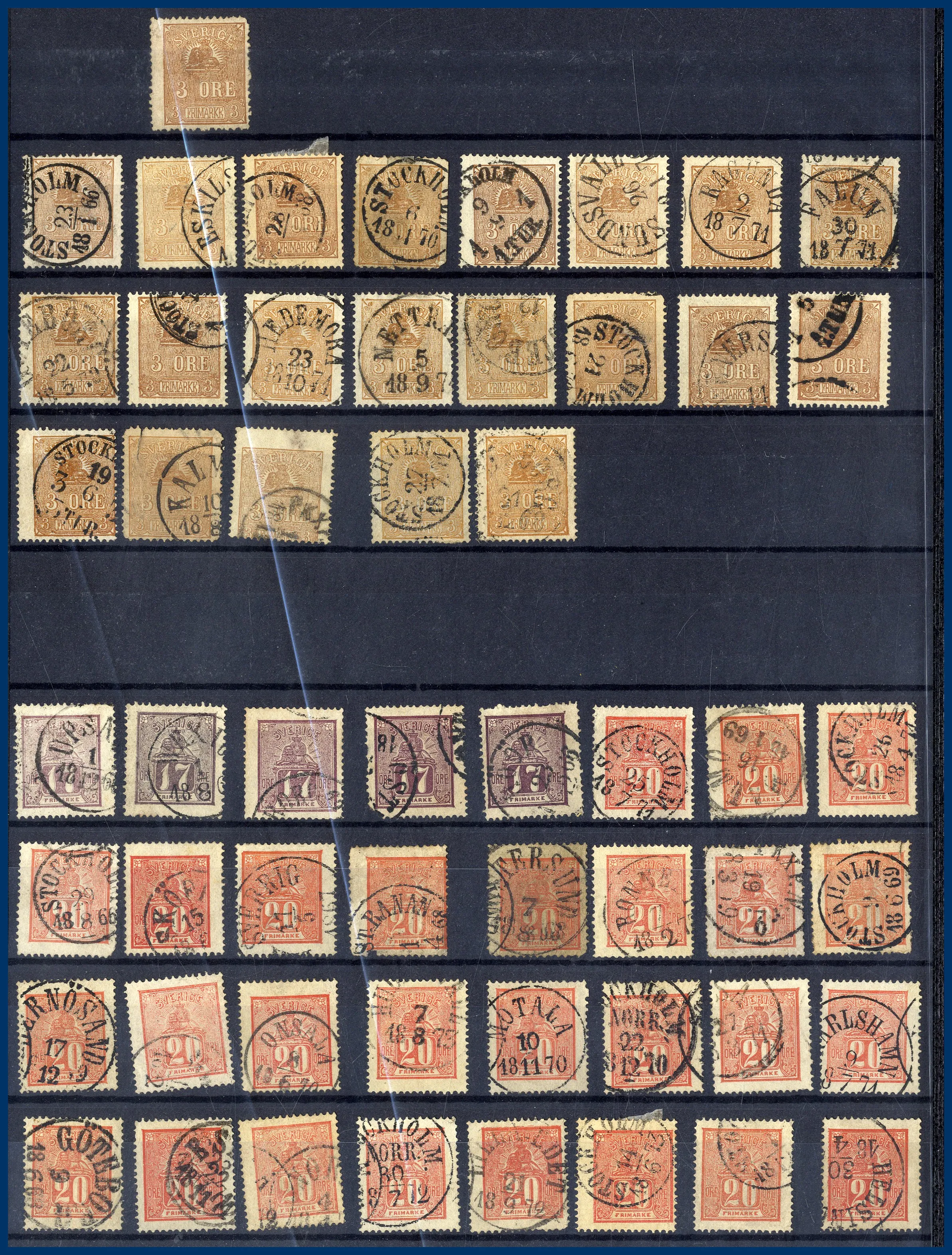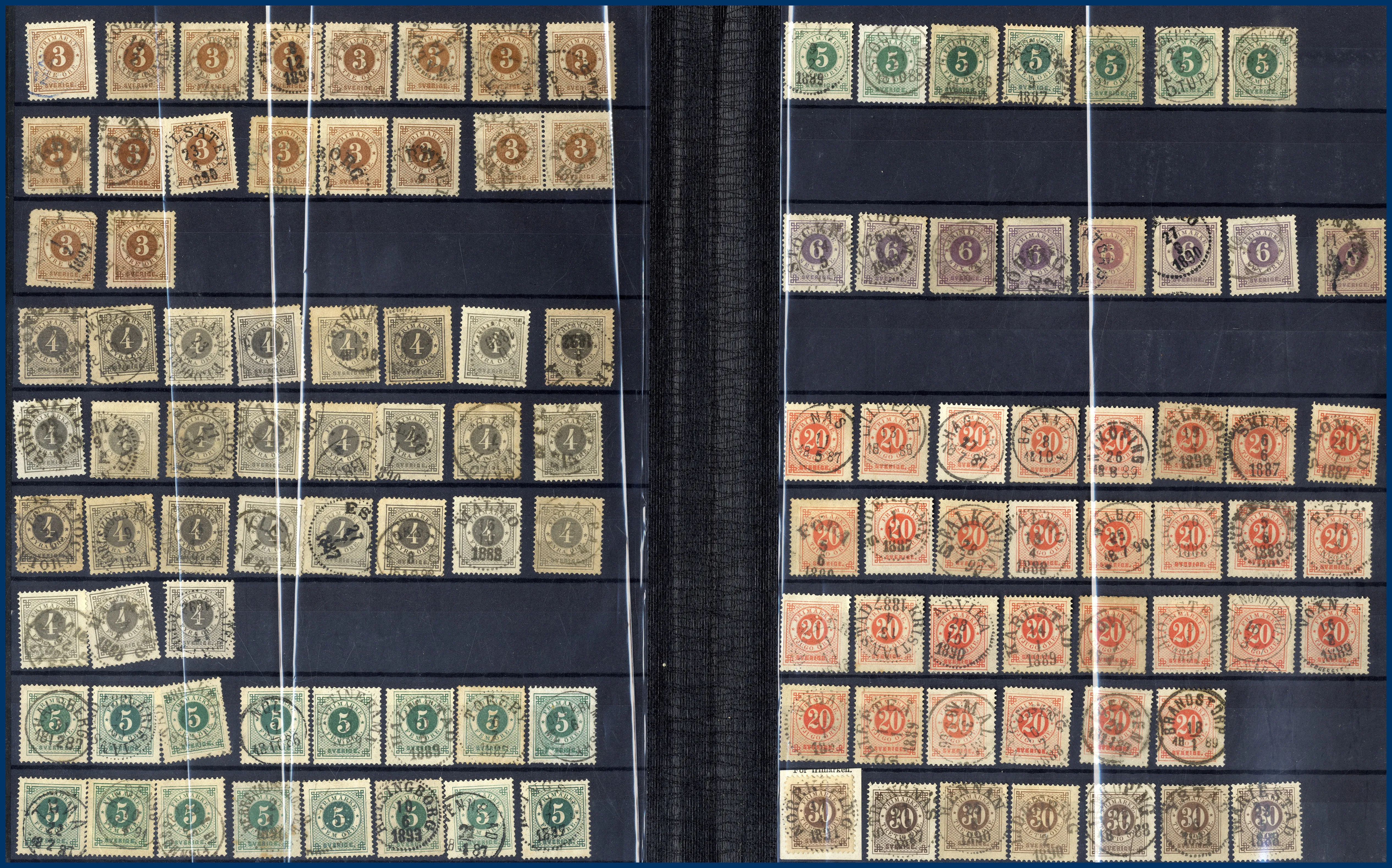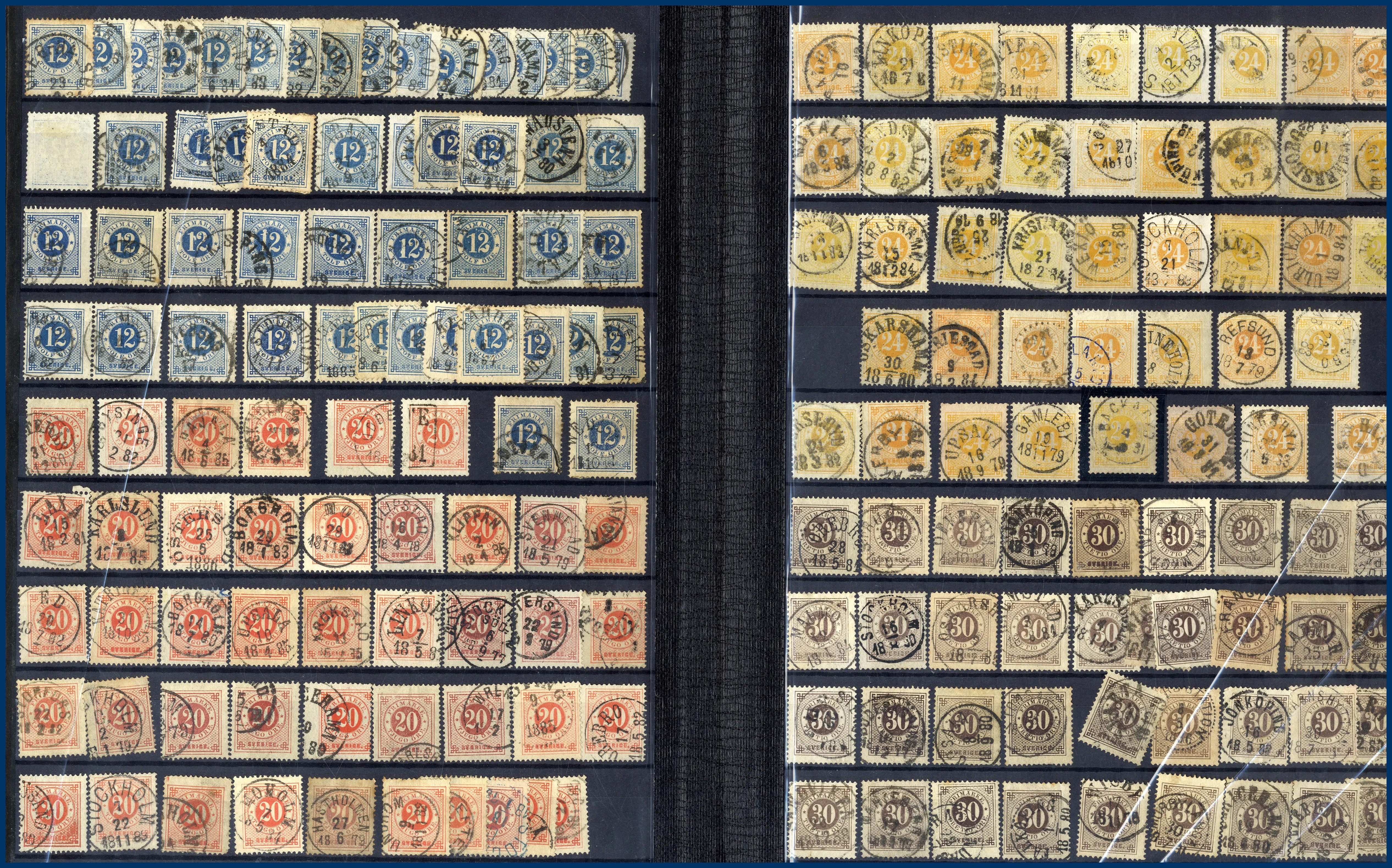 insticksalbum. Fyrskillingar, Liggande lejon, Vapentyp, Ringtyp, Oscar II, Kongress/Förening, Posthus, BC-/CB-par samt lite bandmärken. Mestadels många exemplar av varje märke. En hel del vackra stämplar inemellan.