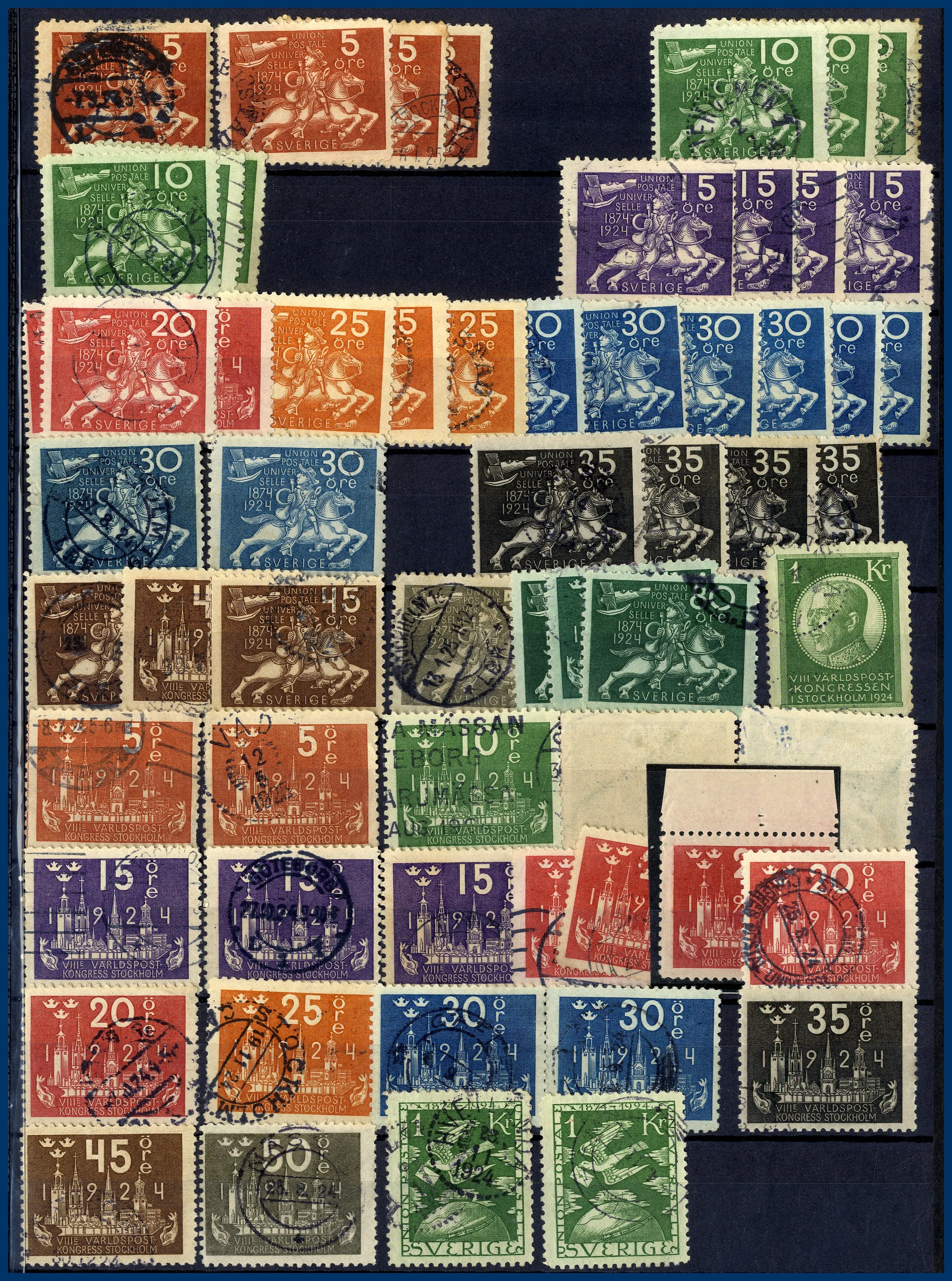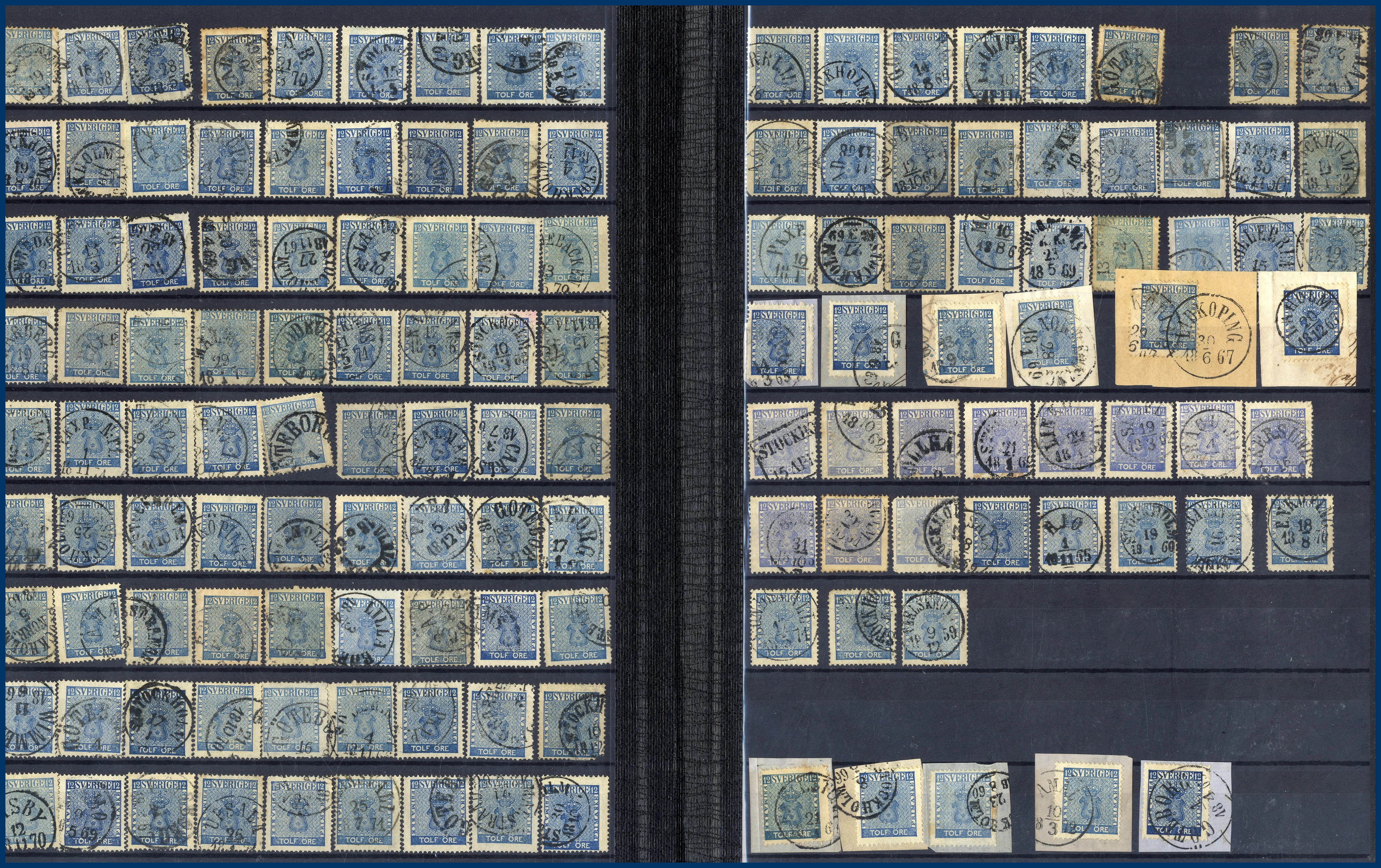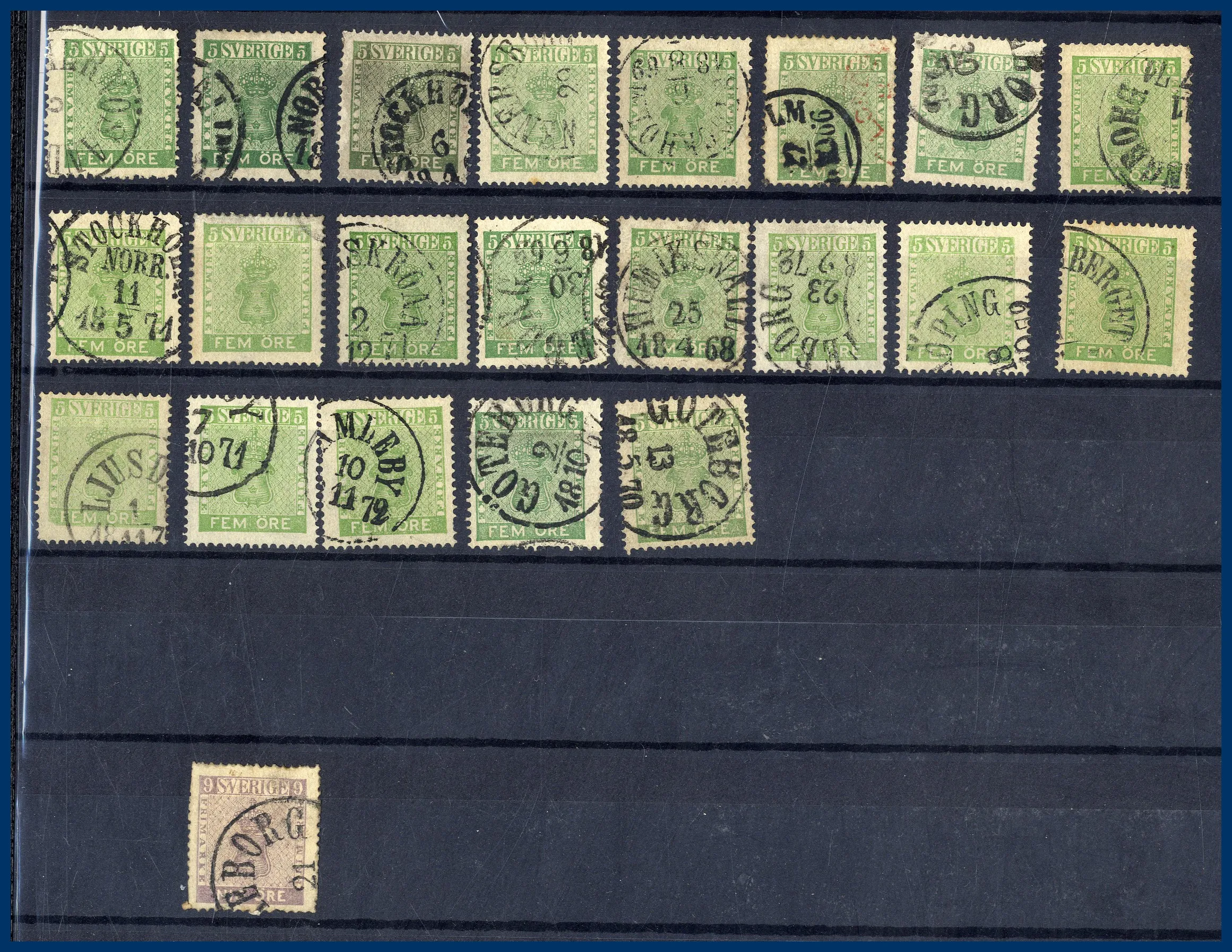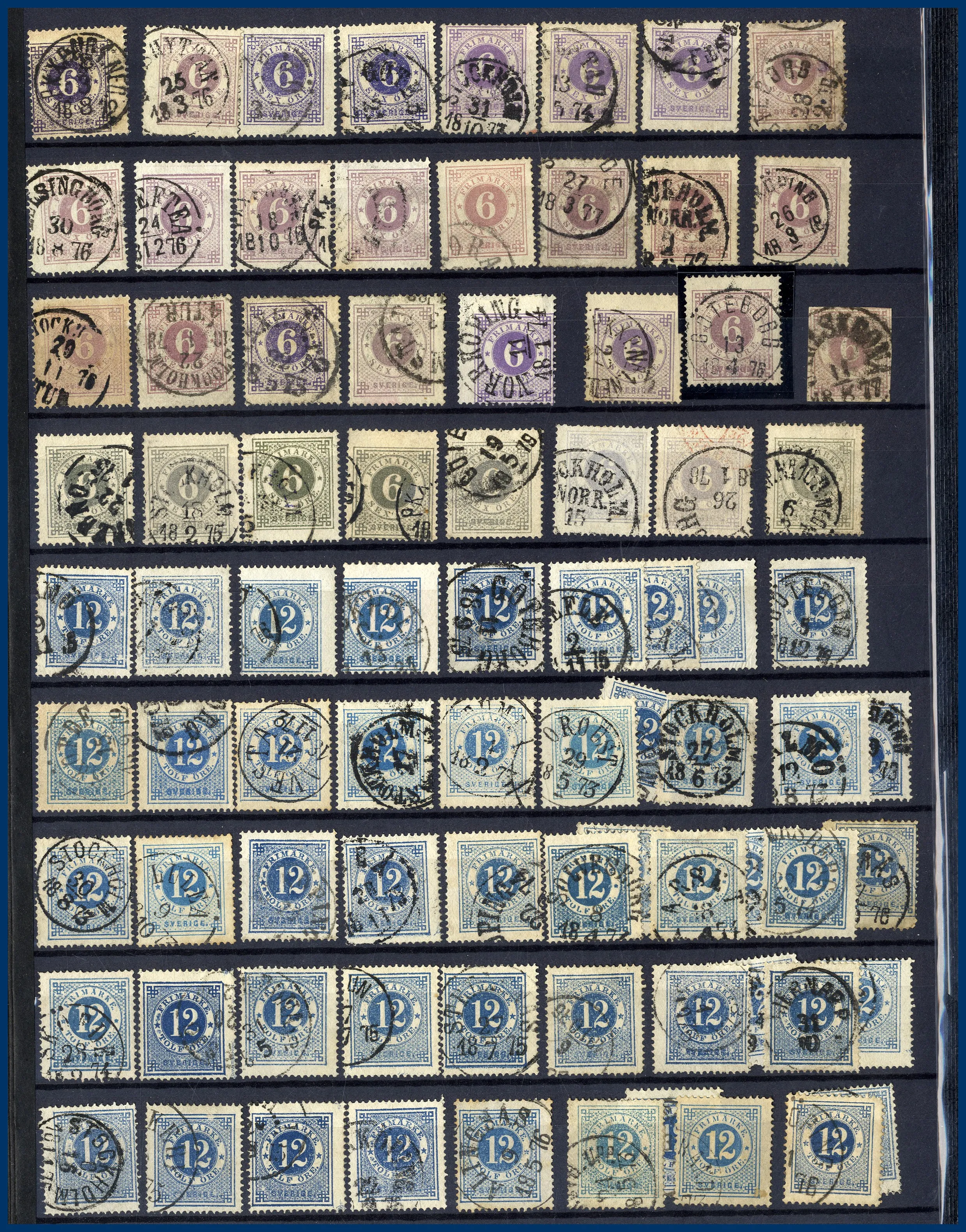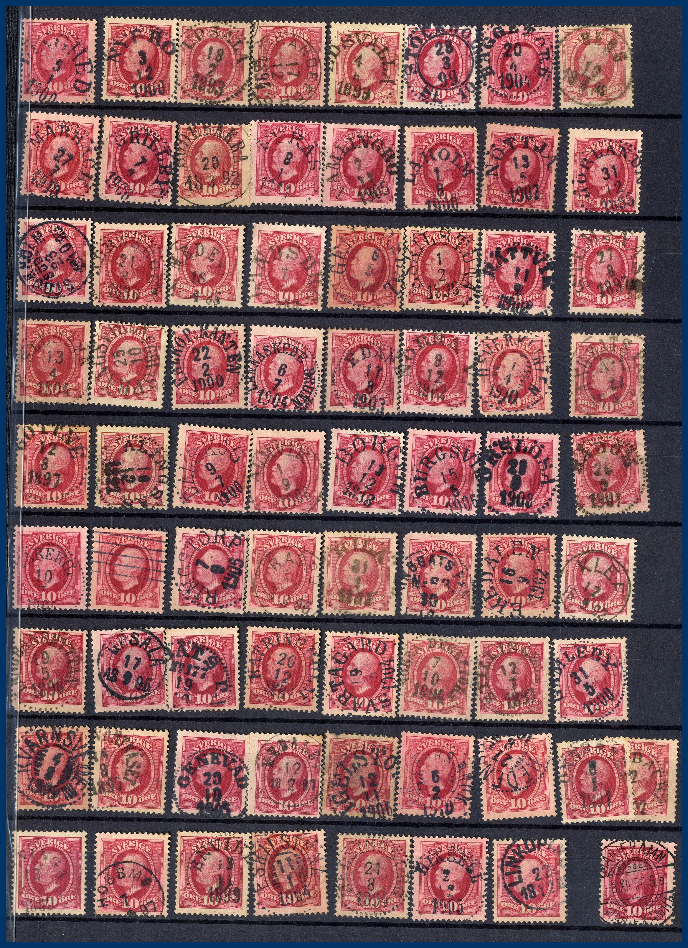insticksalbum. Fyrskillingar, Liggande lejon, Vapentyp, Ringtyp, Oscar II, Kongress/Förening, Posthus, BC-/CB-par samt lite bandmärken. Mestadels många exemplar av varje märke. En hel del vackra stämplar inemellan.