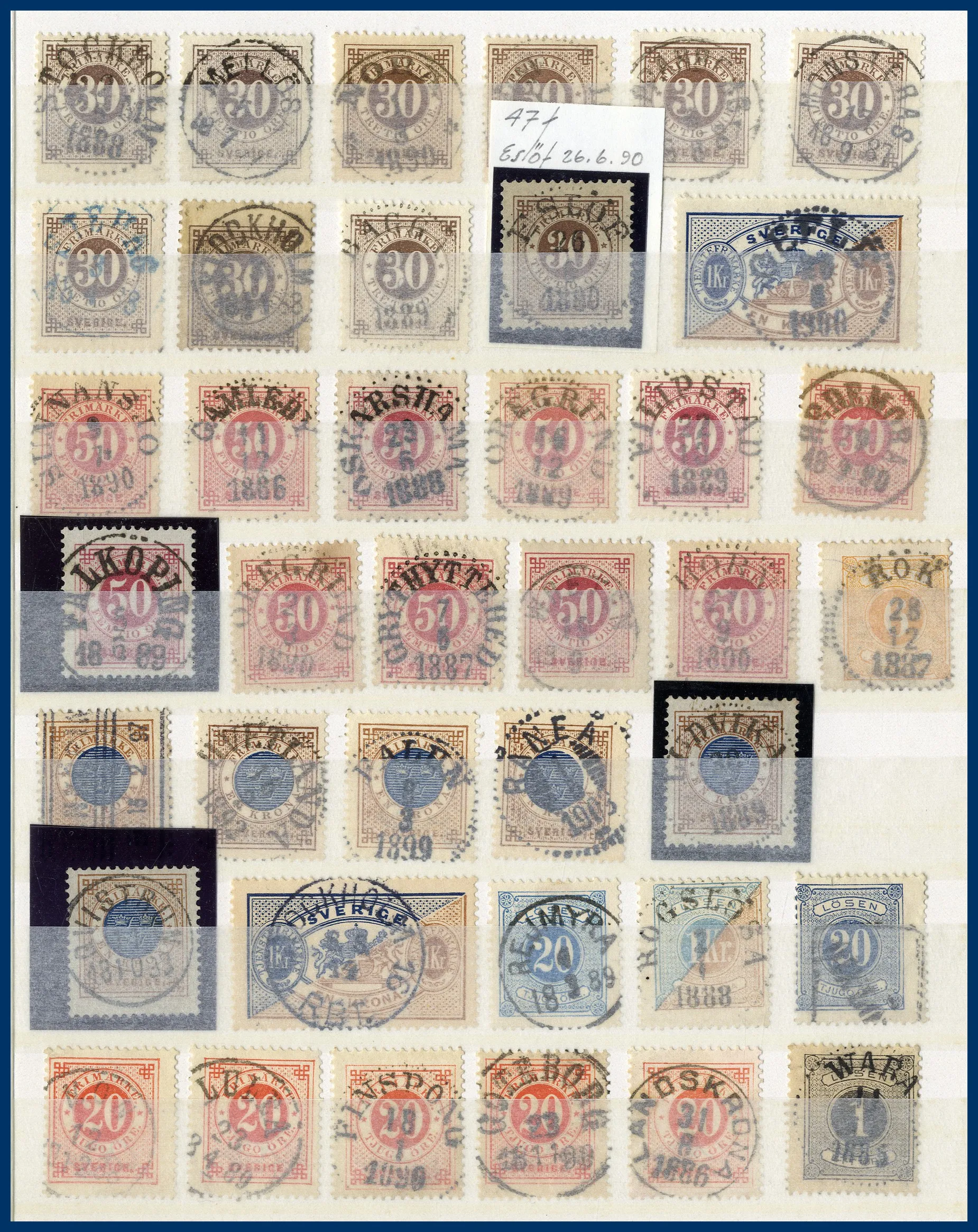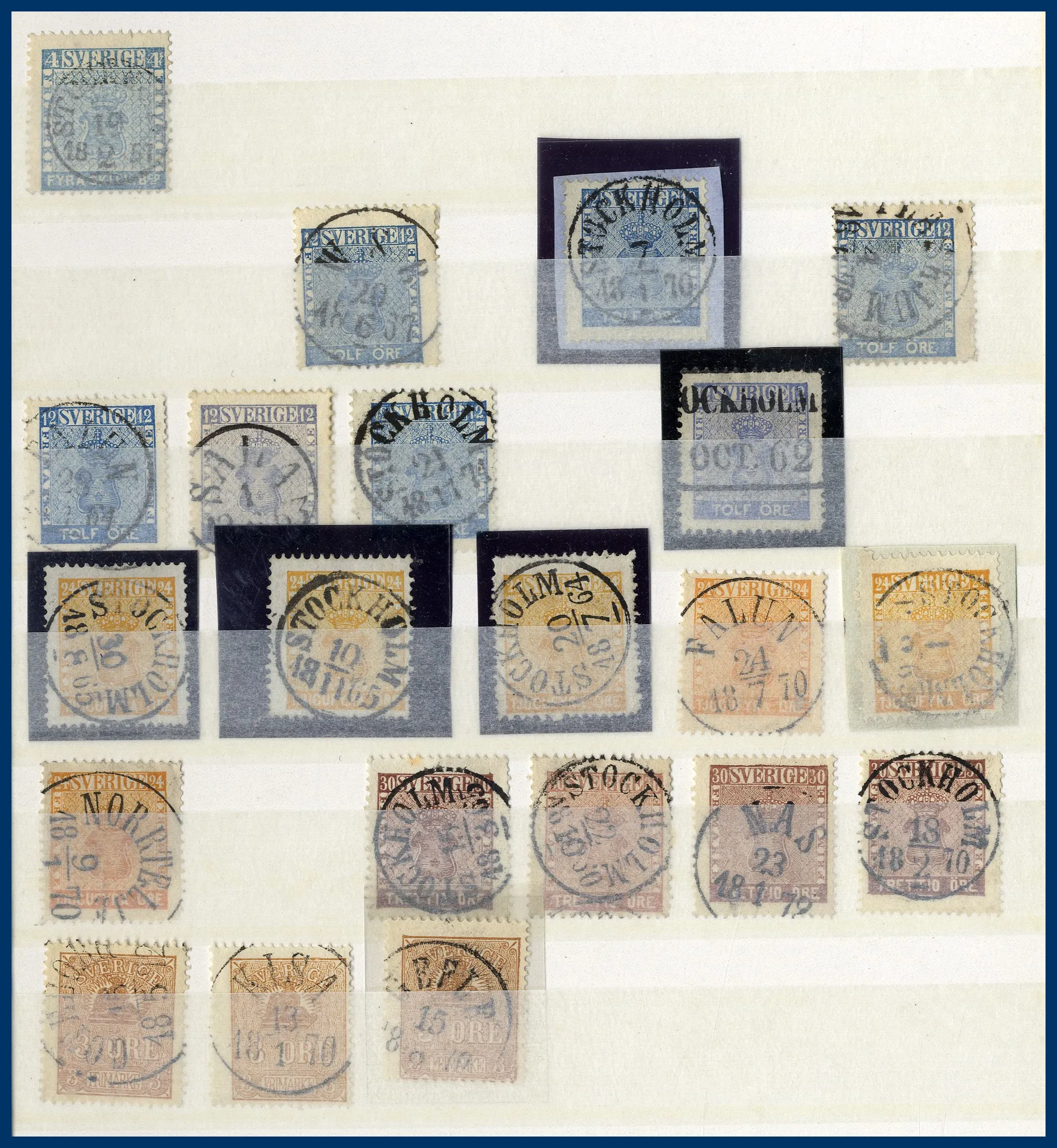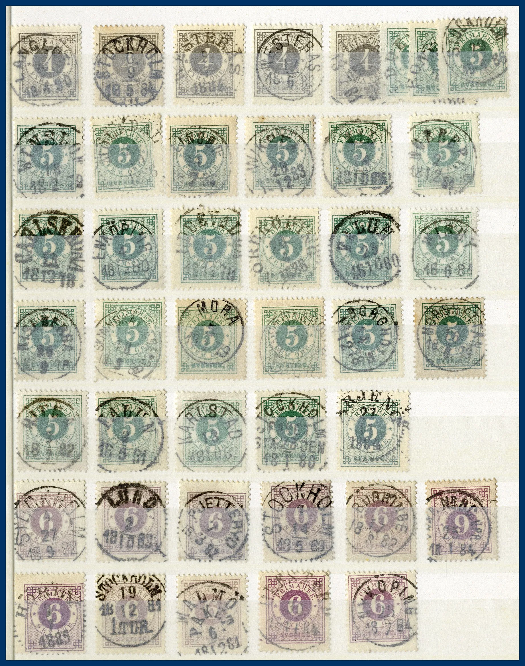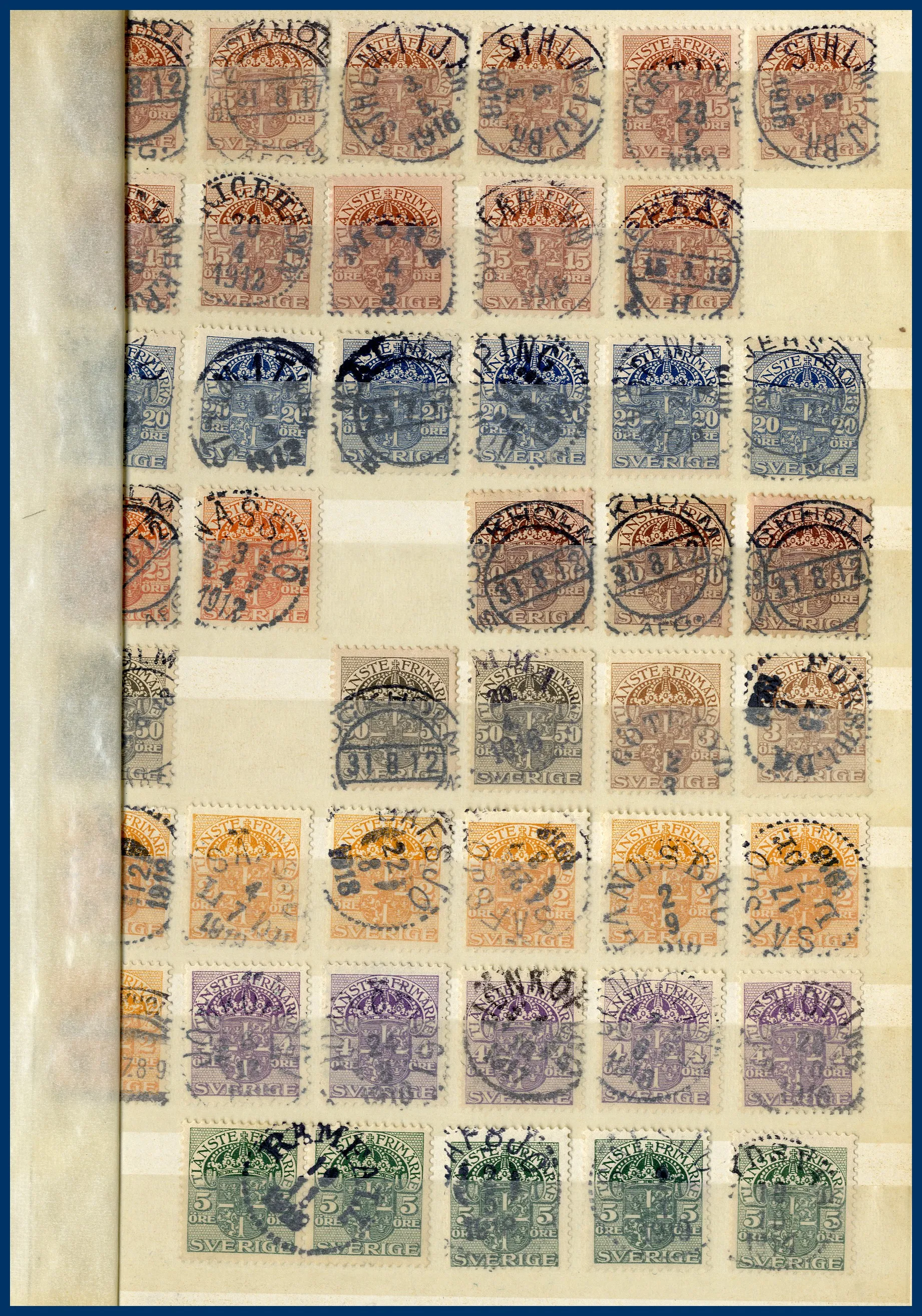 svenska stämplade märken. Börjar med en fyrskilling, några Vapen och Liggande lejon, flera med vackra stämplar. I övrigt är det mycket Ringtyp samt stora och små tjänstemärken, varav mycket stor andel vackert stämplade. Även lite Lösen och skyddsperforerade märken.
