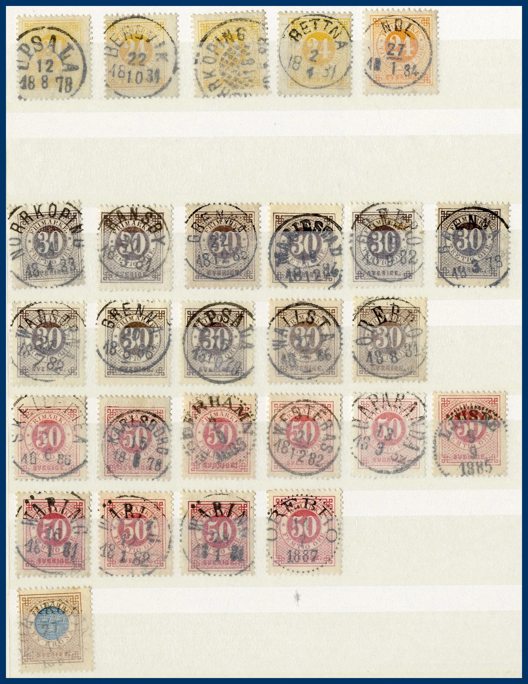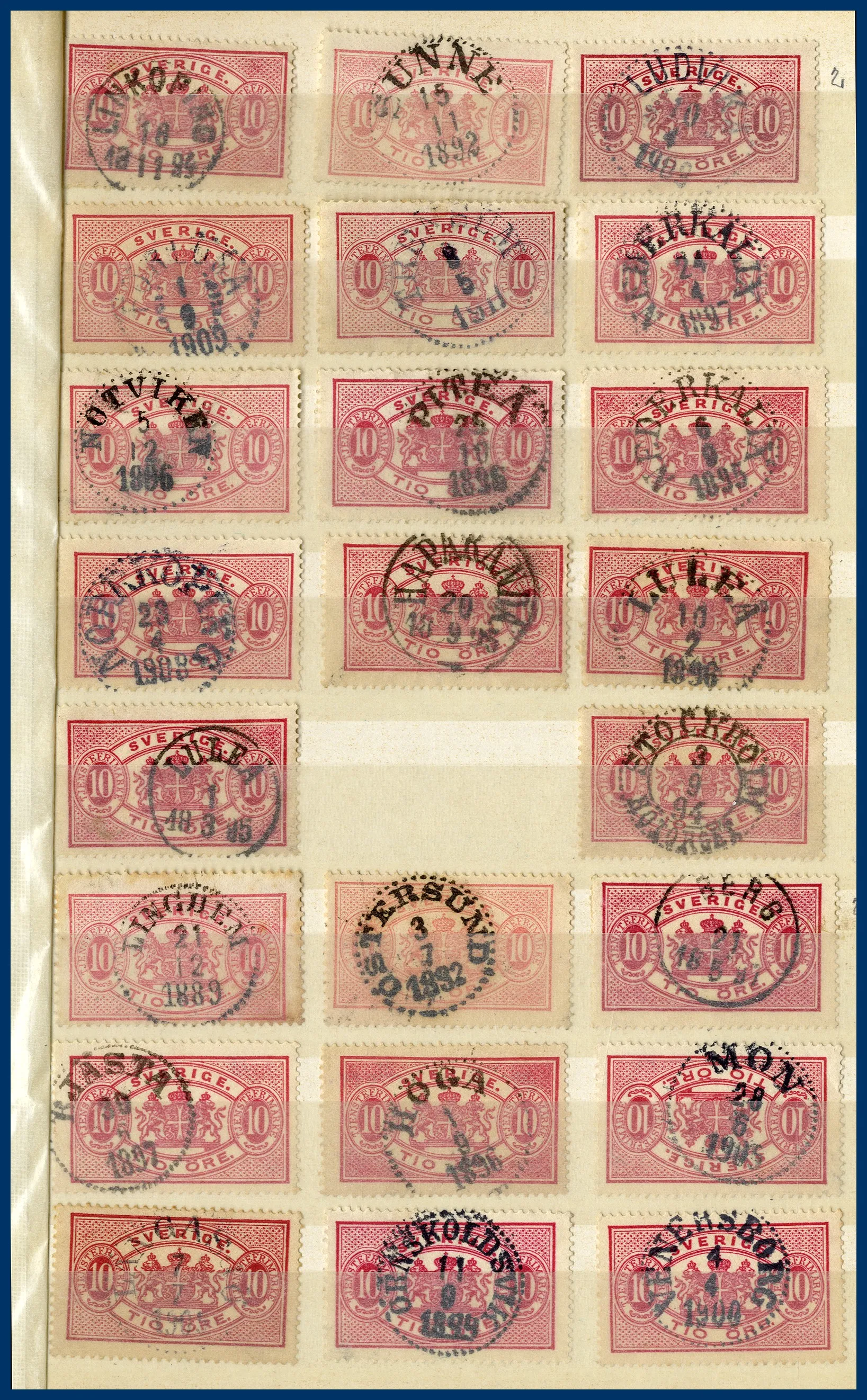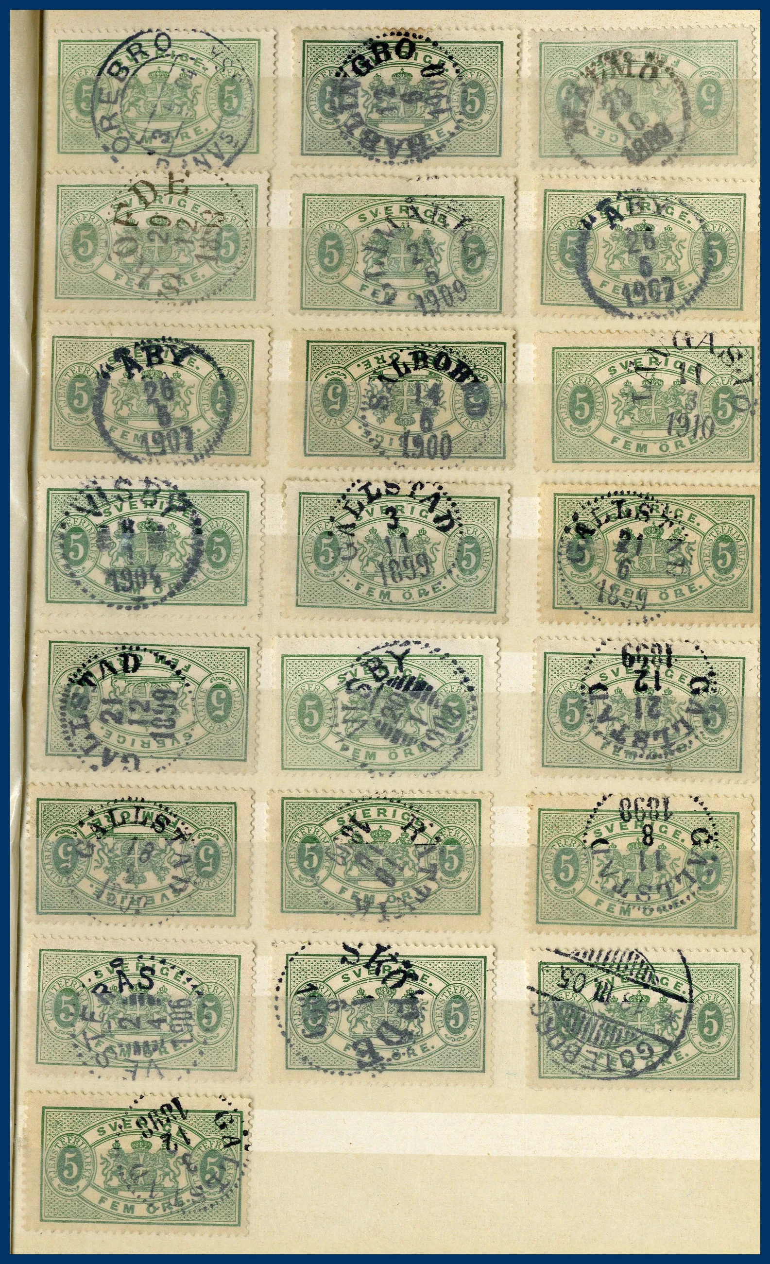 svenska stämplade märken. Börjar med en fyrskilling, några Vapen och Liggande lejon, flera med vackra stämplar. I övrigt är det mycket Ringtyp samt stora och små tjänstemärken, varav mycket stor andel vackert stämplade. Även lite Lösen och skyddsperforerade märken.