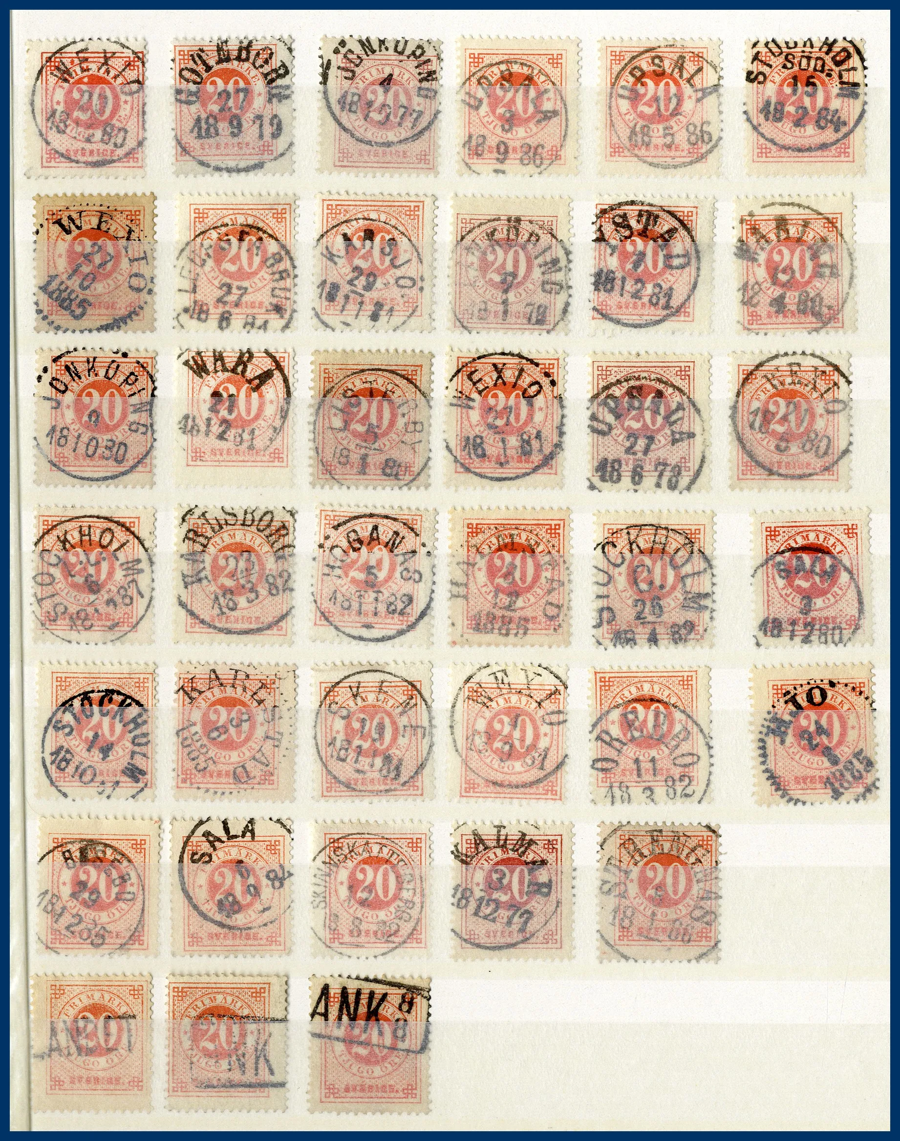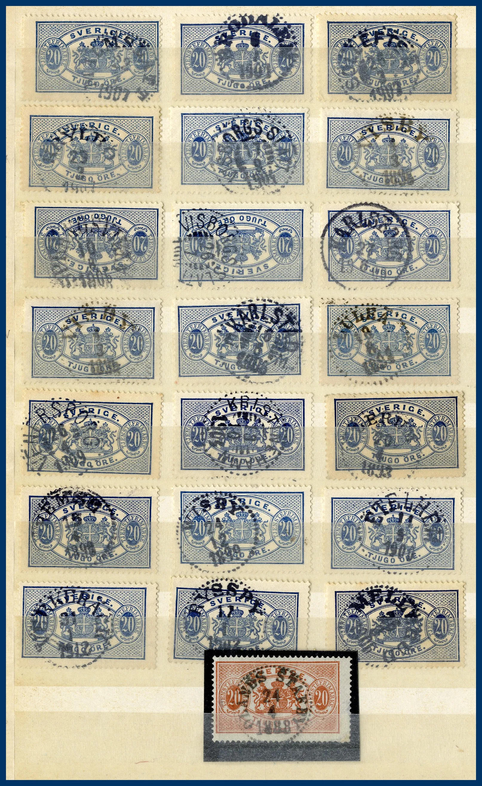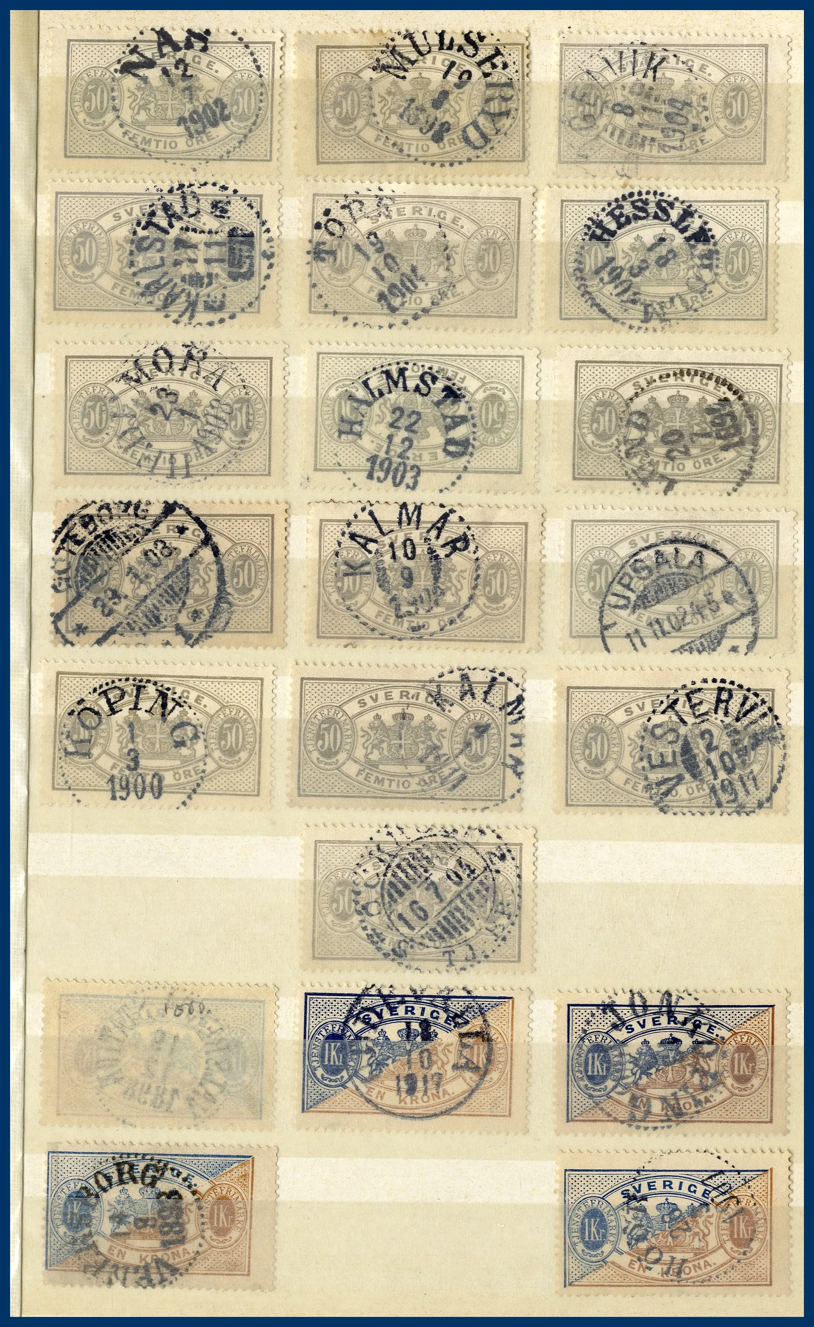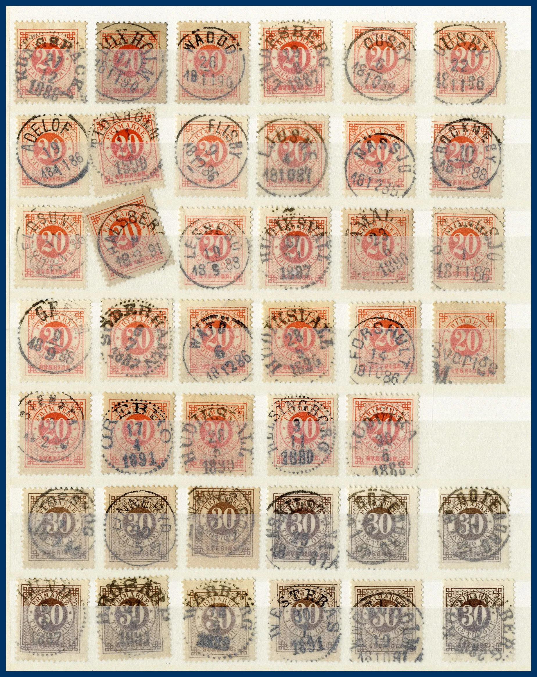 svenska stämplade märken. Börjar med en fyrskilling, några Vapen och Liggande lejon, flera med vackra stämplar. I övrigt är det mycket Ringtyp samt stora och små tjänstemärken, varav mycket stor andel vackert stämplade. Även lite Lösen och skyddsperforerade märken.