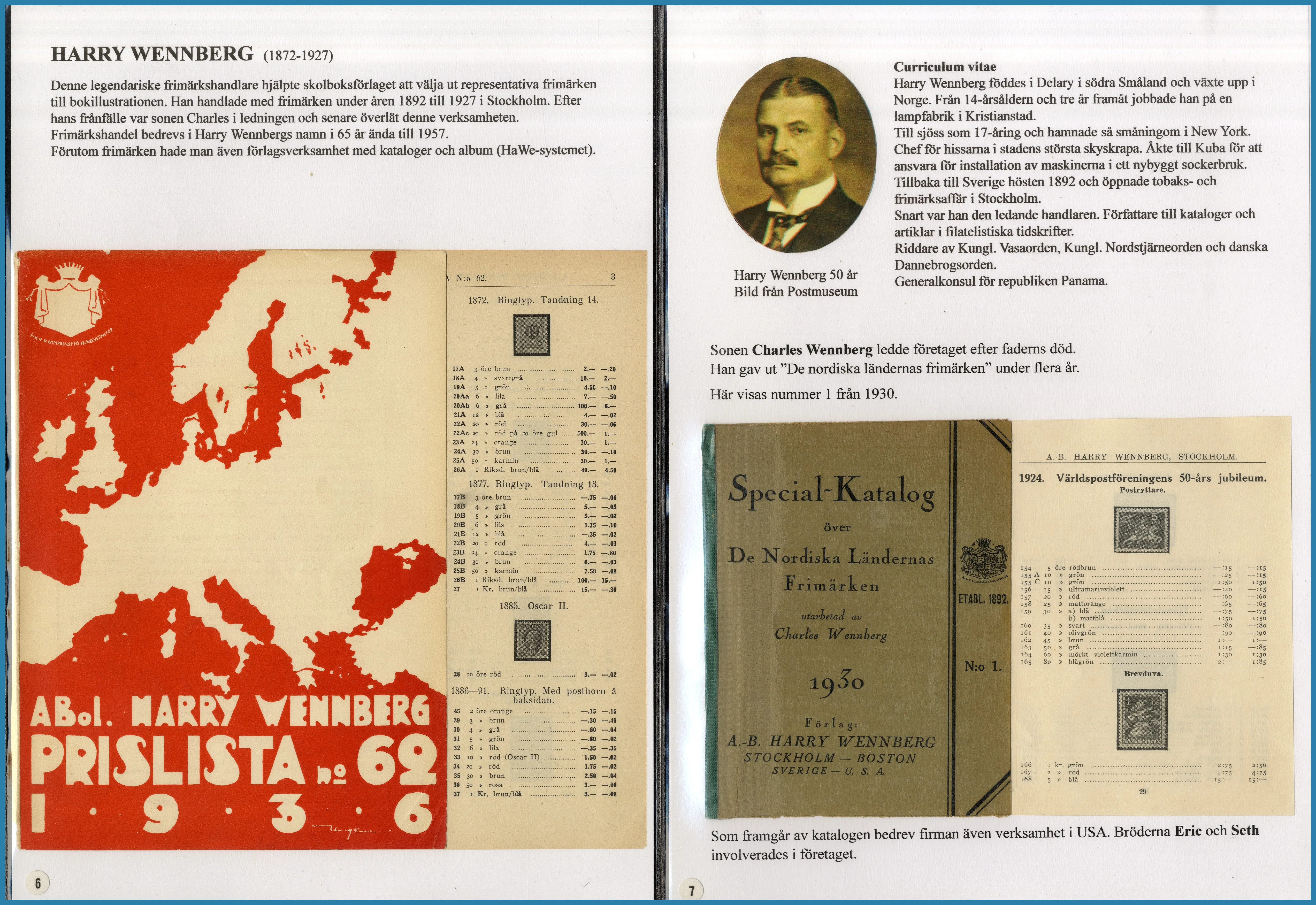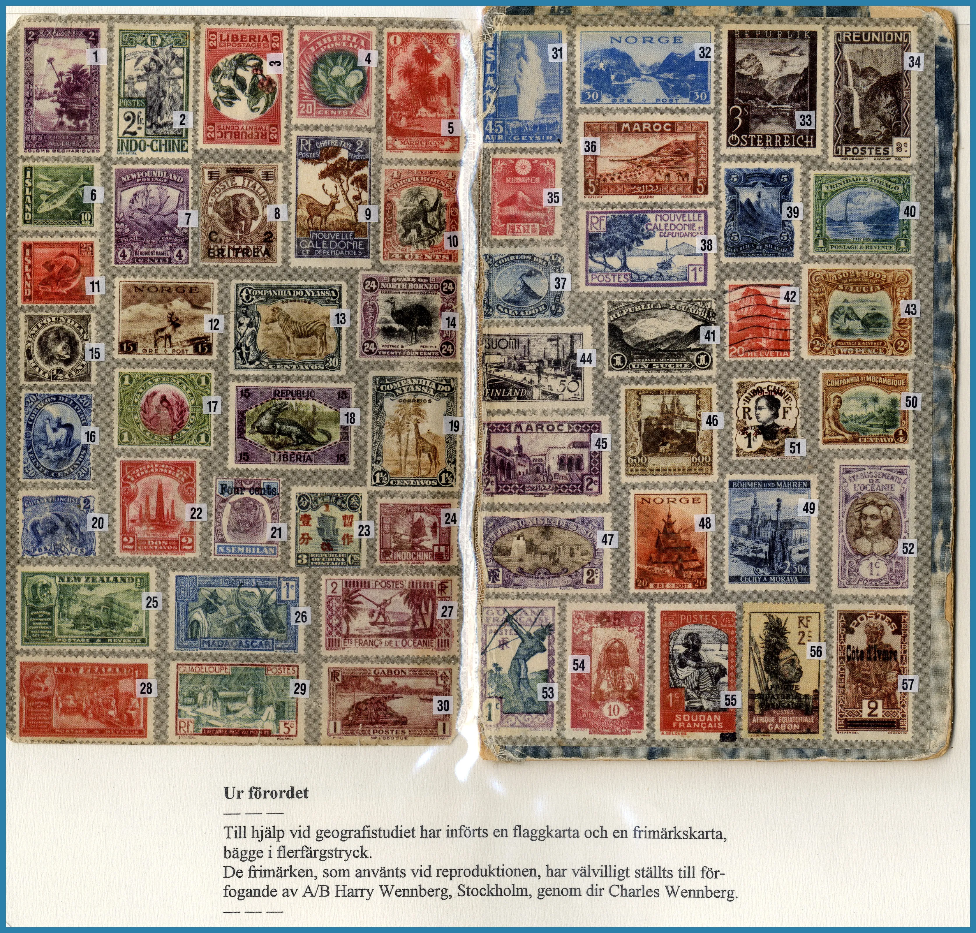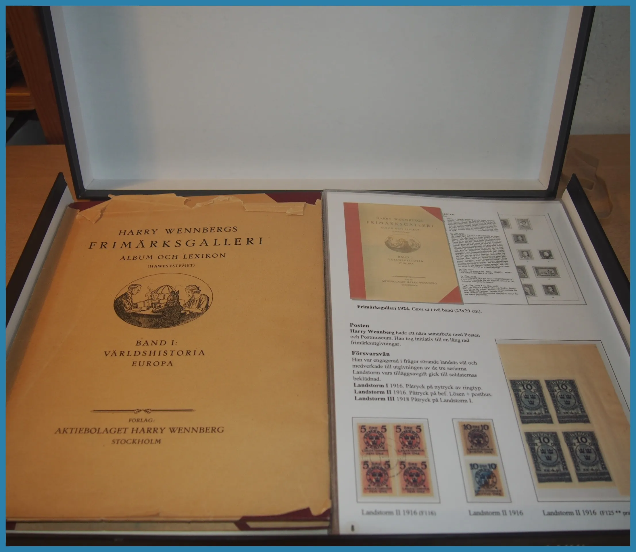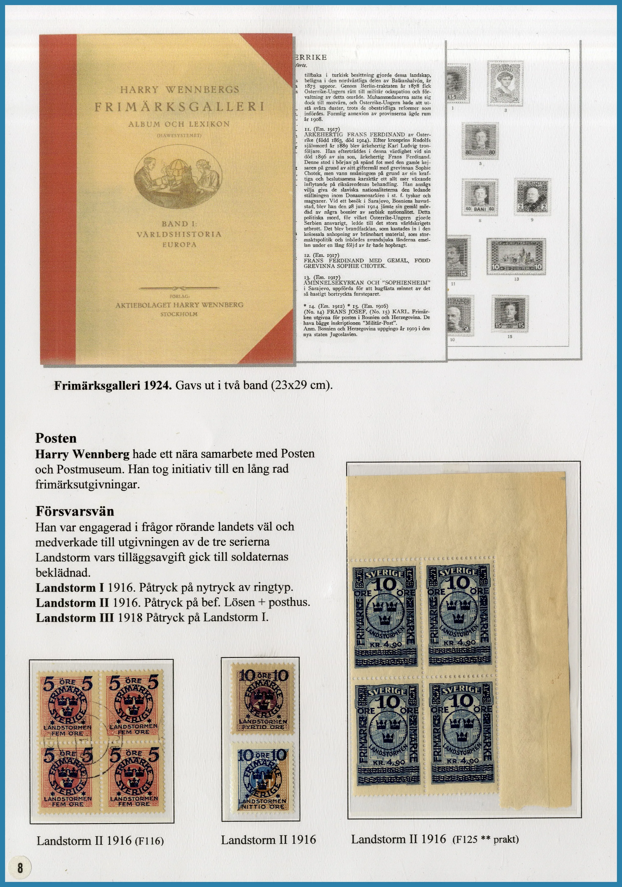 på 6 ramar, här säljs ram 1 plus extramaterial på totalt 25 blad som berättar historien om Frimärkshandlaren Harry Wennberg och hans utgivning av boken geografiboken "Frimärksgalleri" (medföljer) som är den röda tråden i samlingen. Frimärken från Hela världen **/*/O med bla bra Japan samt Landstorm II med F.121 **, F.124 ** samt F.125 ** fyrblock med arkmarginal av 5 kr Posthuset i Praktkvalitet.