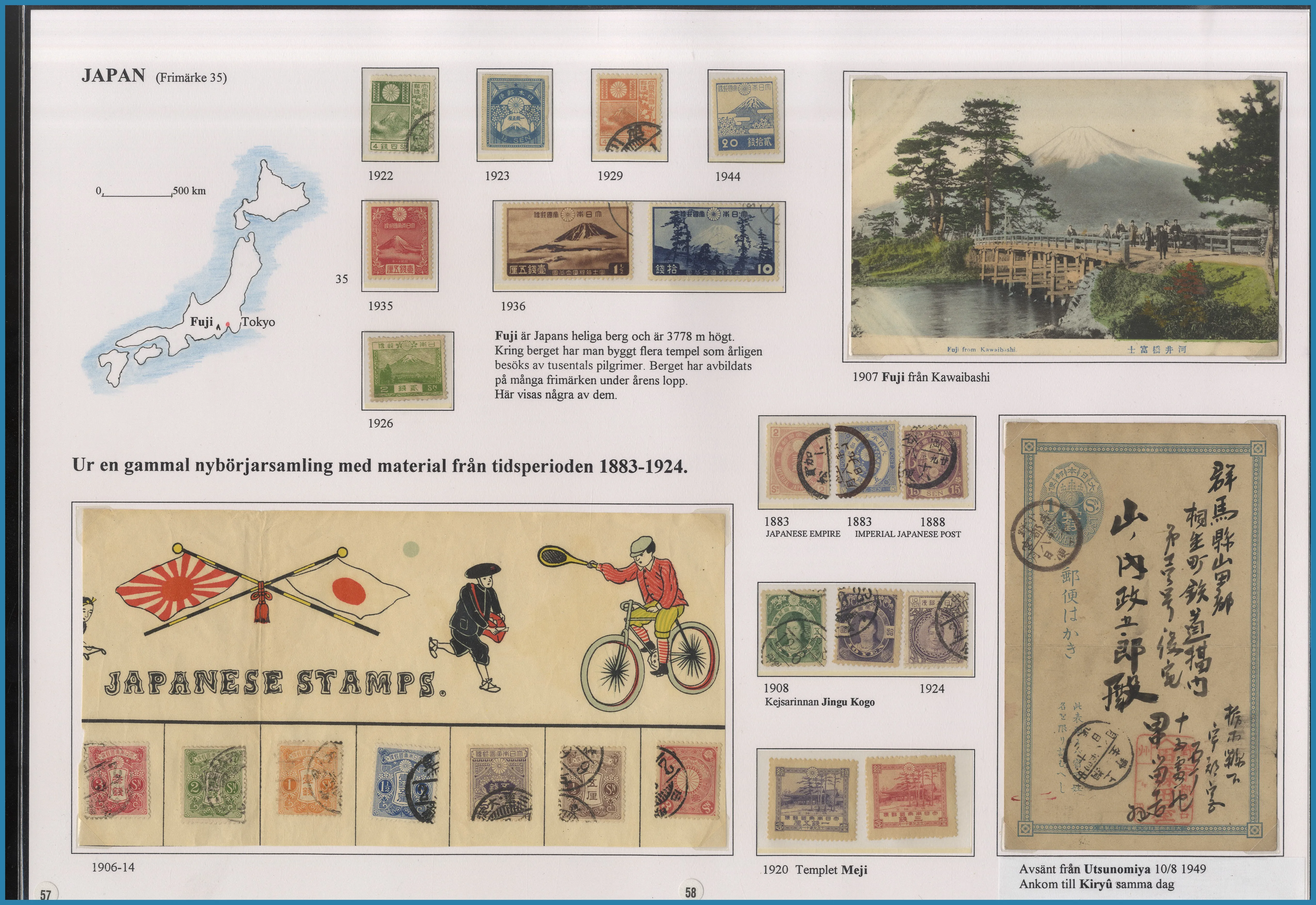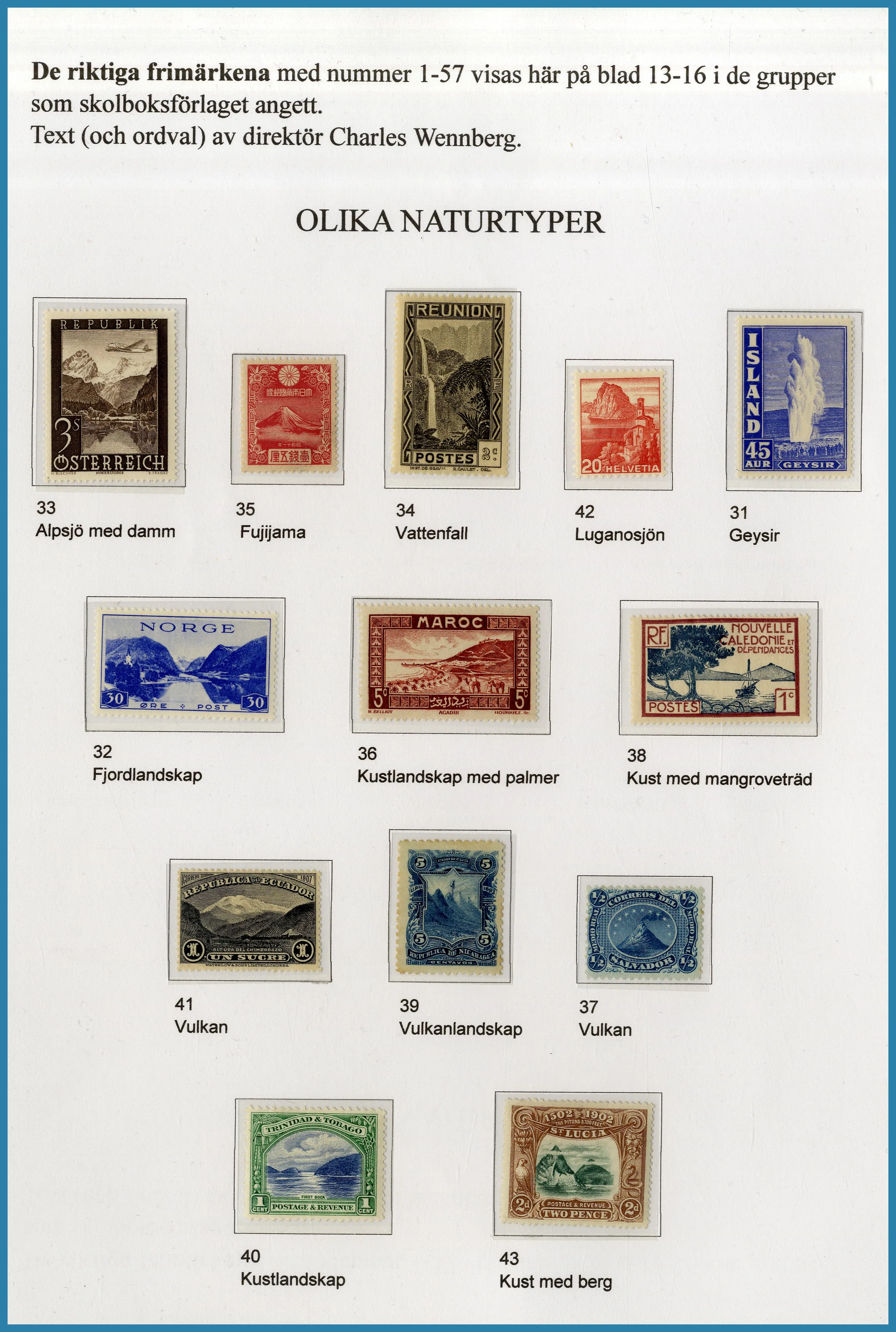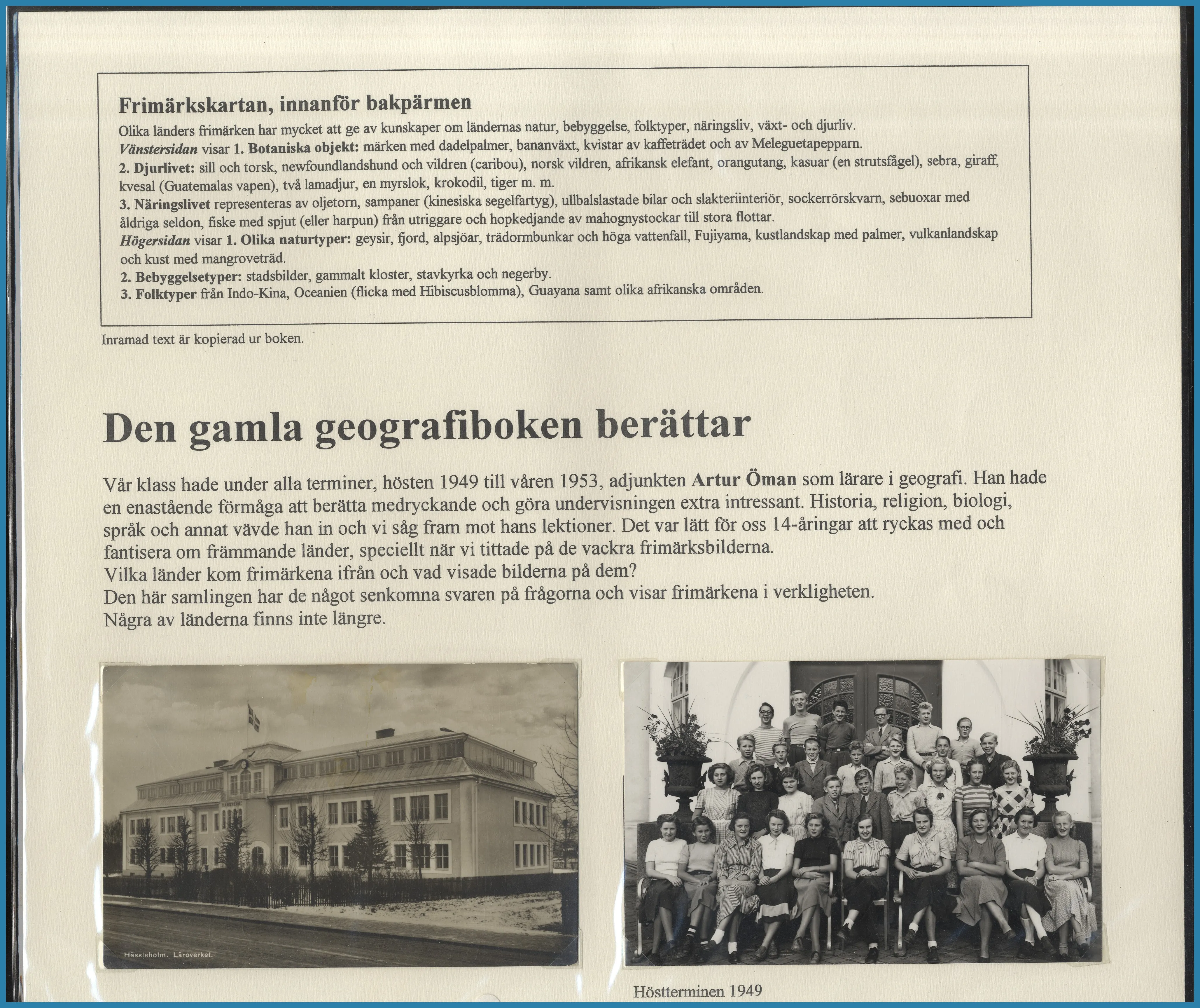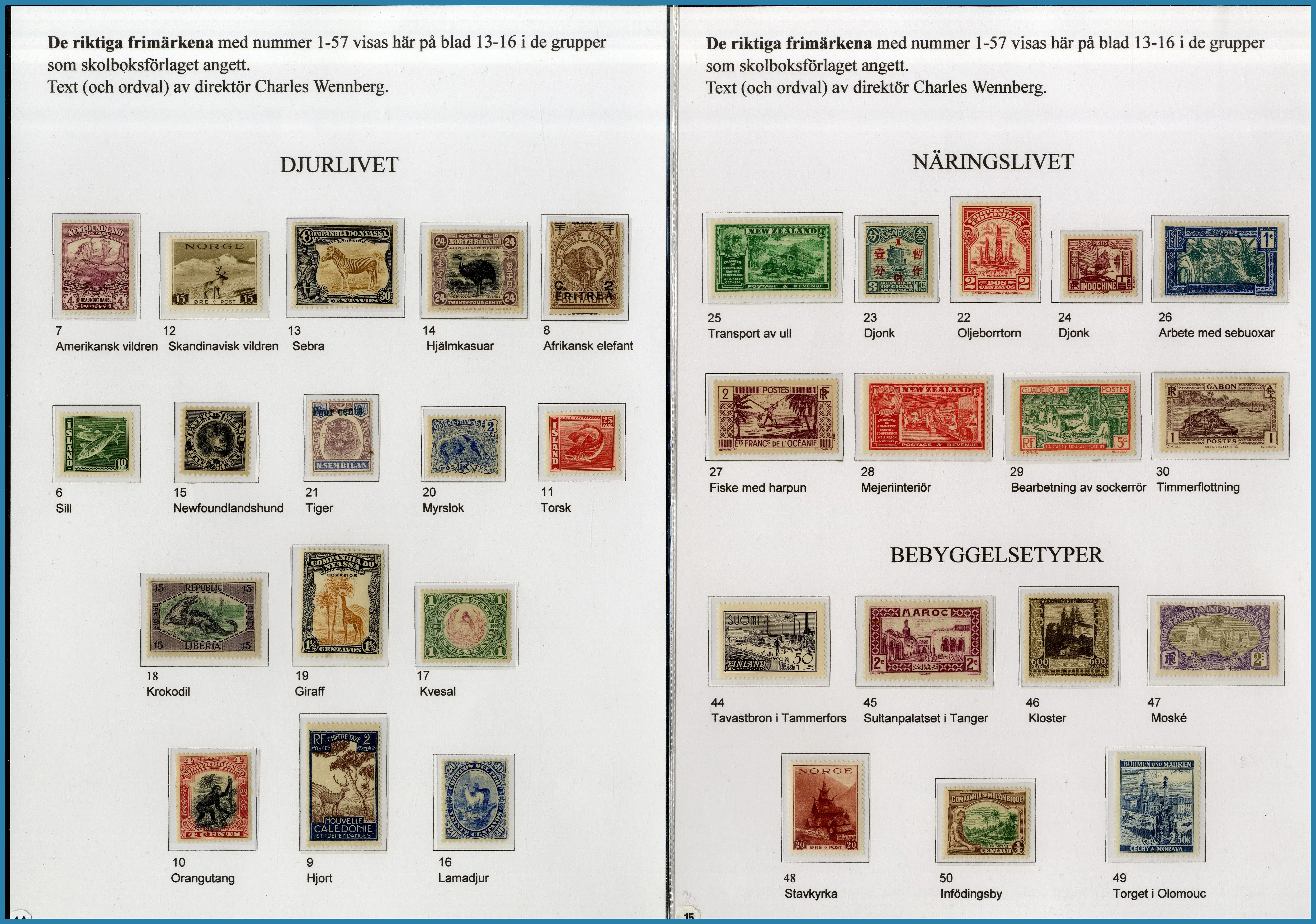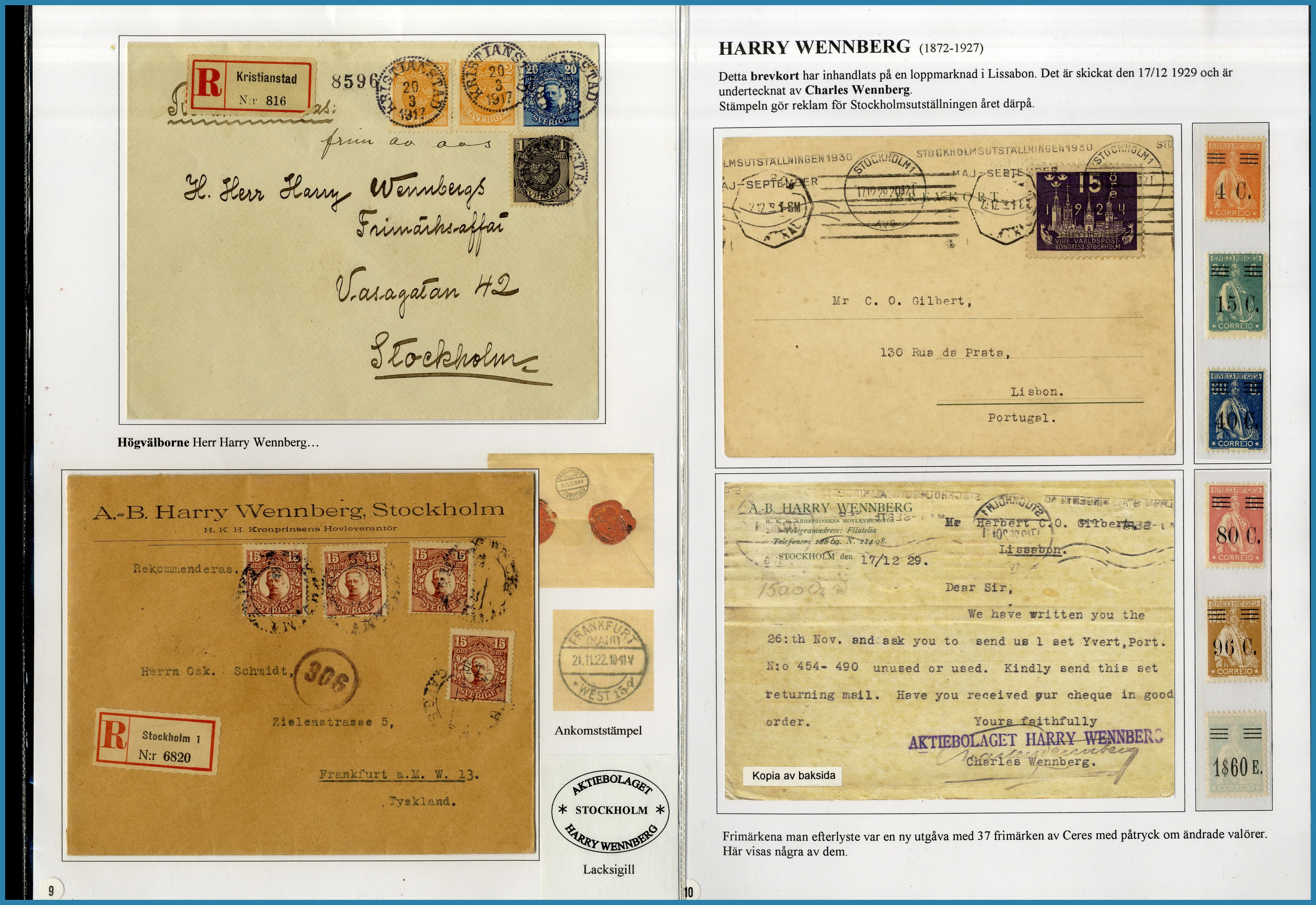 på 6 ramar, här säljs ram 1 plus extramaterial på totalt 25 blad som berättar historien om Frimärkshandlaren Harry Wennberg och hans utgivning av boken geografiboken "Frimärksgalleri" (medföljer) som är den röda tråden i samlingen. Frimärken från Hela världen **/*/O med bla bra Japan samt Landstorm II med F.121 **, F.124 ** samt F.125 ** fyrblock med arkmarginal av 5 kr Posthuset i Praktkvalitet.