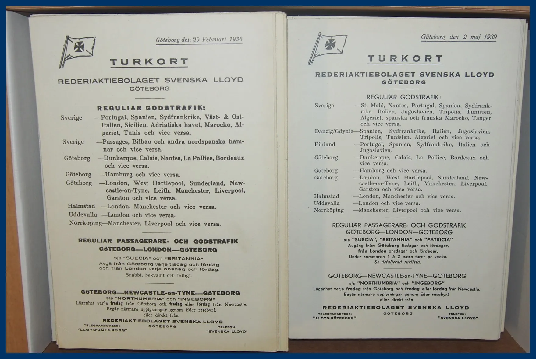 i Göteborg med datum för avgång och ankomst. Daterade listor från 1929 (2 st), 1931 (2 st), 1932 (16 st), 1933 (21 st), 1935 (25 st), 1936 (21 st), 1937 (20 st), 1938 (24 st), 1939 (17 st) och 1946 (17 st). Intressant posthistoria.