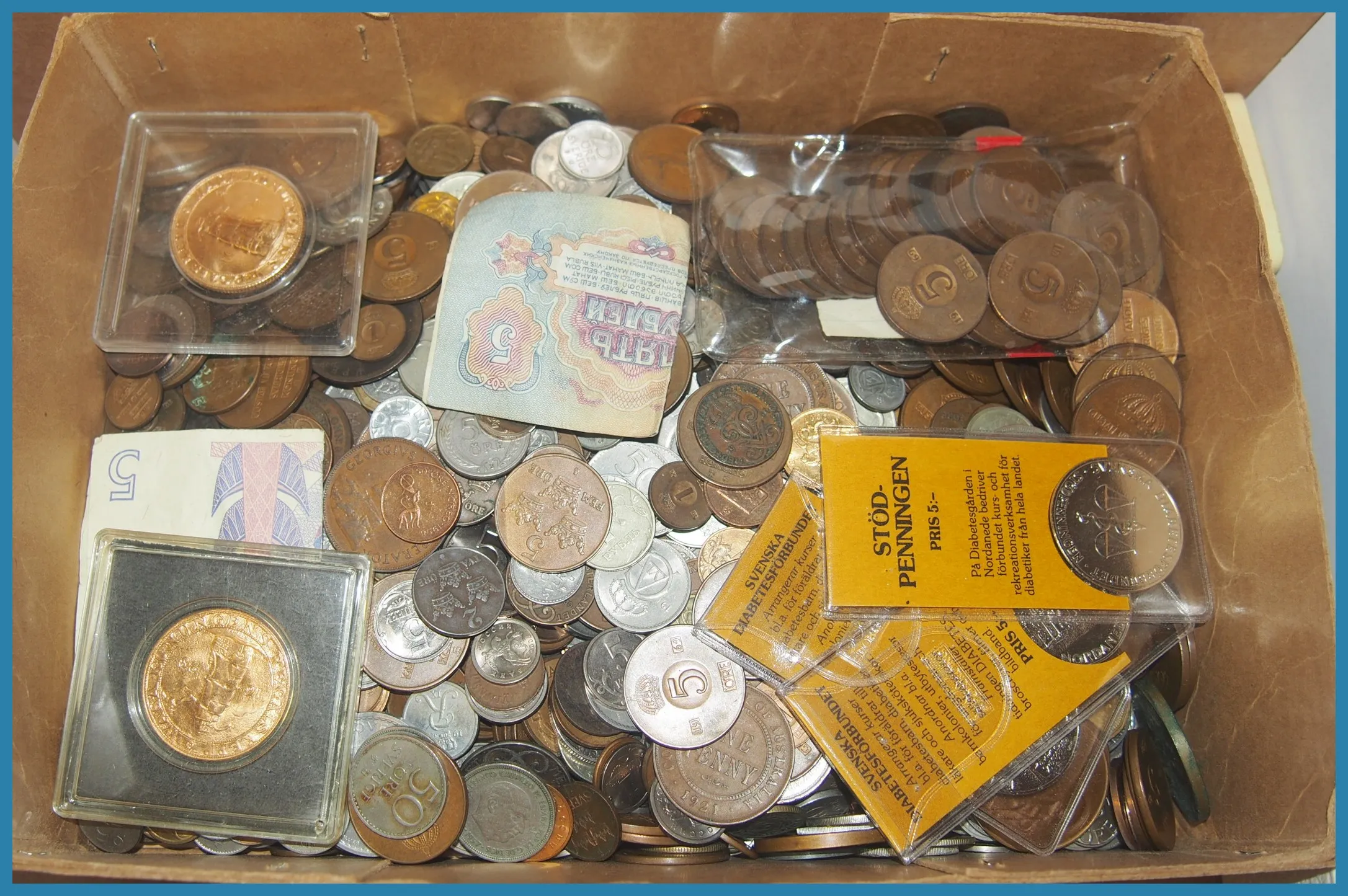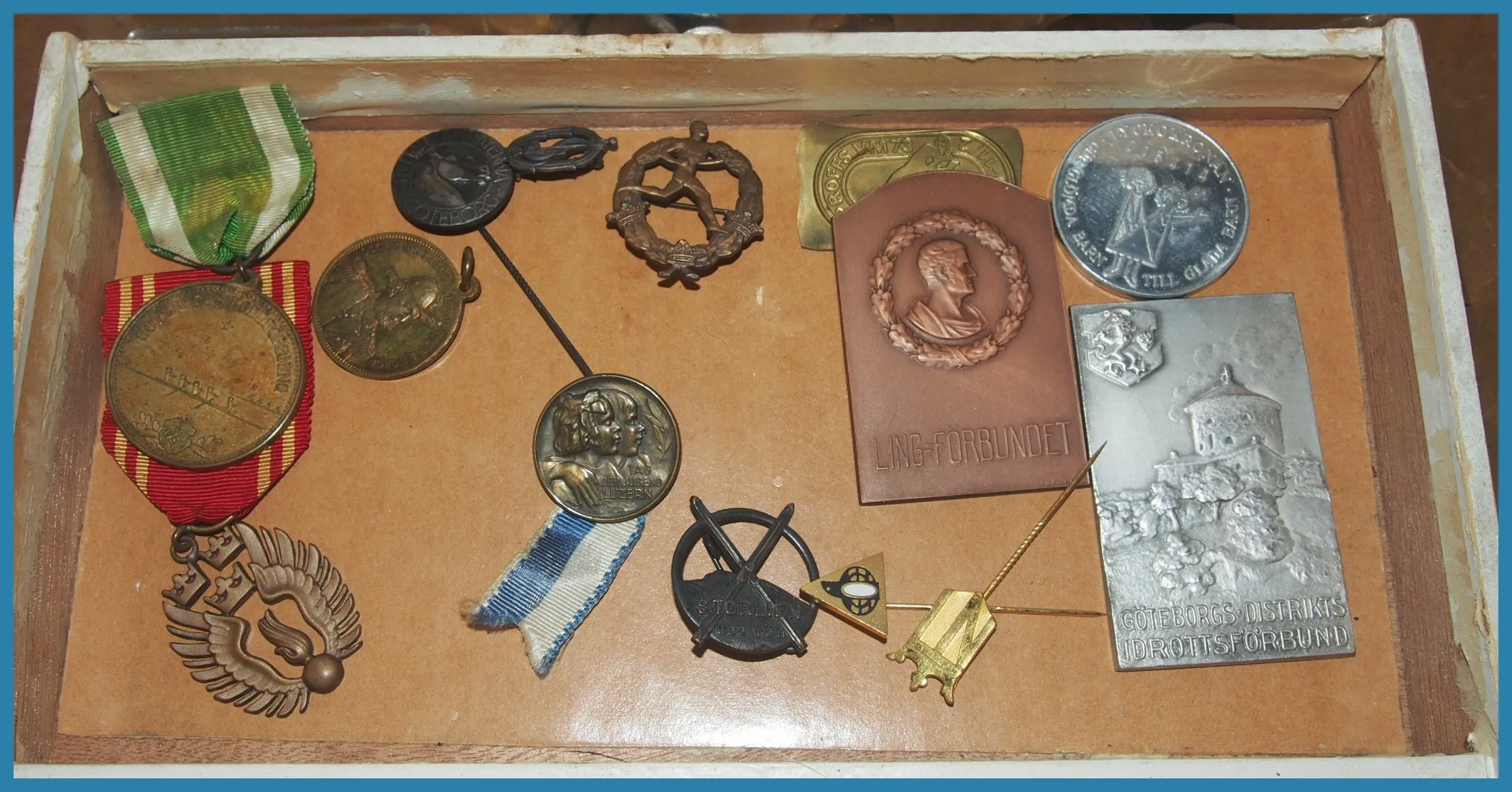 Sverige. 2 brickor med diverse idrottspins och medaljer samt diverse äldre bronsmynt samt 4 vackra medaljer i askar, även minnes"peng" tillverkad av skrovet från Pansarbåten Sverige.