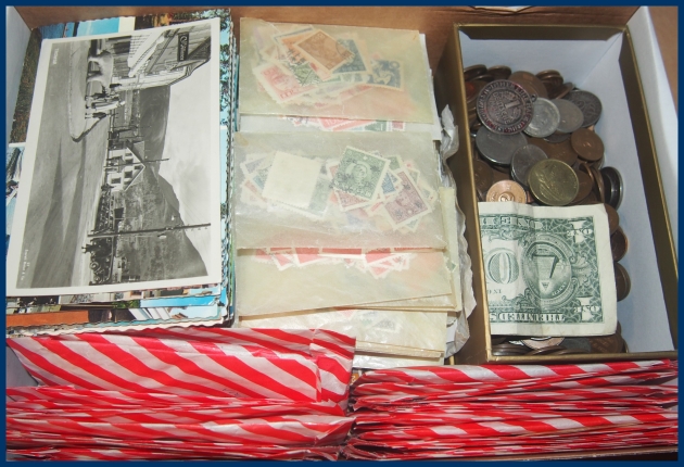 555. (E) Låda Hela världen med frimärken, mynt och vykort,
