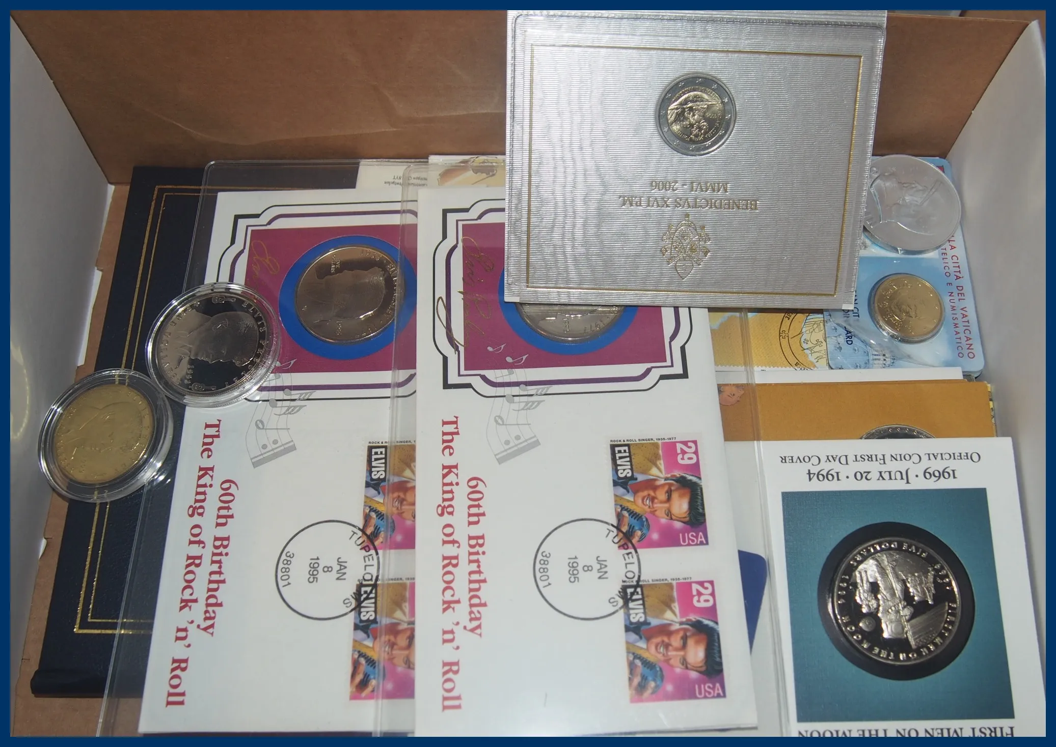 Bla Elvis Presley FDC + ingot begränsad upplaga med medalj i silver med guldplätering samt 2 olika Elvis mynt 5+10 $ från Marshallöarna, Frankrike frimärke €5 i silver, 10 st olika myntbrev från olika länder, några Euromynt, Gagarin 1981.