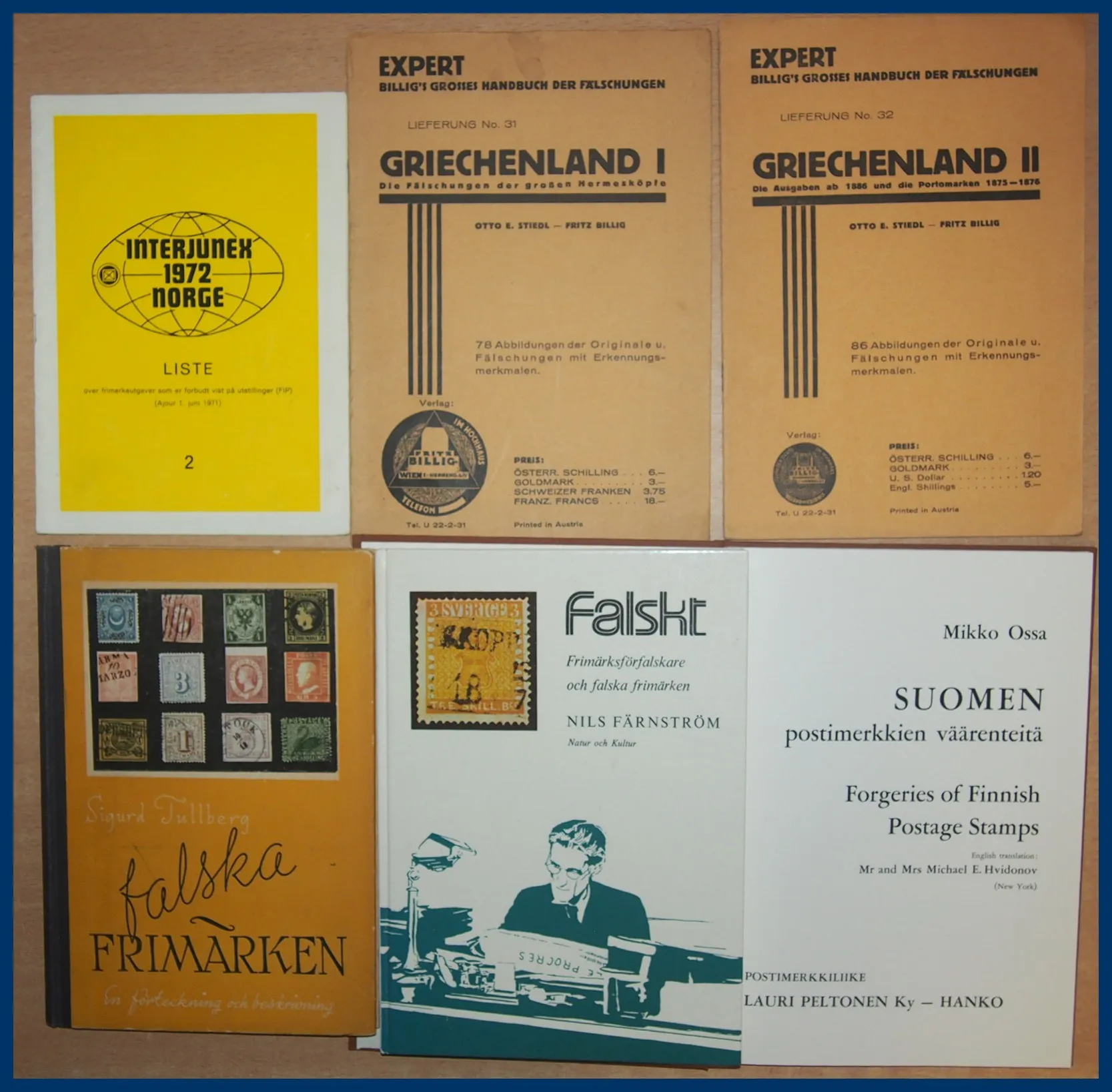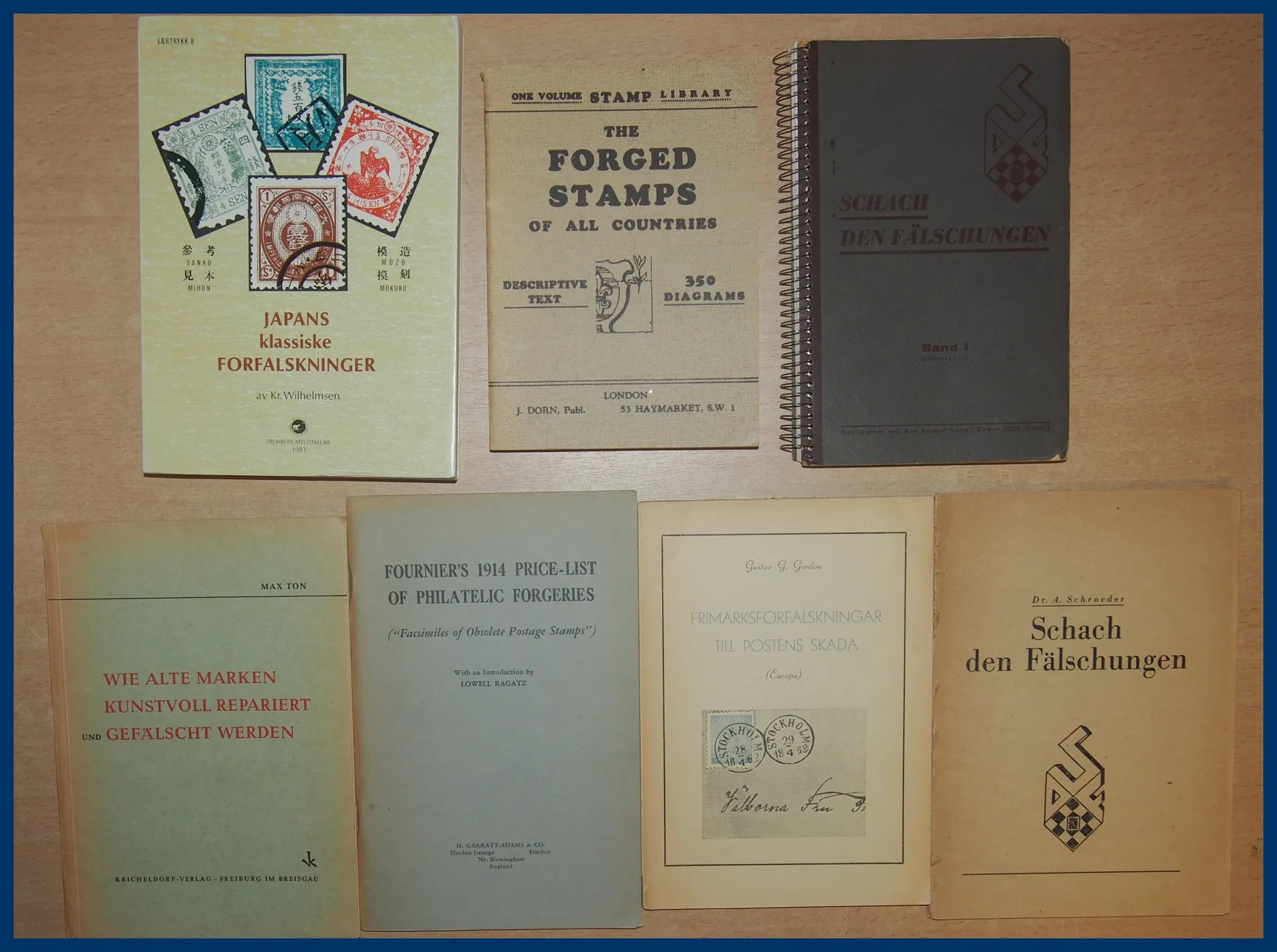 472. (E) Lot med 19 st olika titlar om förfalskade frimärken.