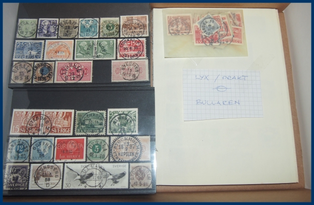 413. (E) Lot med ca 700 st ortsstämplar på visirkort, Vapentyp-