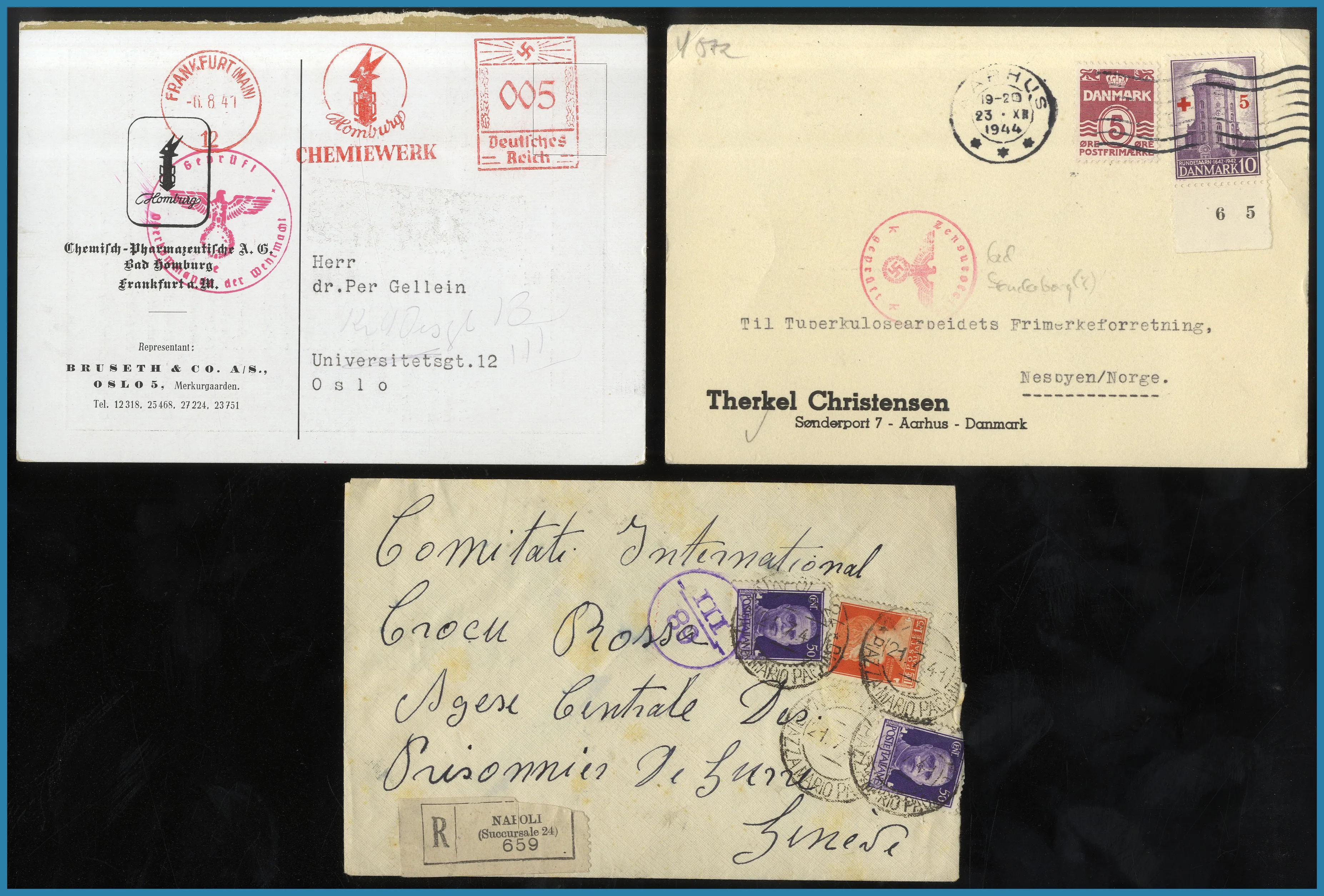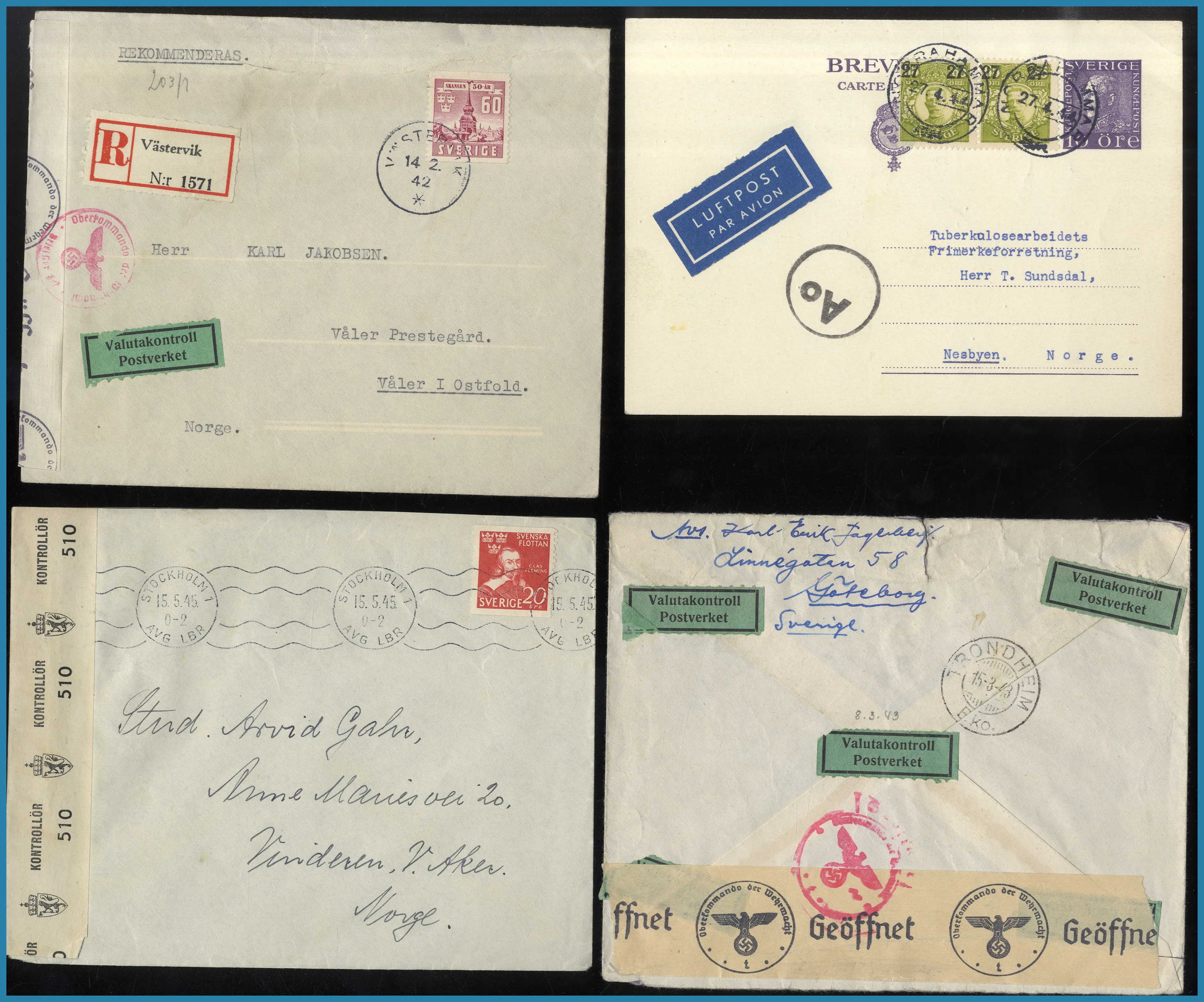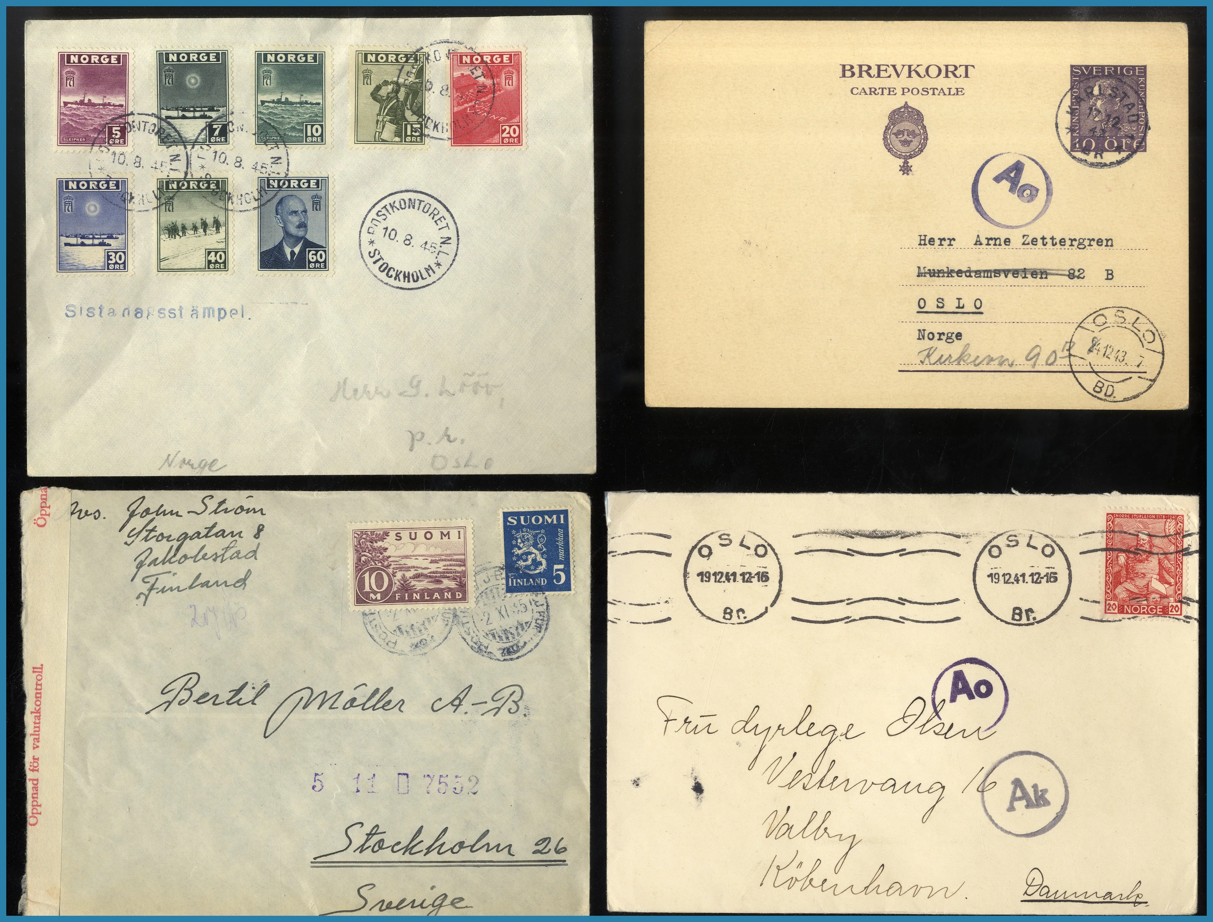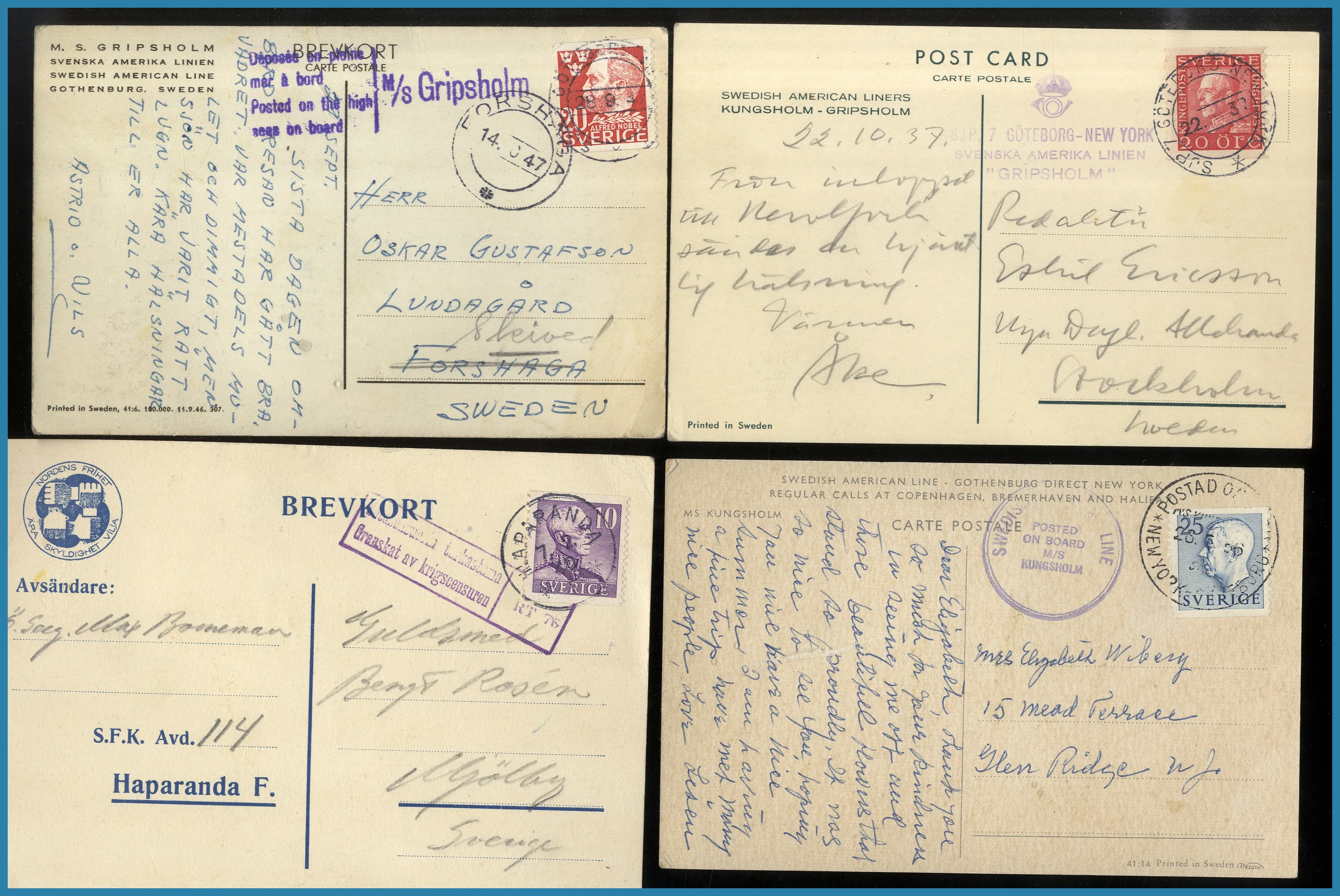 Mycket Norge, Sverige samt något Finland och resten av världen med några FDC Indien. Mycket censur 2:a Världskriget och flera trevliga båtstämplar på vykort av S/S Patricia, M/S Kungsholm, Gripsholm och Drottningholm etc.