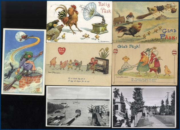 vykort av gamla formatet från mellersta och norra Sverige, ovanpå dessa ca 230 st äldre God Helg-kort av gamla formatet.