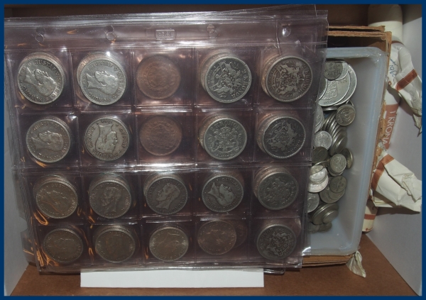 1 kr -1942 (40 st), 1 kr -1968 (44 st), 5 kr (19 st), 50 öre nyare (21 st), 25 öre nyare (23 st) samt 10 öre (75 st). I botten av lådan även ca 6 kg blandade mest svenska mynt samt kuvert med några 5/10 kr sedlar (80 kr).