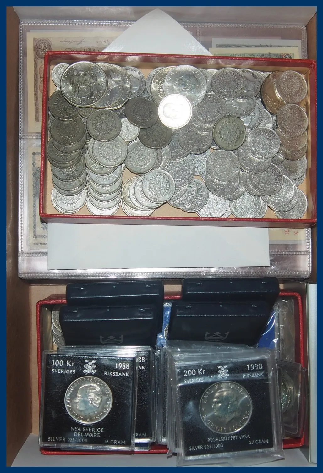 5 kr (4 st), 2 kr -40 (9 st), 2 kr -66 (3 st) 1 kr -40 (90 st), 1 kr -67 (30 st), 50 öre äldre (13 st), 50 öre -61 (1 st), 25 öre äldre (29 st), 10 öre (11 st) samt 7 st utländska silvermynt och albumblad med svenska och utländska sedlar, Nominal Sverige 1.095 kr med 9 st 100-lappar. Totalt ca 4 kg.