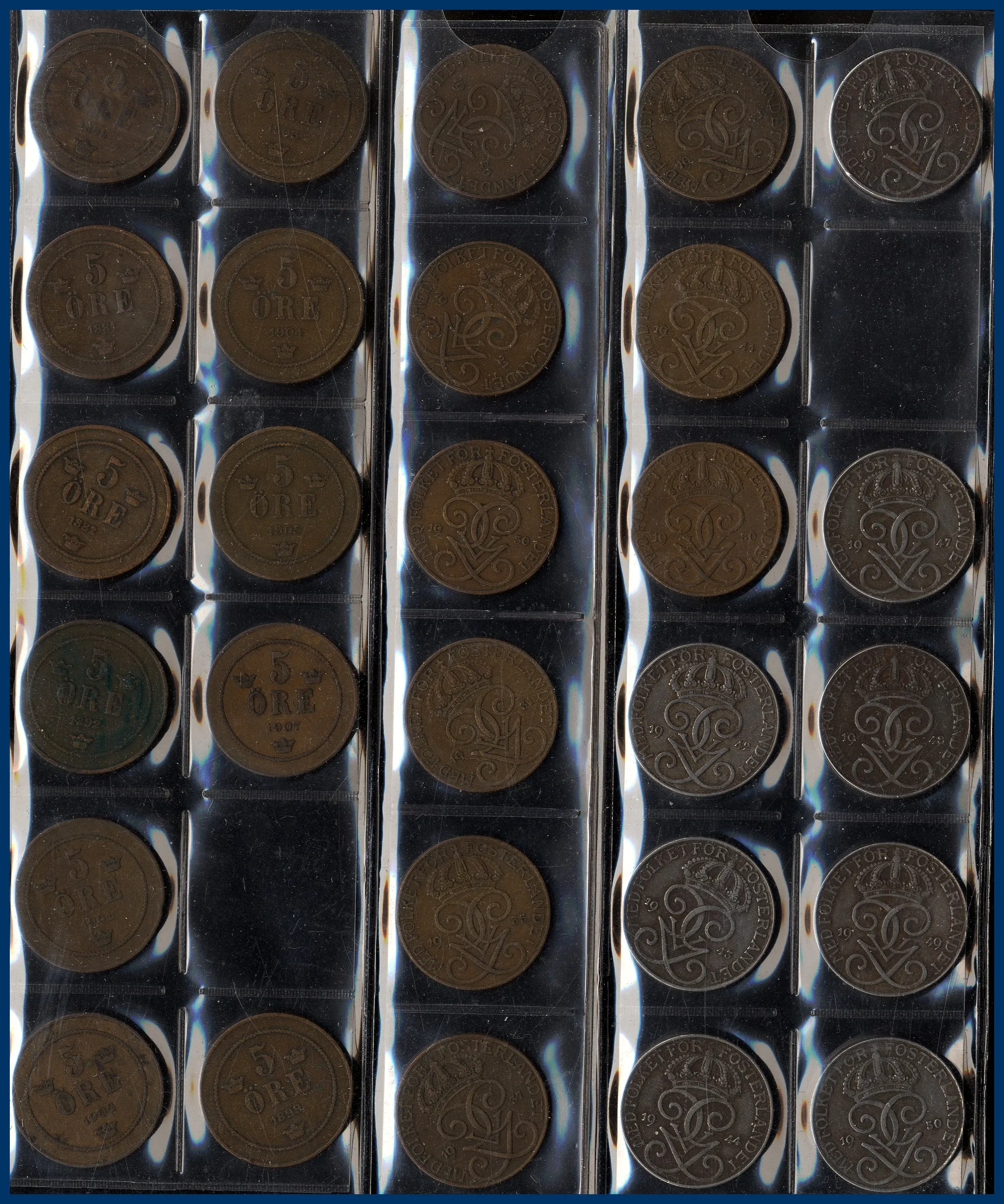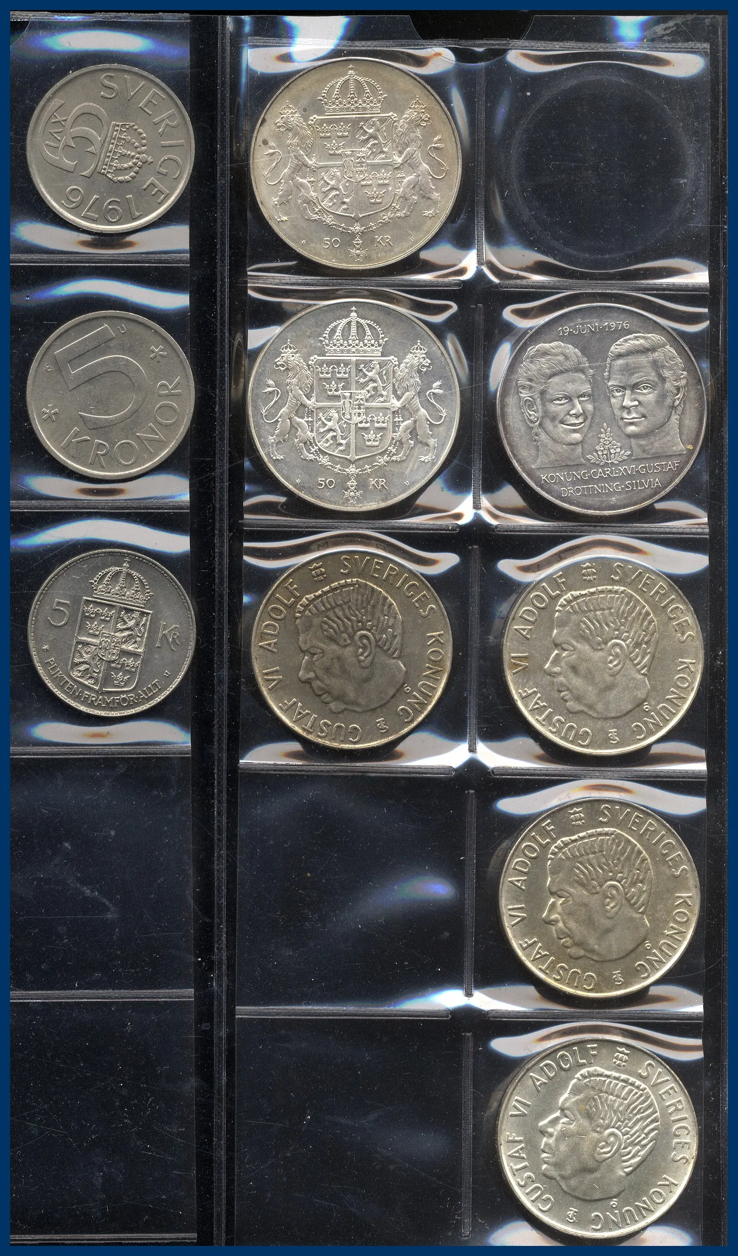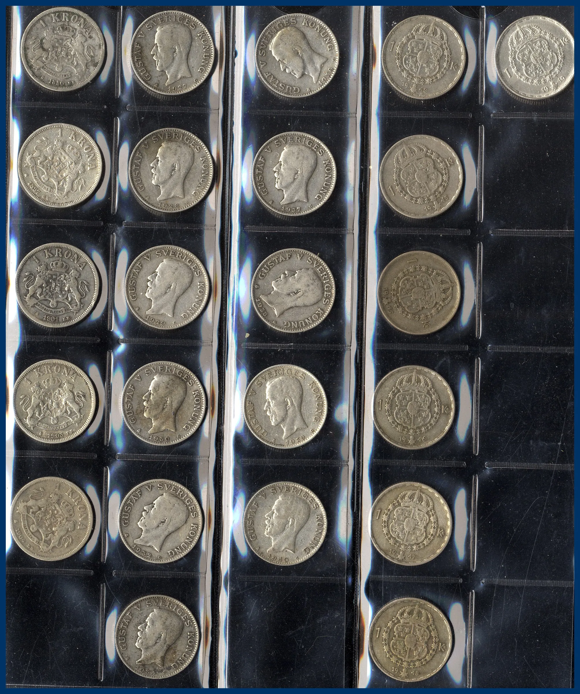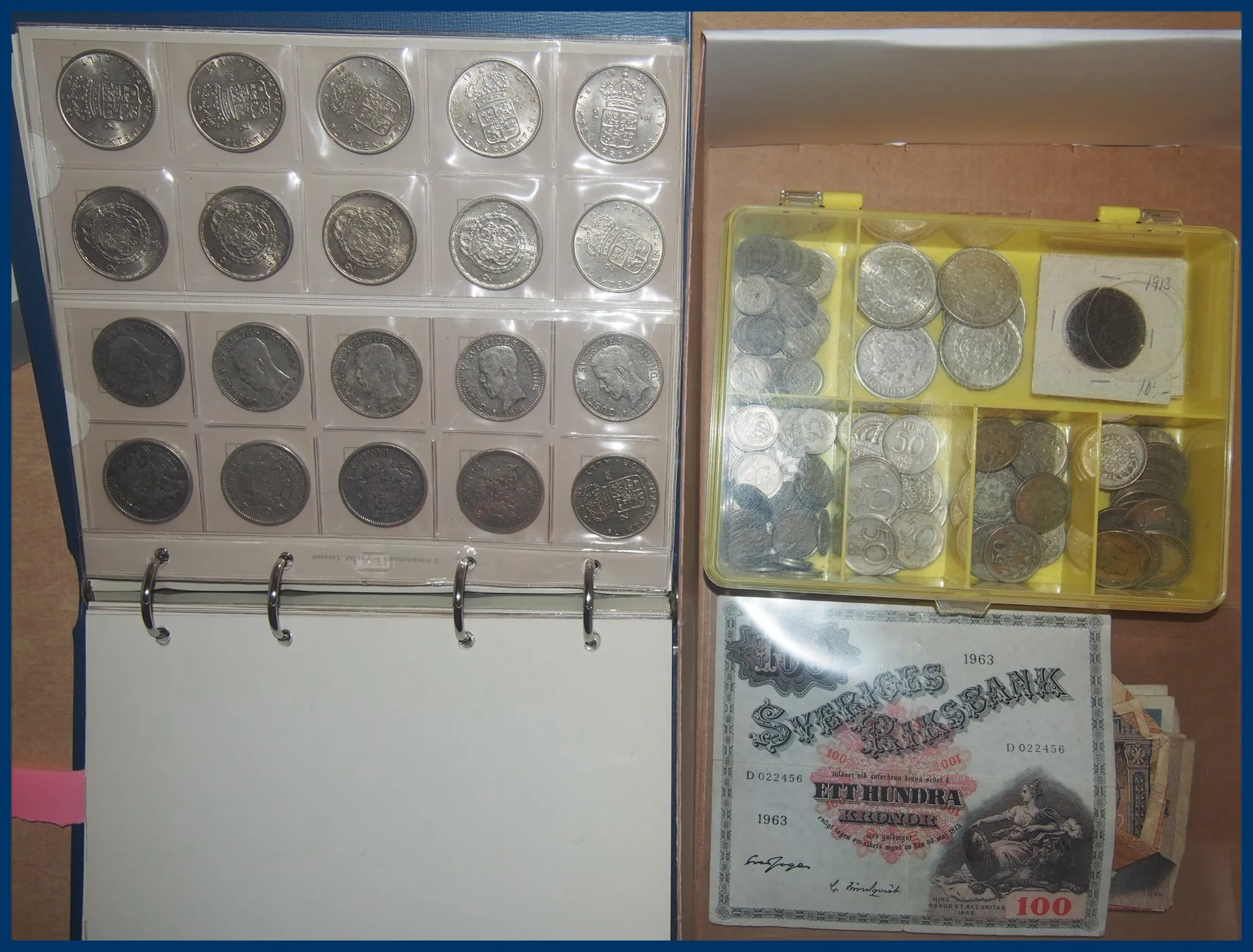 2 kr -1966 (13 st), 1 kr -1940 (22 st), 1 kr -1968 (16 st), 50 öre -1942 (36 st), 50 öre -1961 (24 st), 25 öre -1942 (57 st), 25 öre -1961 (17 st), 10 öre (66 st) Även diverse äldre svenska mynt samt bunt sedlar, nominal 340 kr.