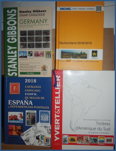 (fortfarande inplastade), de övriga i fint skick varav 3 st med frimärken. Även 4 fräscha kataloger: Yvert & Tellier Sydamerika 2019, Stanley Gibbons Tyskland 2018, Edifil Spanien 2018 samt Michel Tyskland 2018/2019.