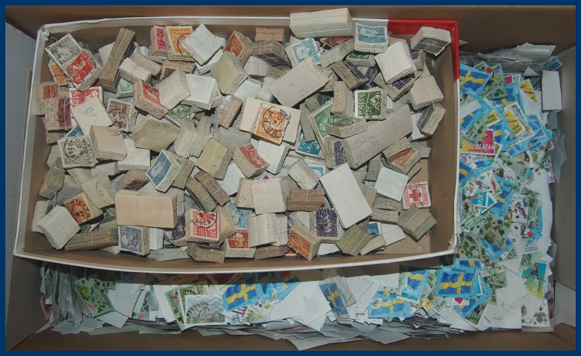 13. (F) 8 kg Sverige stämplade dubbletter löst i flyttlåda.