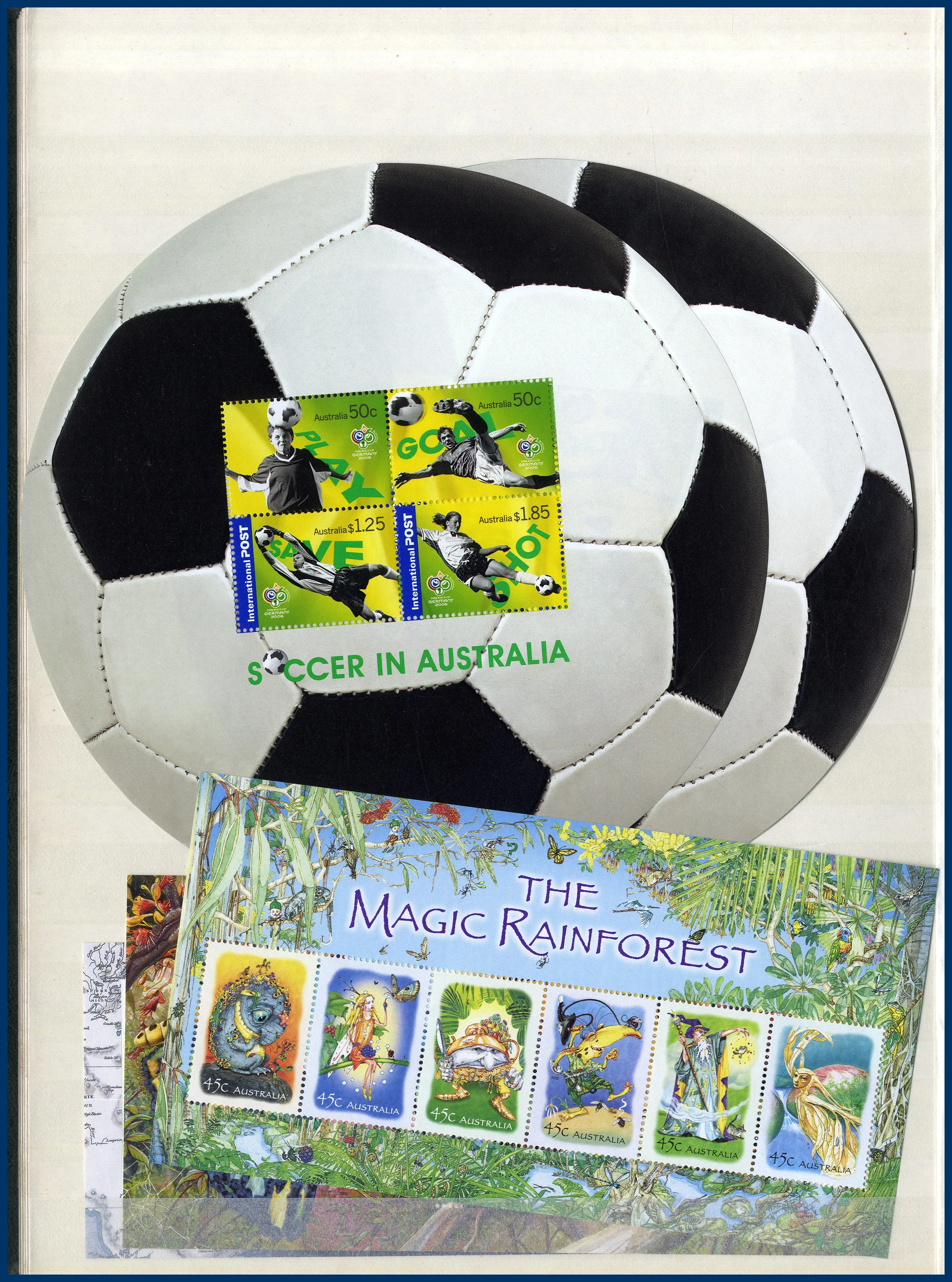 Australien med många 2000-talsblock och Guernsey med idel block och större enheter. Sist i ett av albumen sitter också ett block från Chile. ca 500 st försändelser Hela världen med mycket från Sverige och Danmark. 7 st filatelistiska böcker och äldre FACIT kataloger samt tomt USA album med White ACE blad 1847-1980 i 2 pärmar.