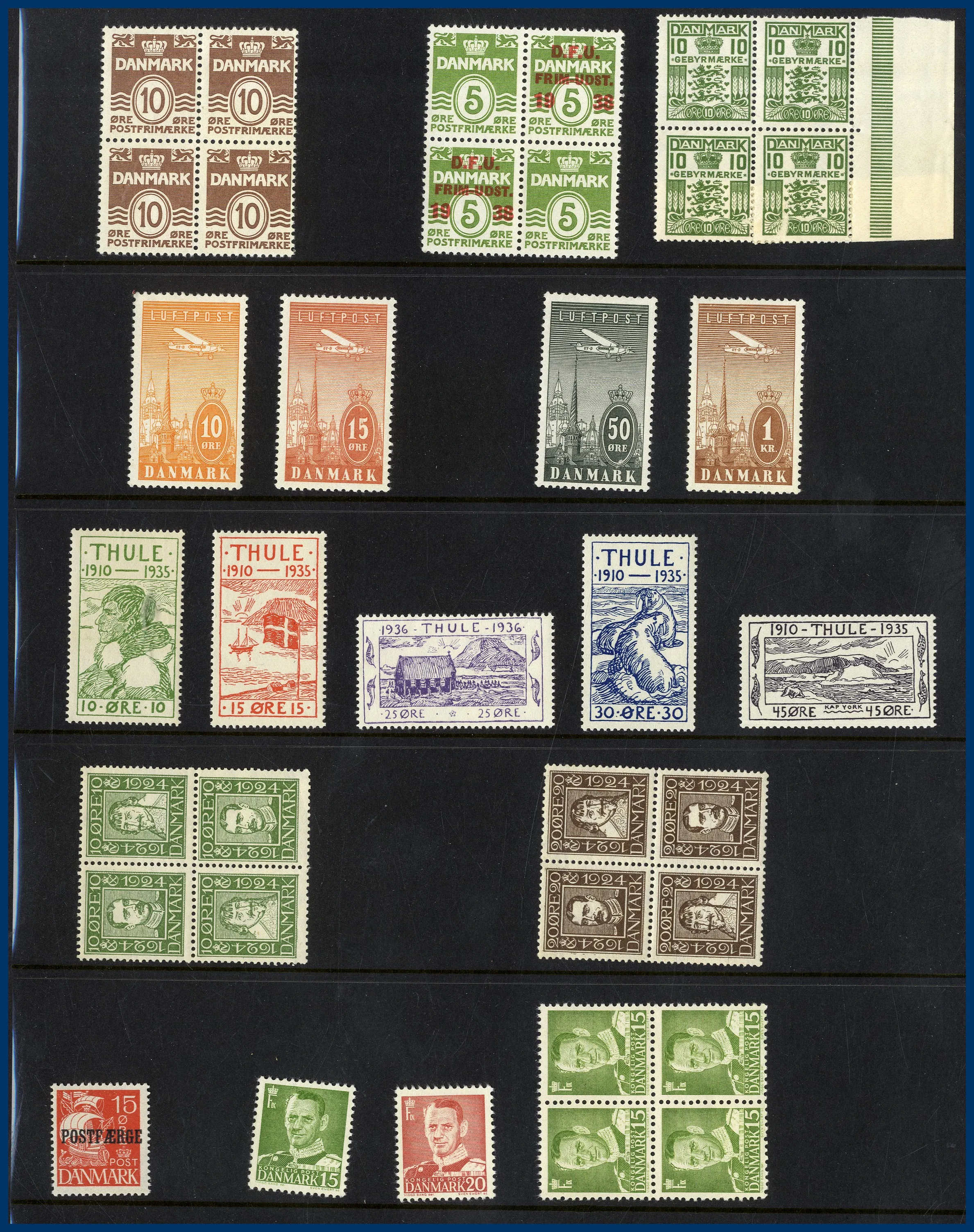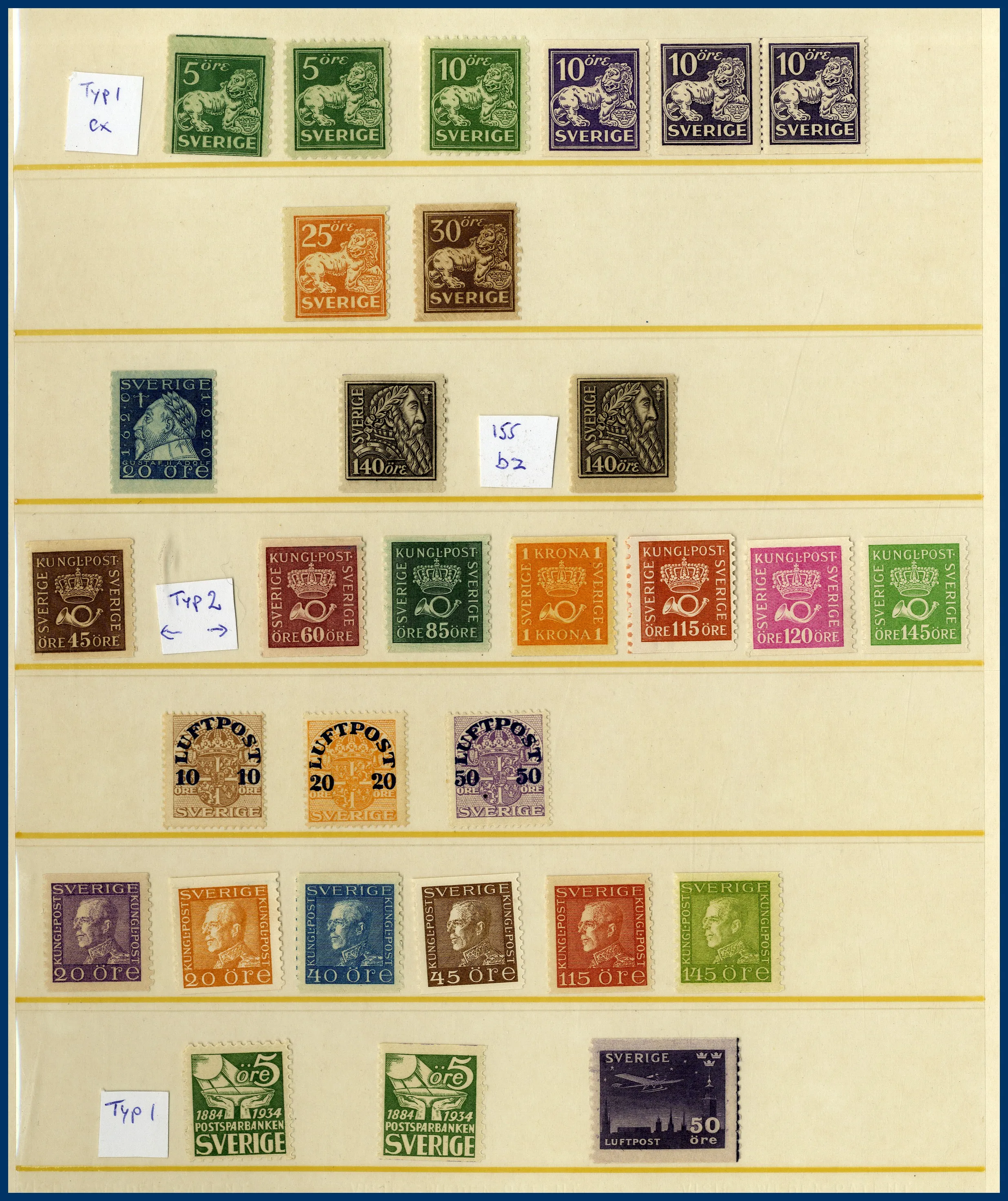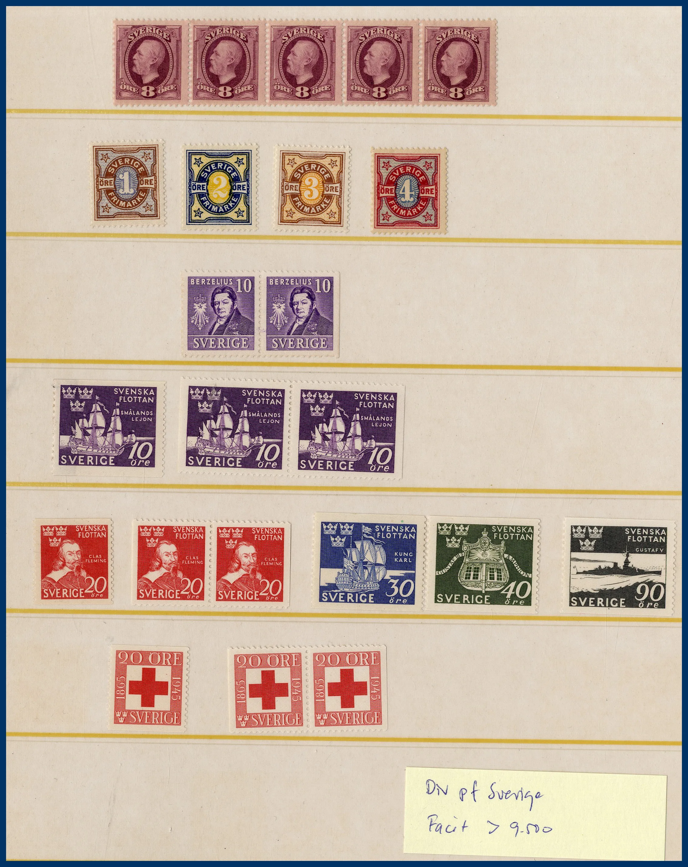 Bunt Svenska stämplar på instickskort, album med mycket ** Norden, Pärm med försändelser även utlandet, en burk med lösa märken. En hel del att hitta.