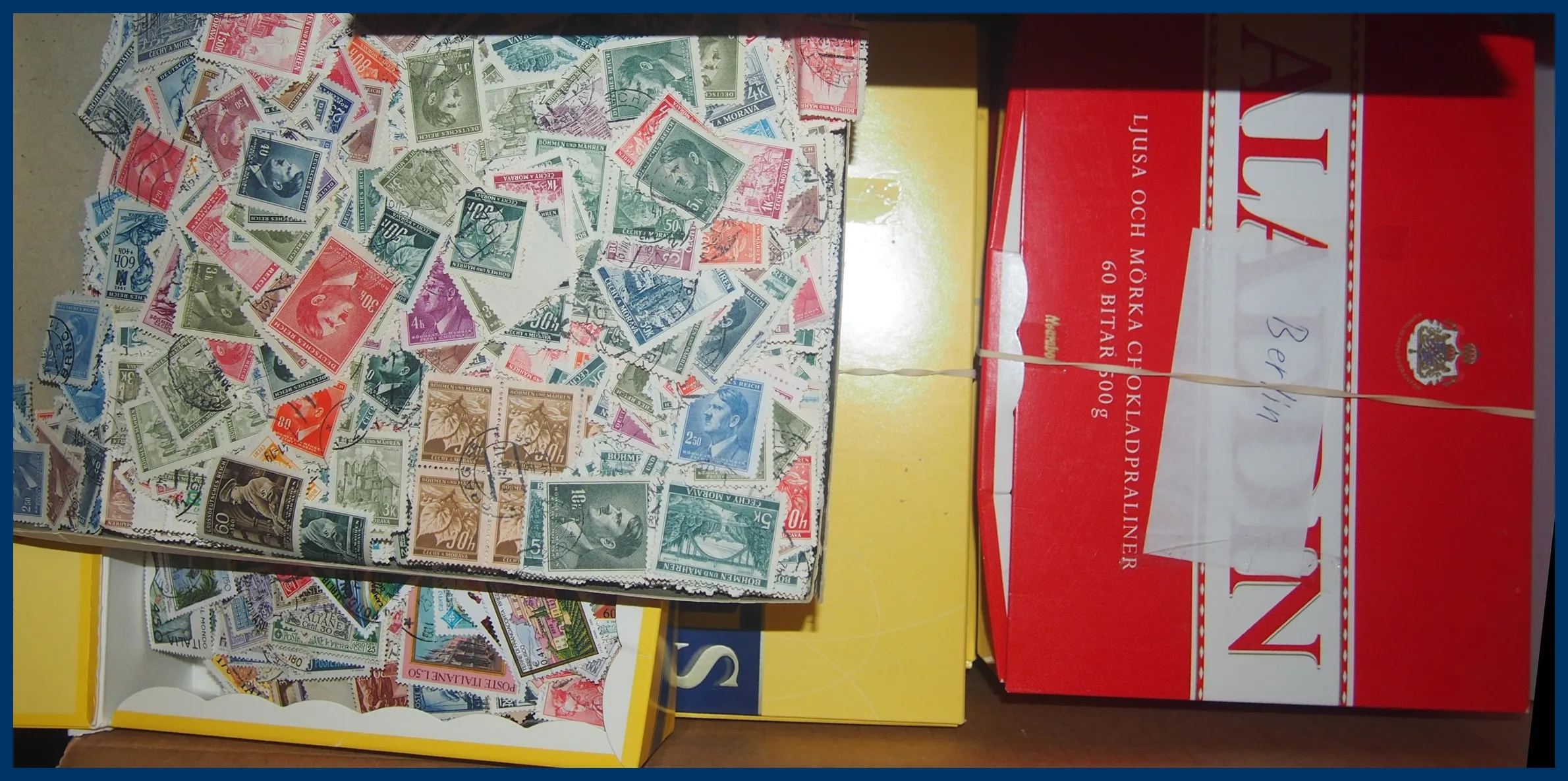 394. (F) Flyttlåda med europeiska frimärken löst i 12 st askar.