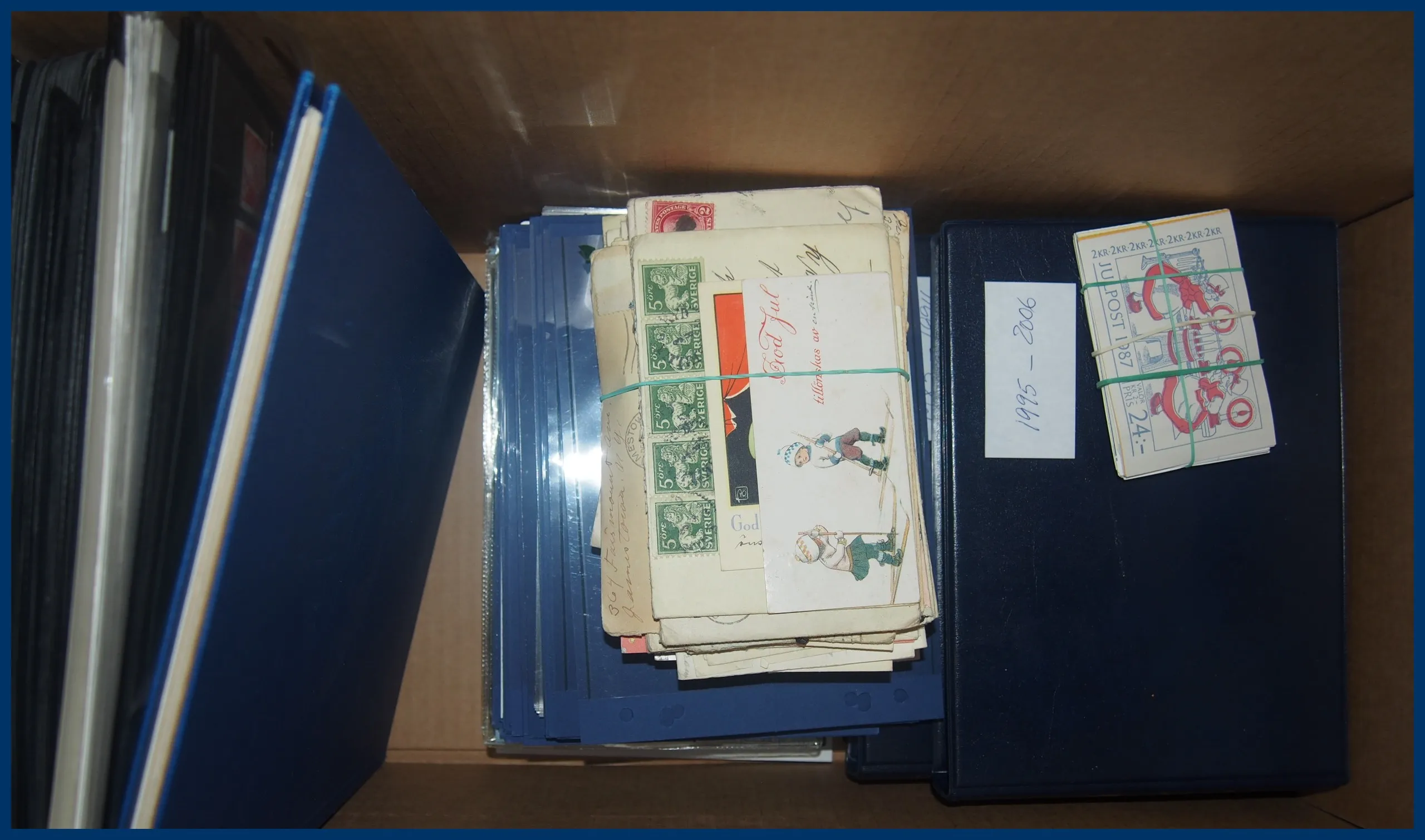 20.700 kr: häften, årssatser och lösa märken monterade på olika typer av lösblad, mest 1980-tal fram till 2006. Mervärde för 56 rabattfrimärken. Lådan innehåller också lite stämplat Sverige och utlandet, en bunt försändelser samt diverse PFA-gåvor etc.