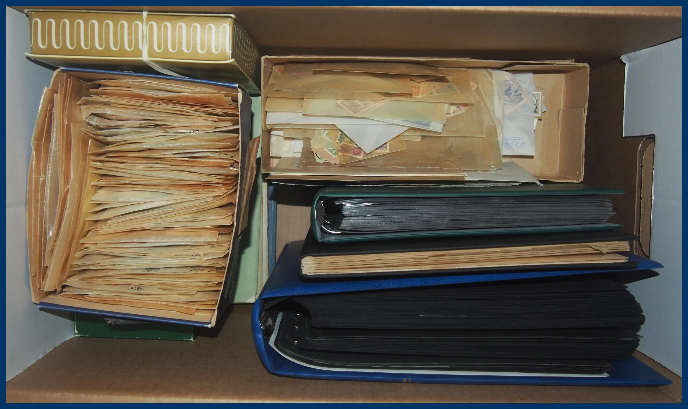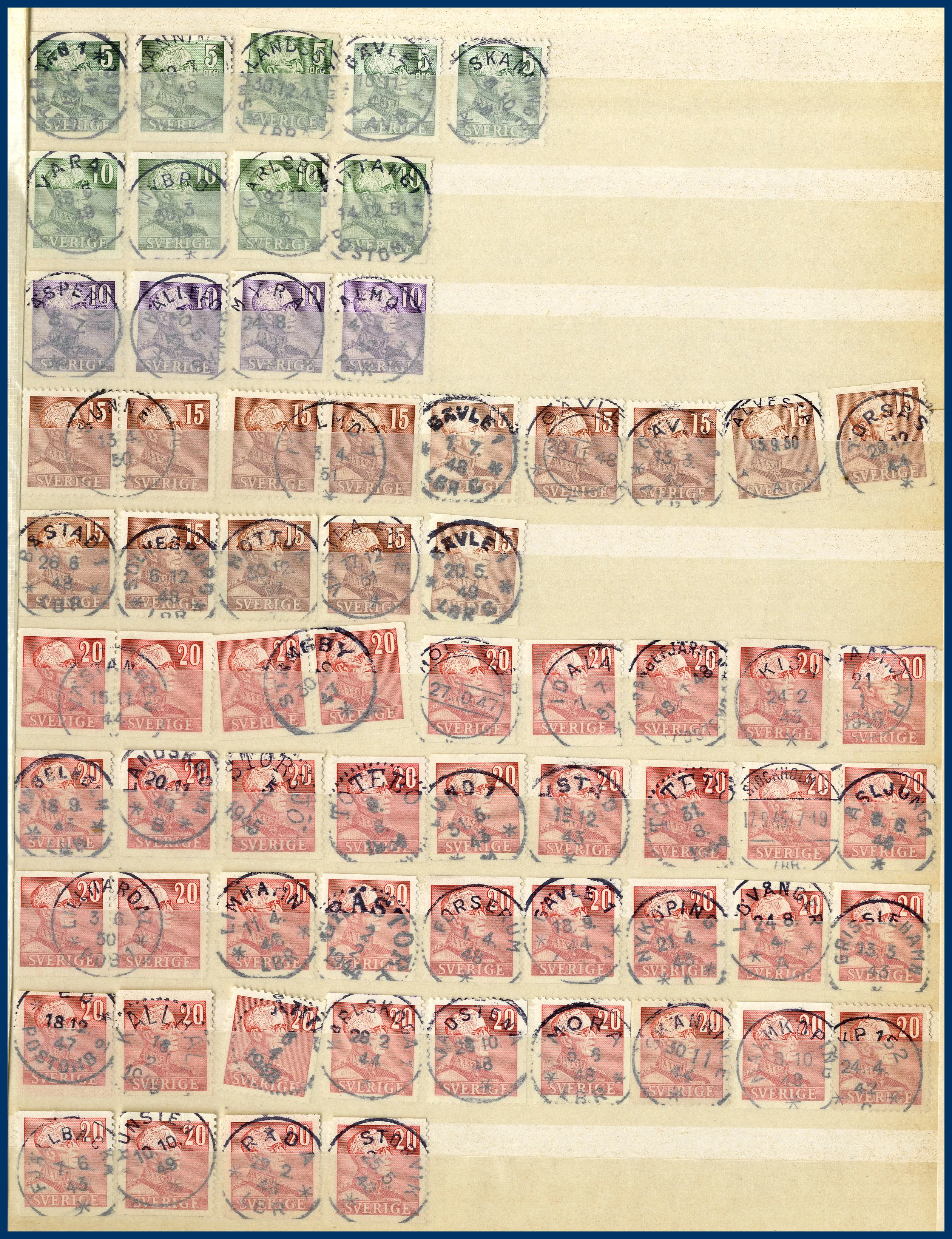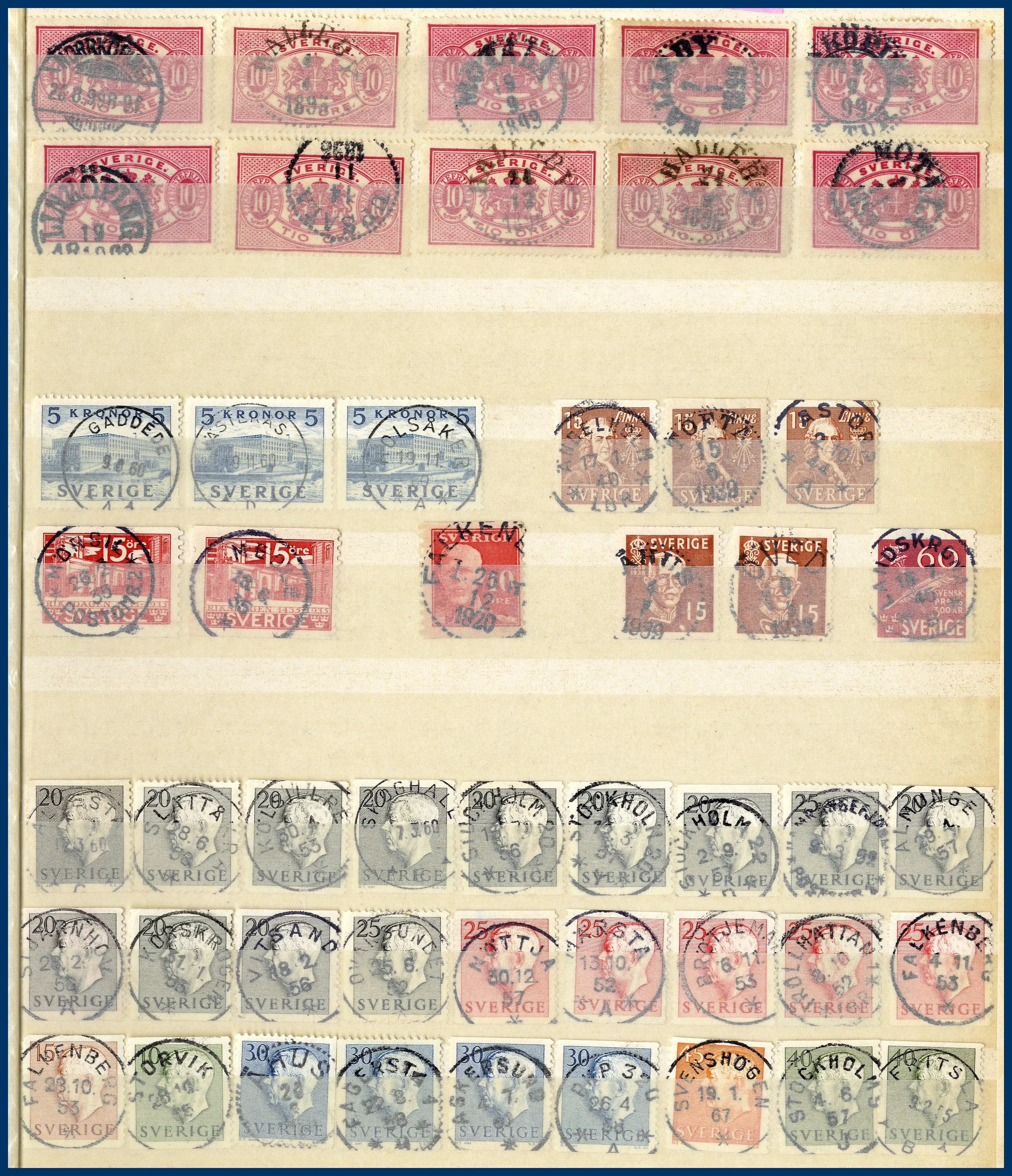 A-Ö i visiralbum + diverse stämplar i insticksalbum samt album försändelser. Även 2 askar med 100-tals stämplar i pergamynkuvert. Utöver ortstämplar även Hela världen i ett 10-tal små album och urvalshäften samt 2 askar blandat.