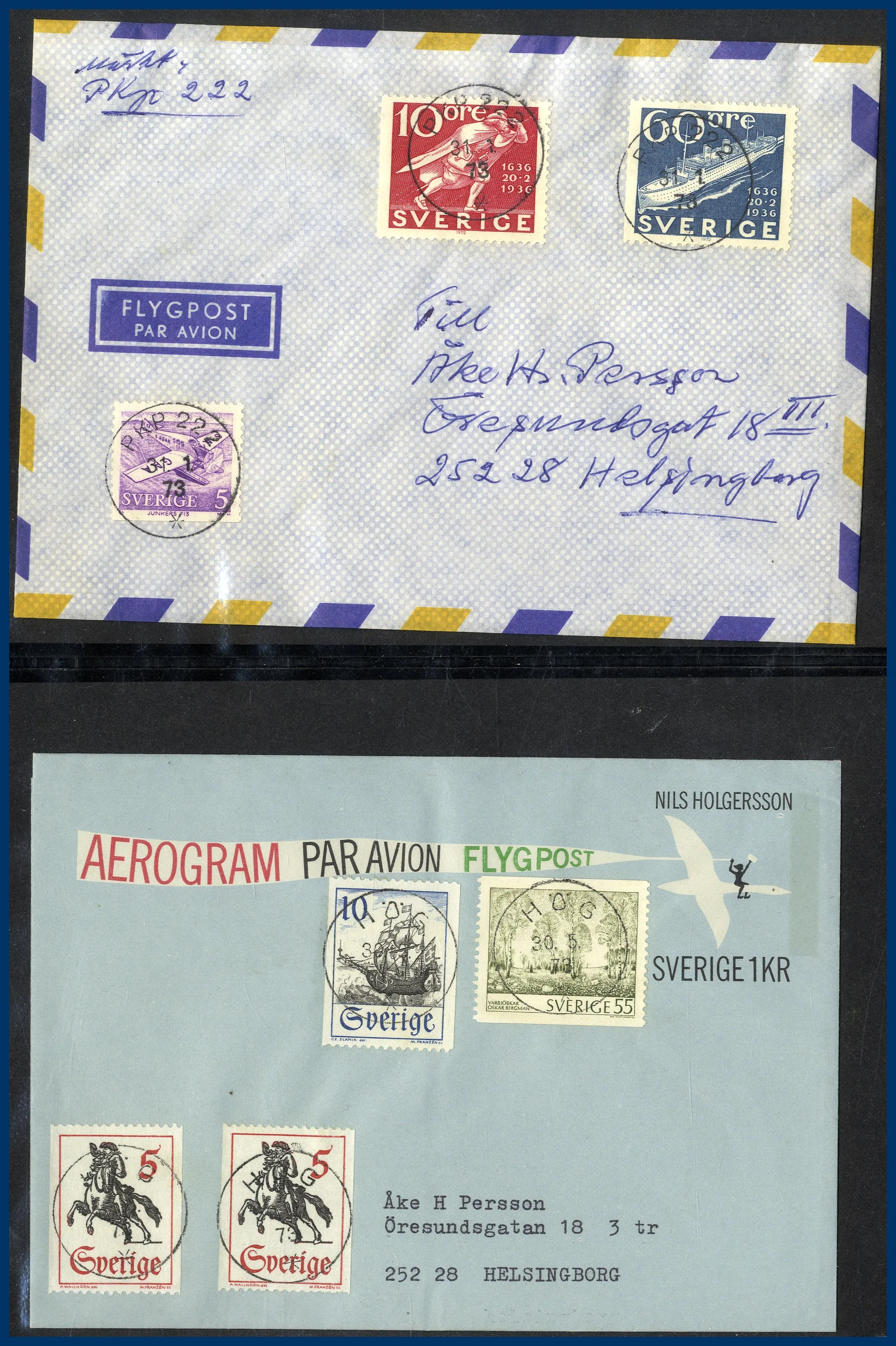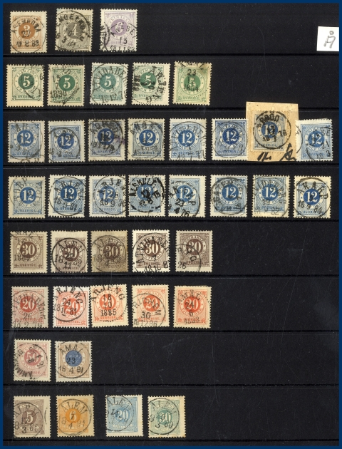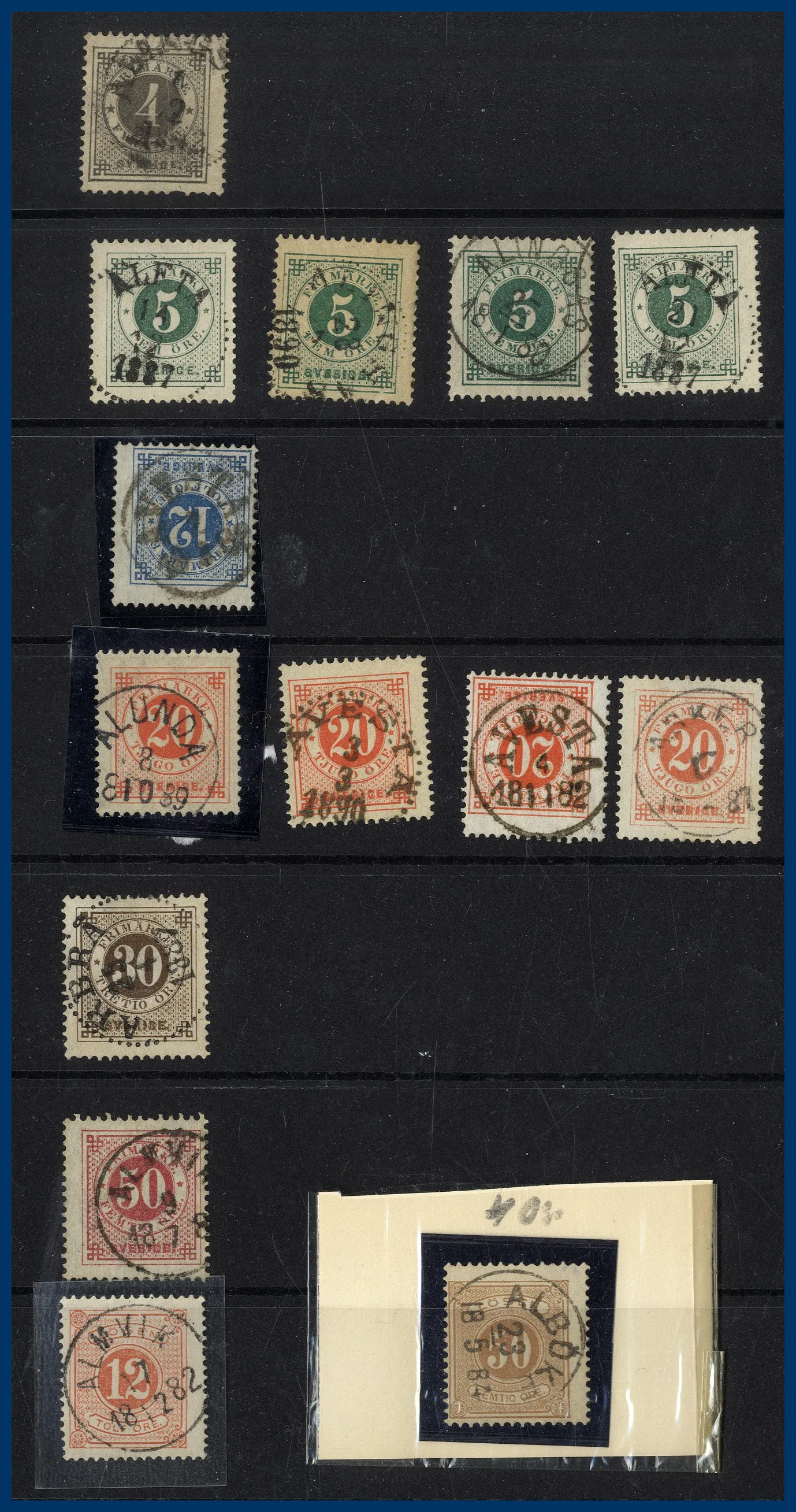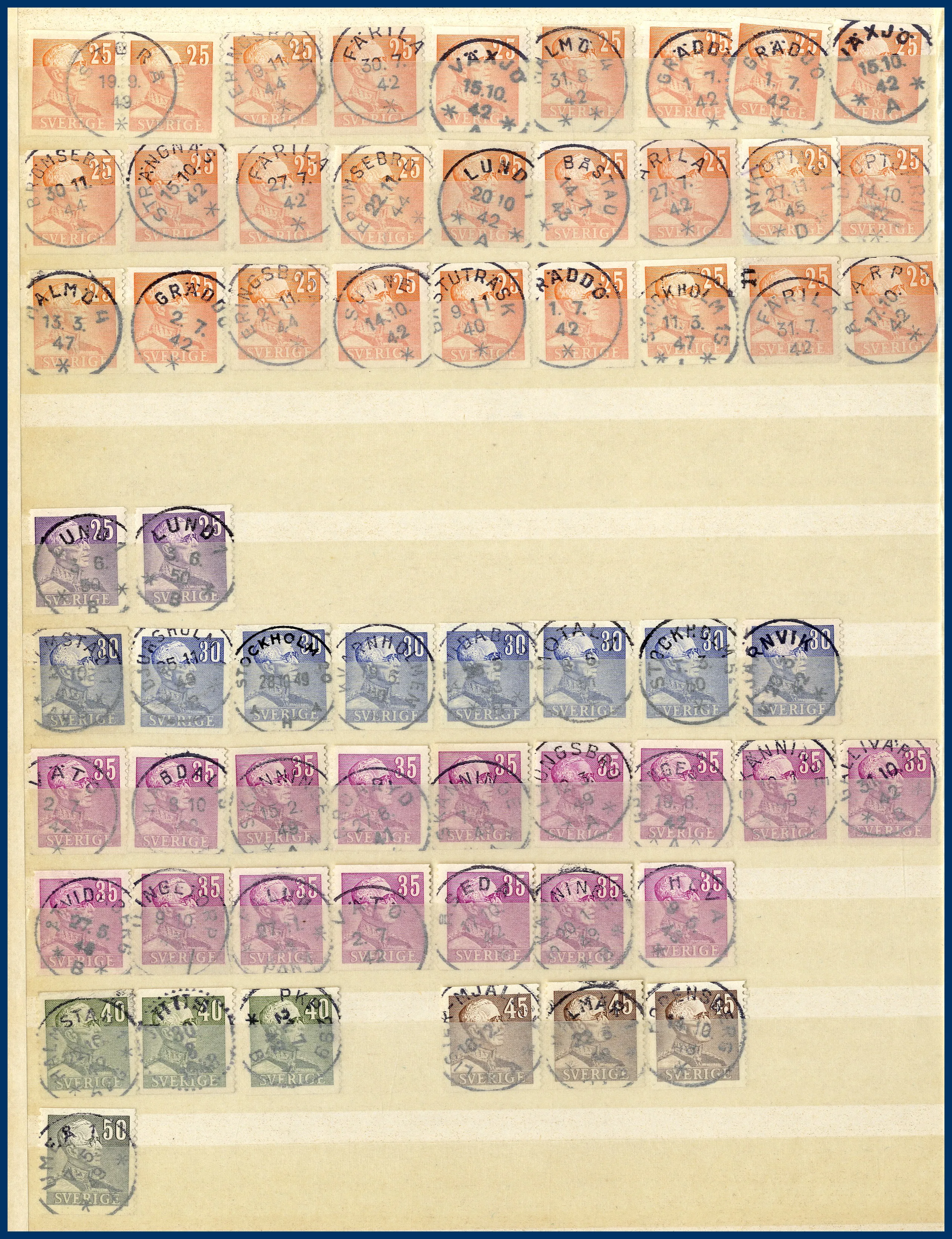 A-Ö i visiralbum + diverse stämplar i insticksalbum samt album försändelser. Även 2 askar med 100-tals stämplar i pergamynkuvert. Utöver ortstämplar även Hela världen i ett 10-tal små album och urvalshäften samt 2 askar blandat.