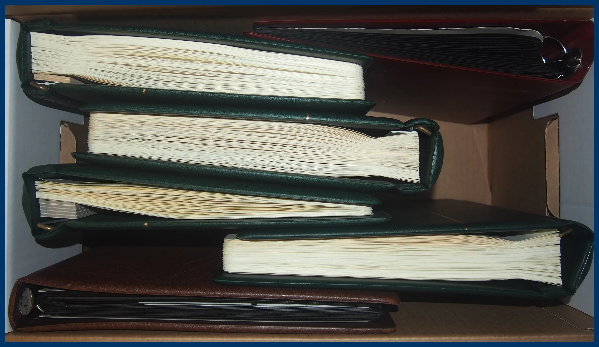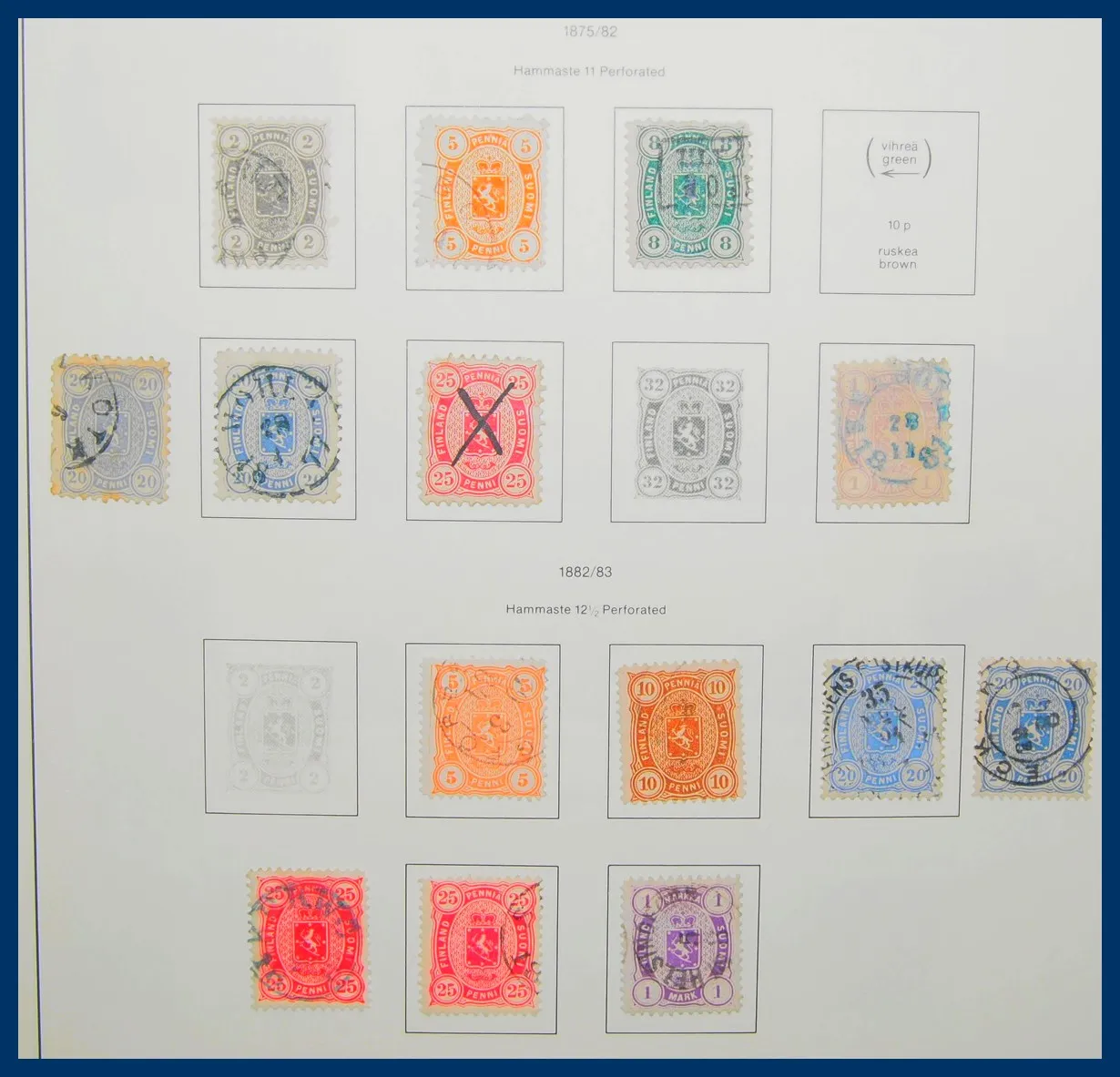 1. Finland stämplad samling 1866-2014 (blad till 2017) i två Leuchtturm-album utan fickor. 2. Åland ** 1984-2013 i ett Leuchtturm-album med fickor (enstaka stämplade och några luckor). 3. Färöarna stämplad samling 1940-2017 i ett Leuchtturm-album utan fickor. Välbesatt till ca 2010. därefter glesare. 4. Album med Färöarna ** 1975-2019 i form av lösa märken, block och större enheter inkl. mängder av fyrblock. 5. Visiralbum med lite Sverige **/* 1950-tal till 1975.