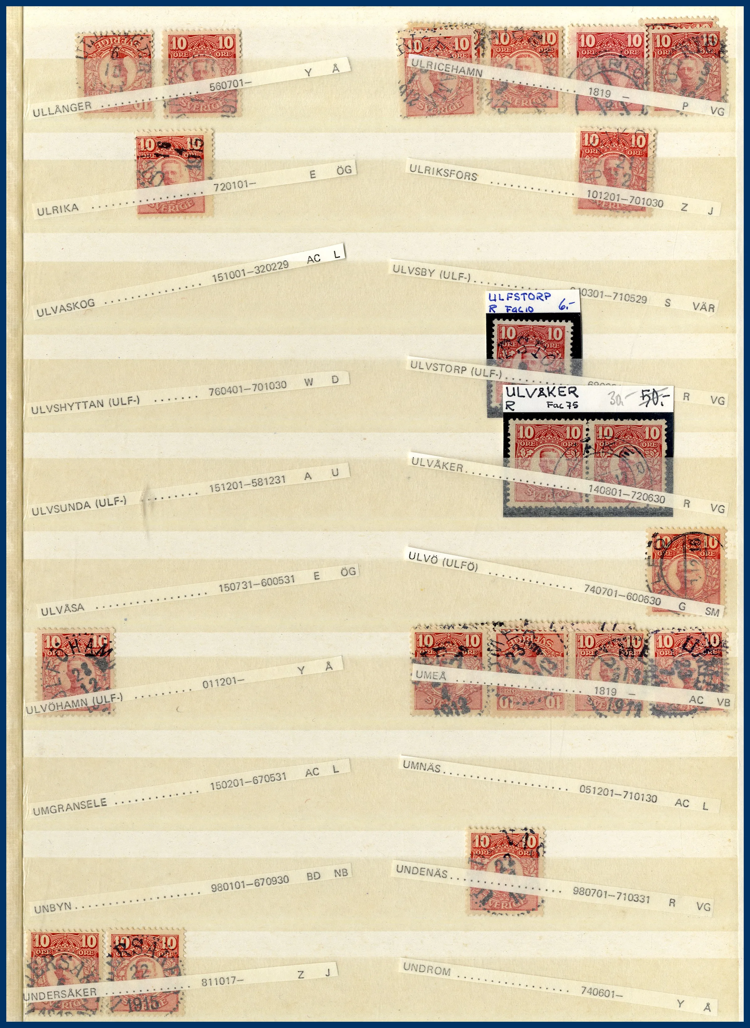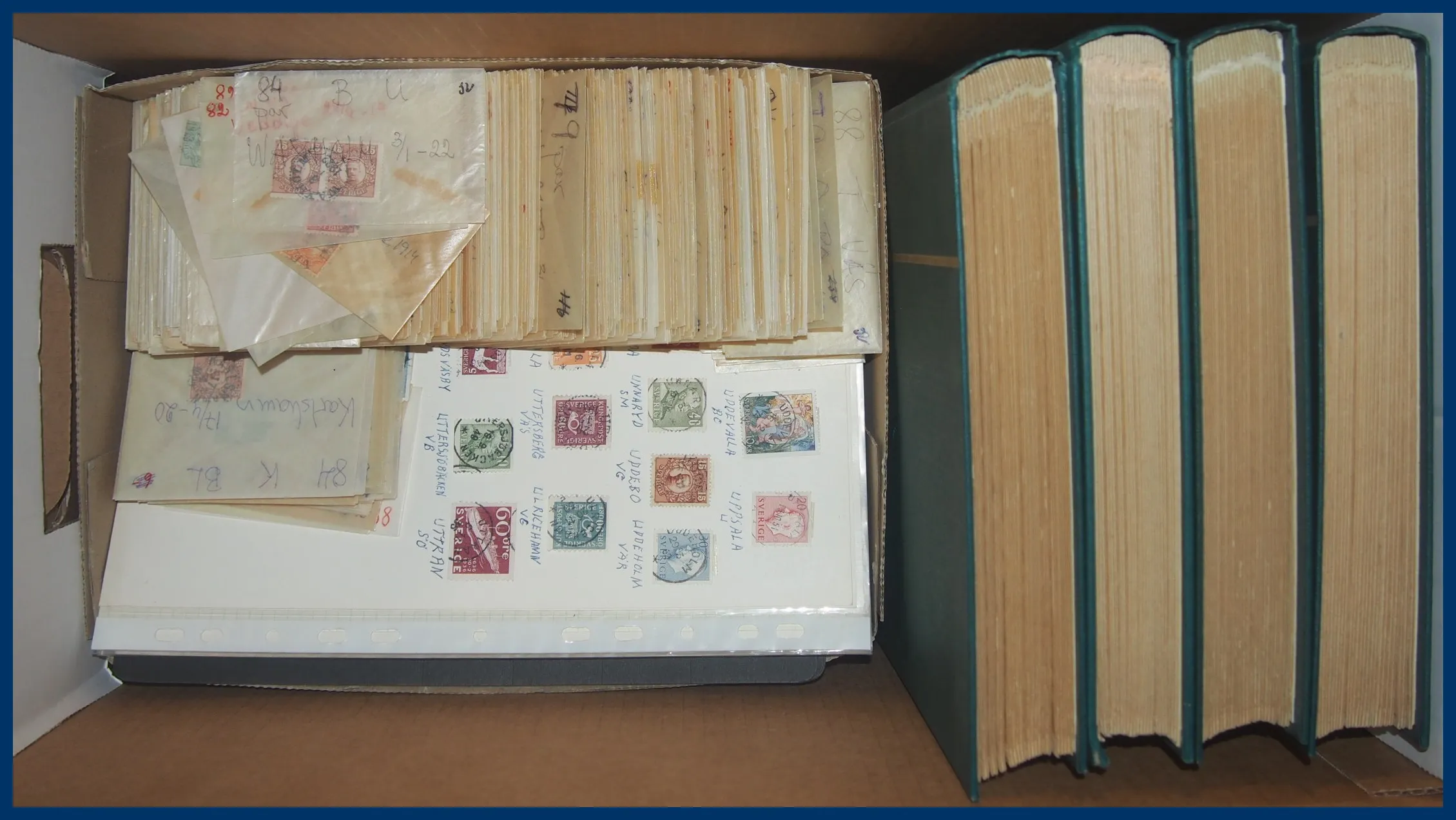 glest besatta insticksalbum, samling postombud i 100-tals pergamynkuvert, samling mest ortstämplar medaljong A-Ö i ytterligare 100-tals pergamynkuvert samt diverse stämplar på olika utgåvor, äldre-modernt i låda.