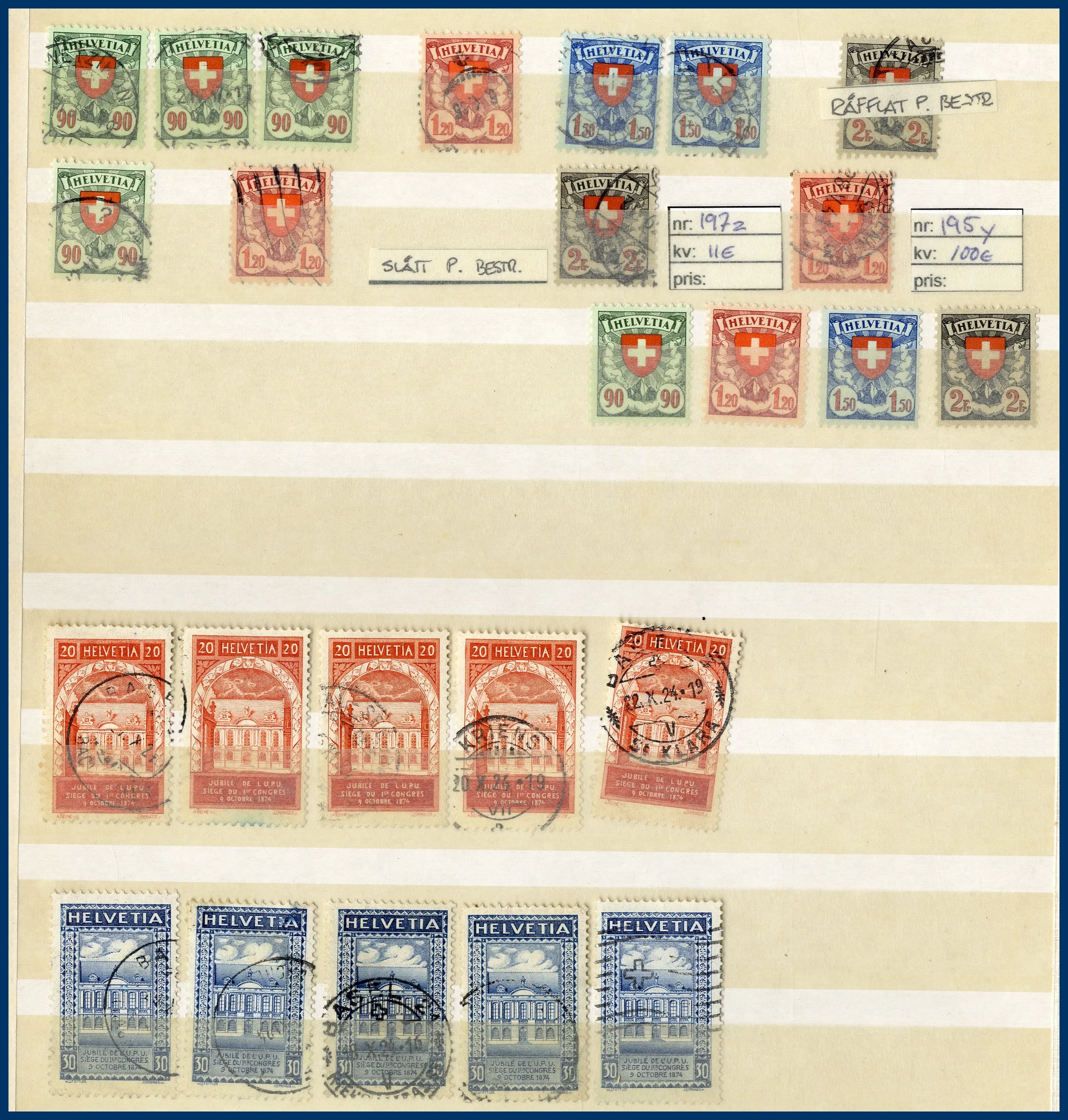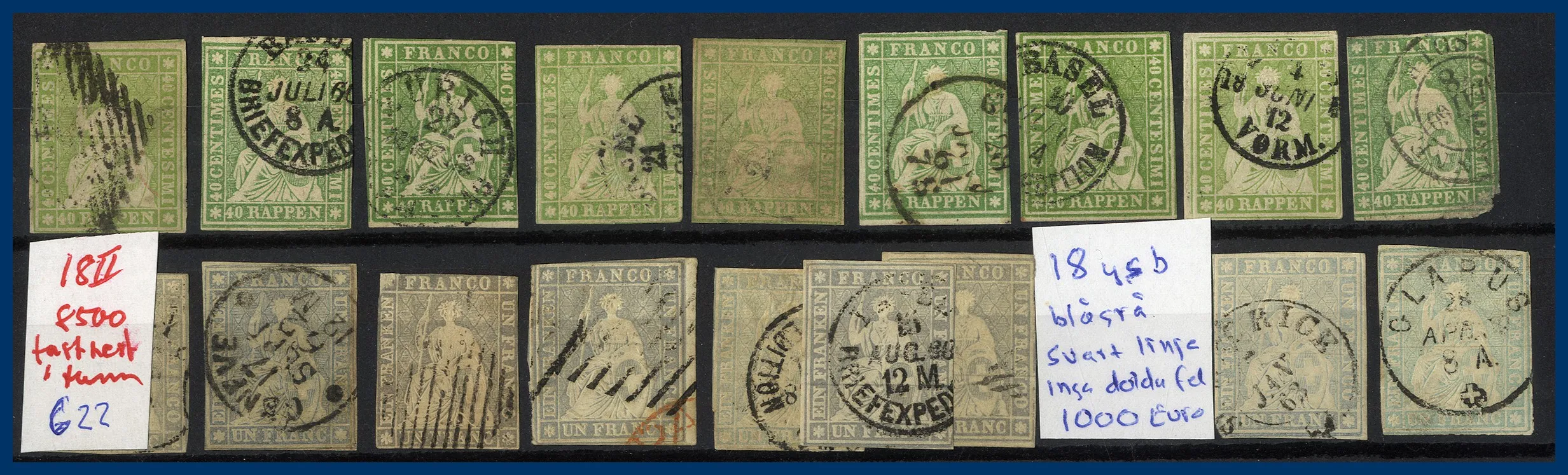 antal album och på instickskort etc. i en cigarrlåda. Mängder med bättre märken och block och även mycket "mellanmaterial" med hyggliga katalogvärden. Bland de riktigt tidiga märkena är det endast Mi 7 II som har äkthetsintyg, för övriga märken är det upp till var och en att göra sin egen bedömning. Se gärna de många bilderna på vår hemsida.