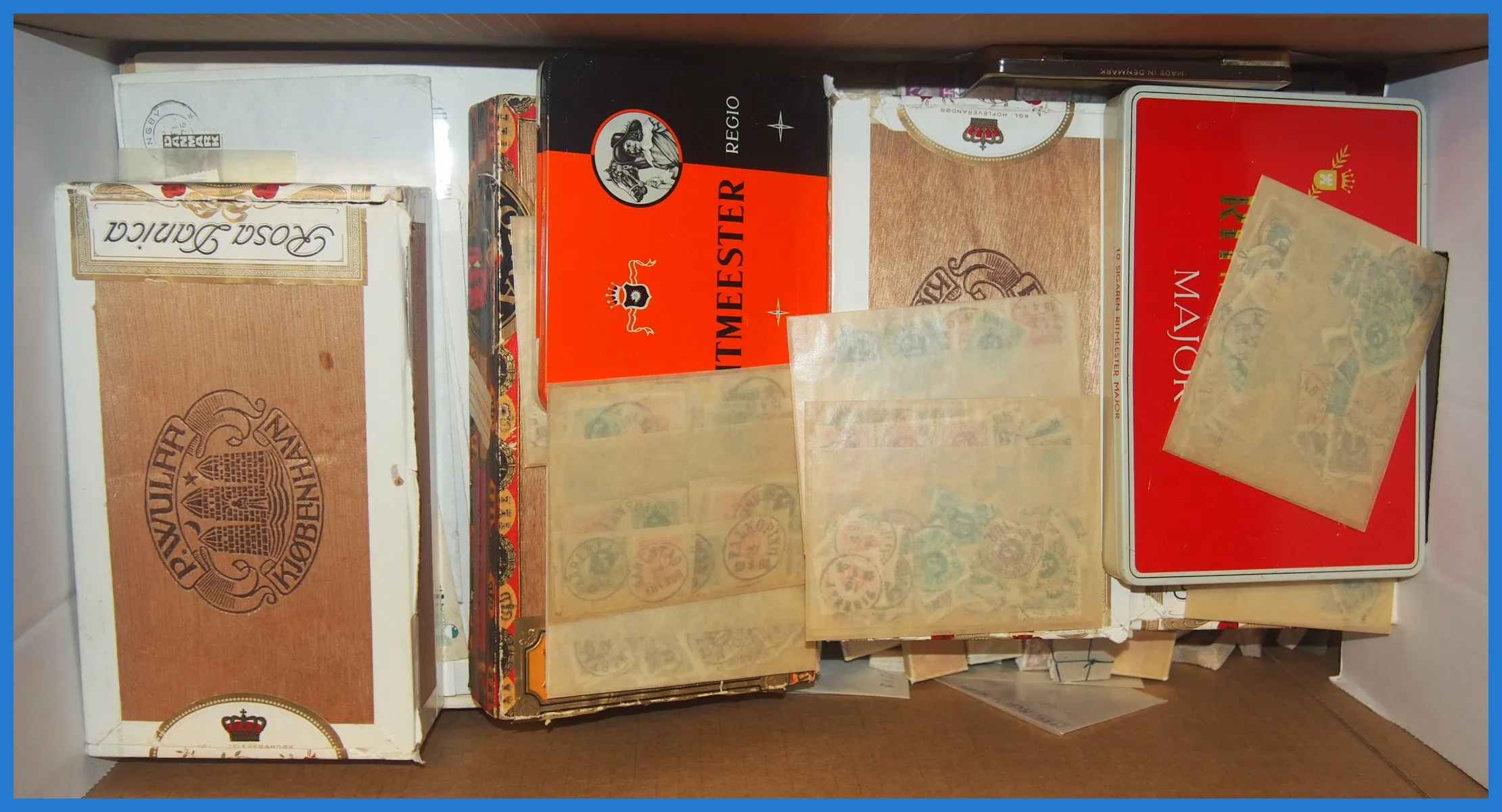 modernt i mängder av pergamynkuvert samt i några cigarraskar etc. Vackra stämplar, t.ex. på Oscar, har setts. Inemellan även något utlandet samt en bunt svenska försändelser.