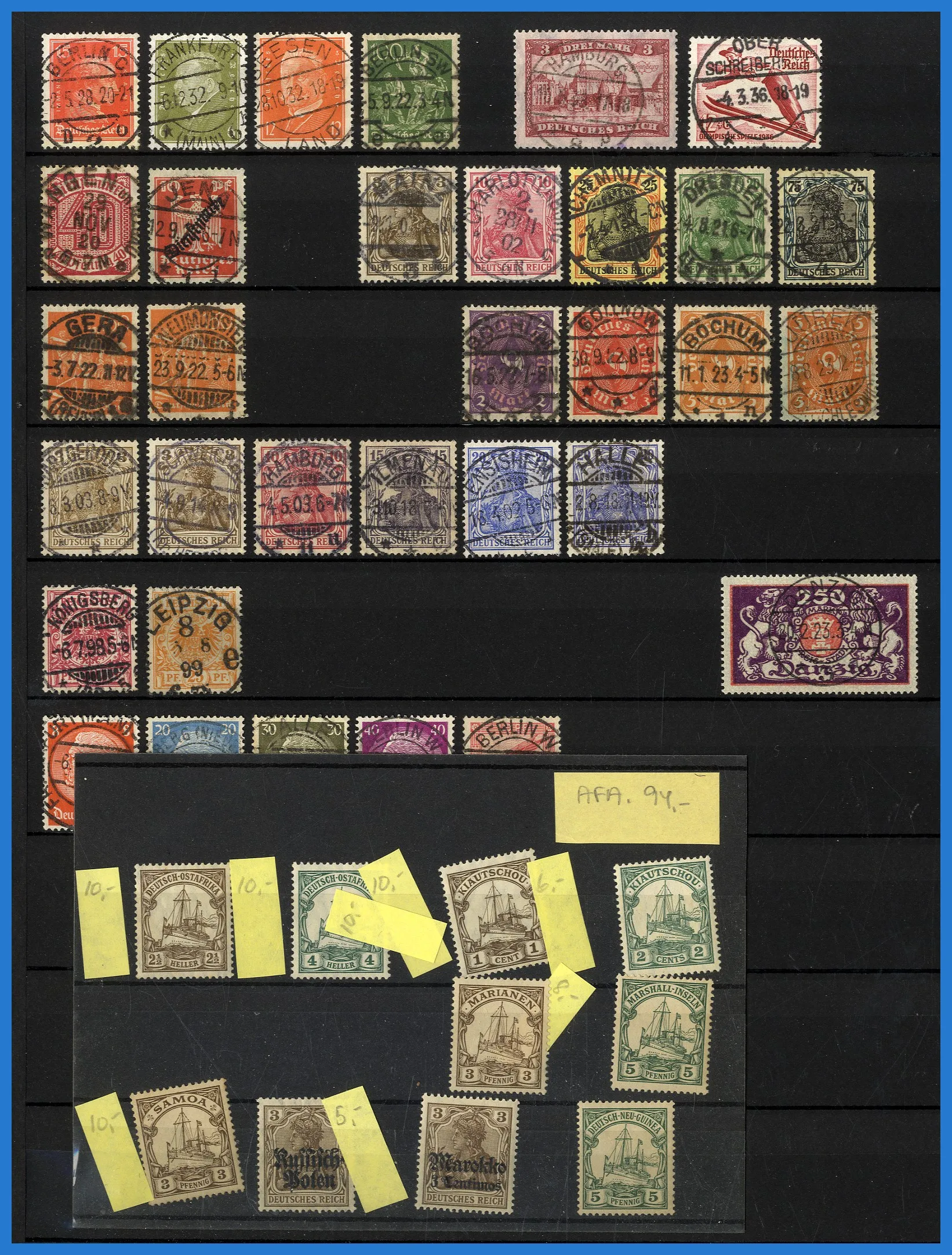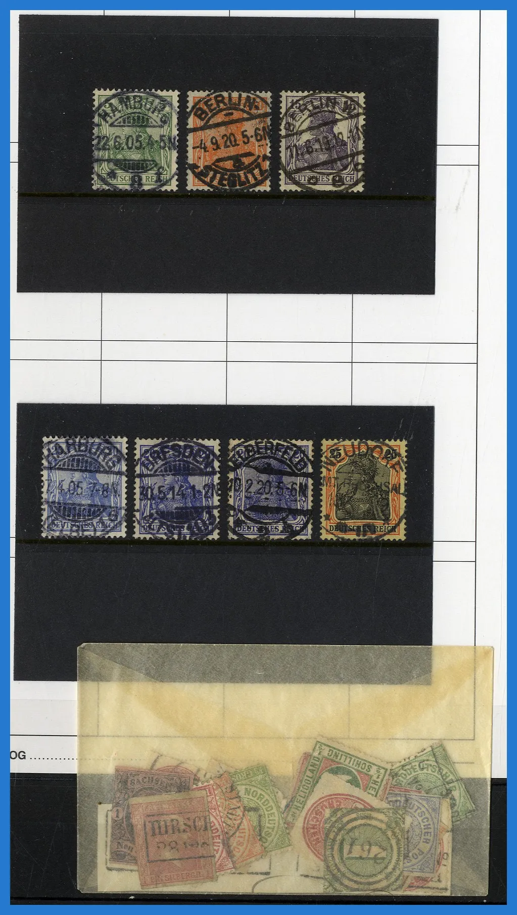 av pergamynkuvert och löst i mindre askar, ofta sorterat efter utgåva. Stor mängd, och vackra stämplar har setts lite här och där. Det ingår även lite övriga Tyskland samt ett 40-tal lösblad med tysk fält-/militärpost från 1:a världskriget.
