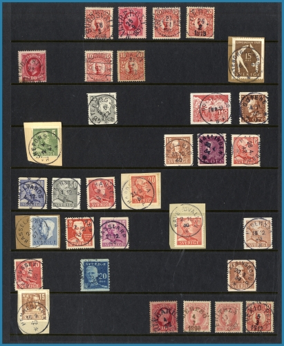 från Sverige, inklusive 2 album med vackra stämplar, läsbart-prakt. Även Handboken om Oscar II, Post och Makuleringsstämplar 1685-1951, låda mynt HV samt ett stort förstoringsglas.