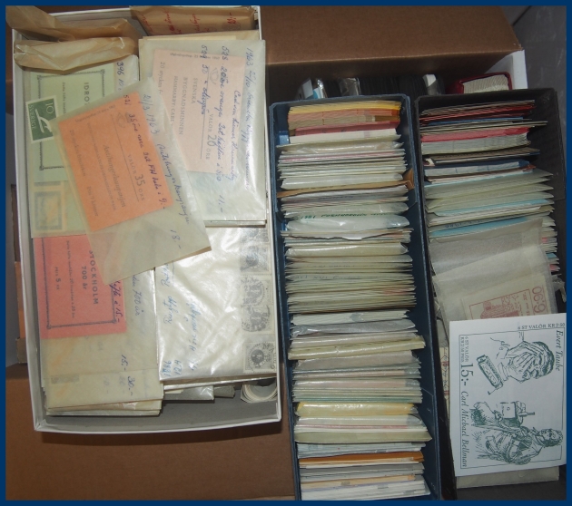 Bla: album + 100-tals lösa visirblad Hela Världen med mycket motiv Schack, 2 skolådor blandat **/O med mycket Sverige ** 1930-1960 talet samt 2 välfyllda pergamynlådor med ca 700 st ** häften Sverige 1960-1980 talet, oräknad hög nominal.