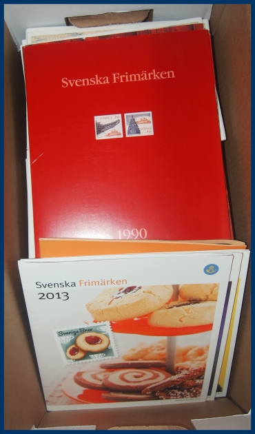 presentsatser och märken på insticksblad. Märken från 1969 till 2013. 6 av årssatserna är från 2000-talet med stor andel Sverige Brev. Även många Sverige Brev på insticksbladen. Det ingår också en förseglad årssats från 1970 (Facit 1750 kr). Nominal drygt 22.300 kr med mervärde för hela 560 st rabattfrimärken/Företagspost. Som vid all nominalräkning räknar vi bara den valör som står på rabattfrimärkena/Företagspostmärkena [1,40 kr till 2,30 kr] trots att de rätt använda har ett frankeringsvärde av minst 44 kr/st. Mervärdet för det här partiet är alltså enormt. (Julmärken räknade som 21 kr/st).