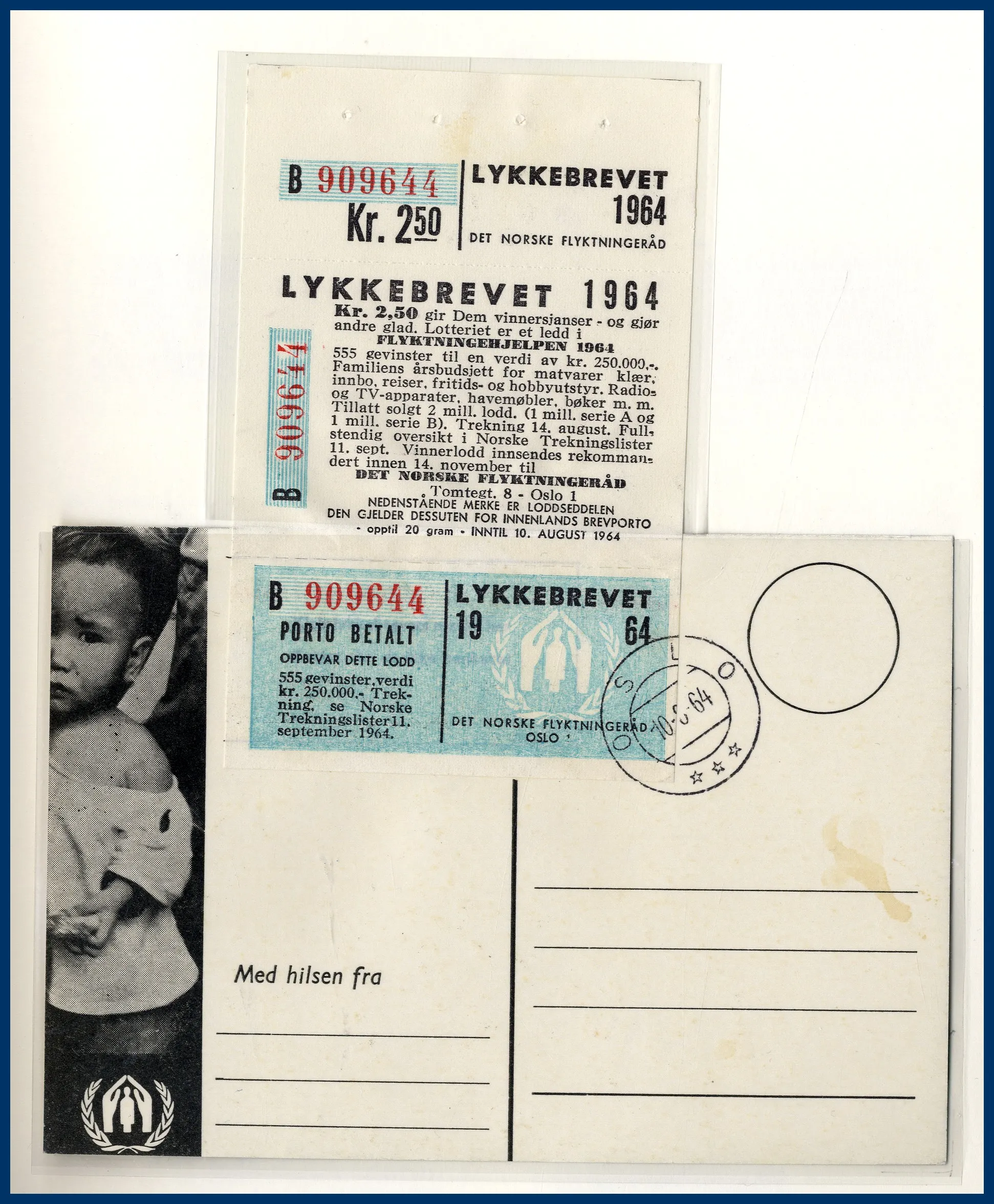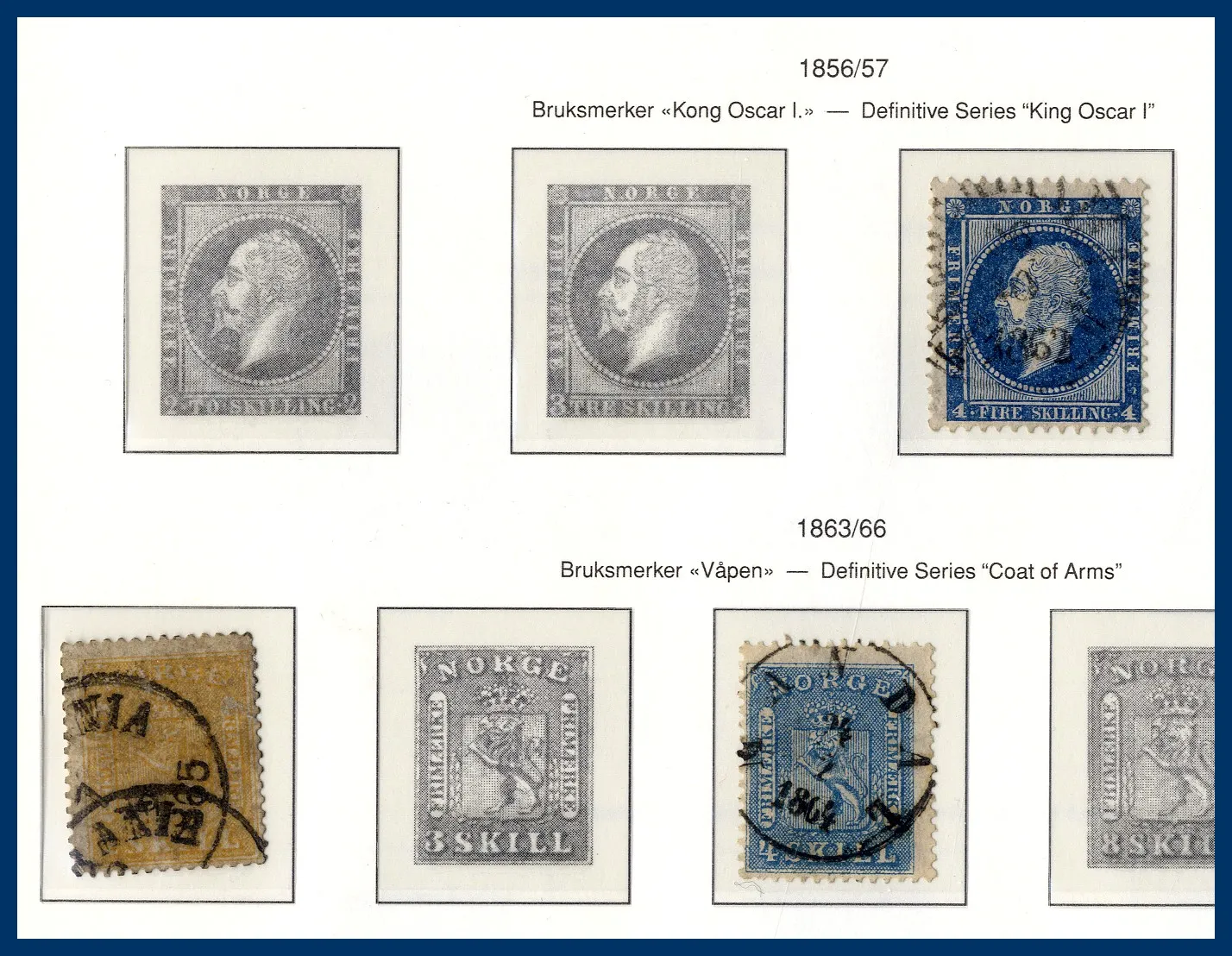 fräscha Leuchtturmalbum med fickor (fr.o.m. 1855) och kassetter. 3 st skillingvalörer samt Lykkebrevet 1964, i övrigt mest enklare märken. Även stor mängd dubbletter i ett tjockt insticksalbum och i pergamynkuvert.