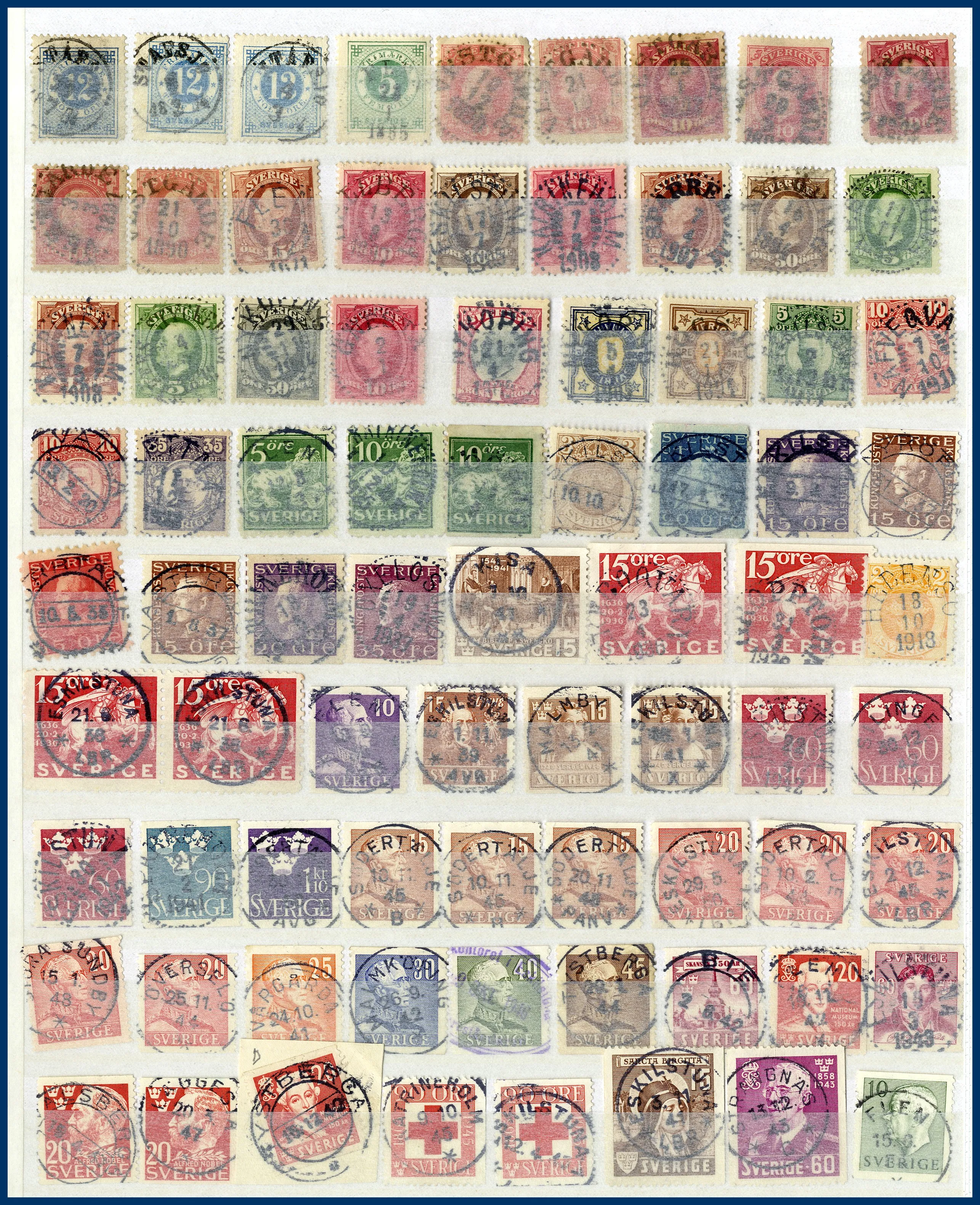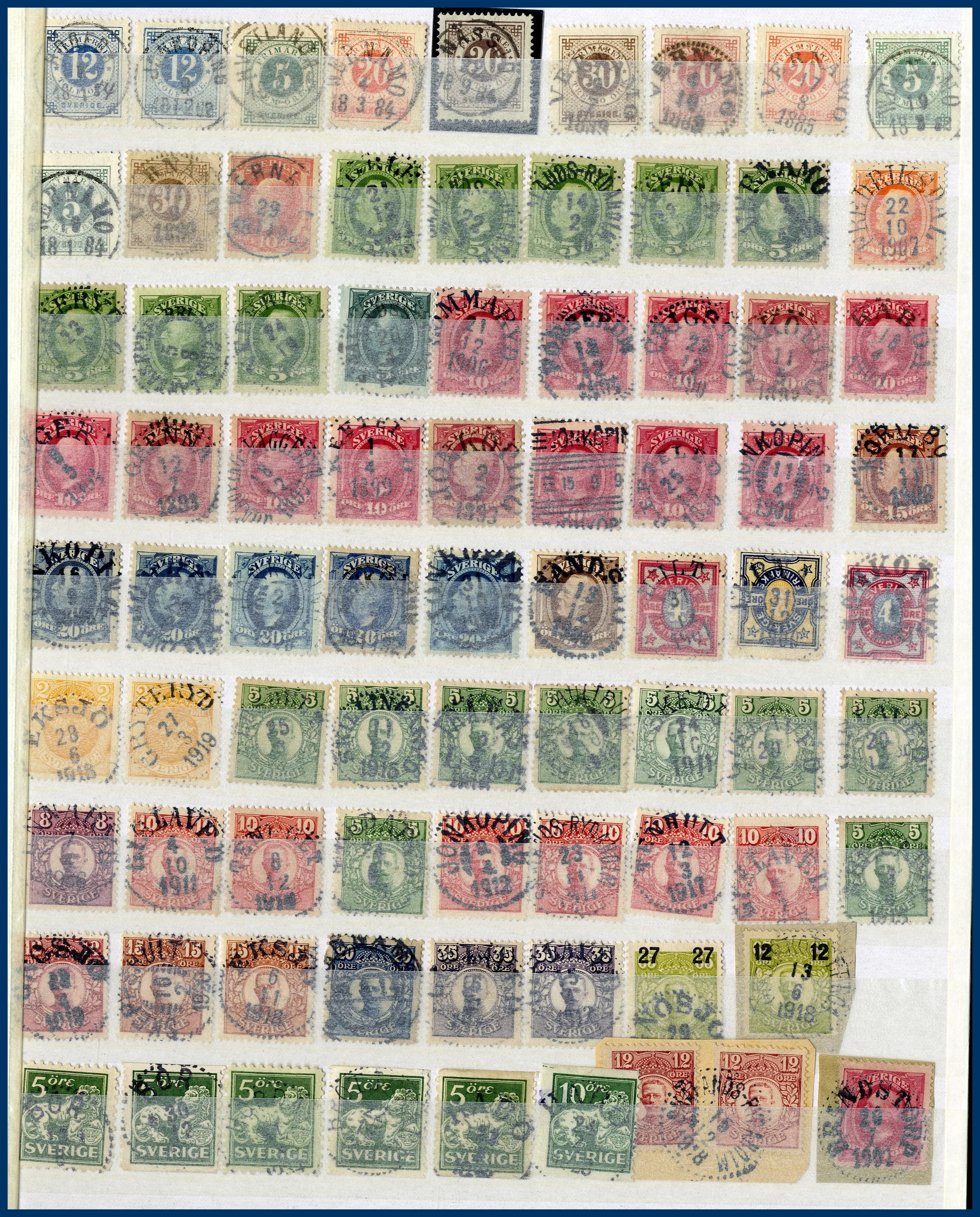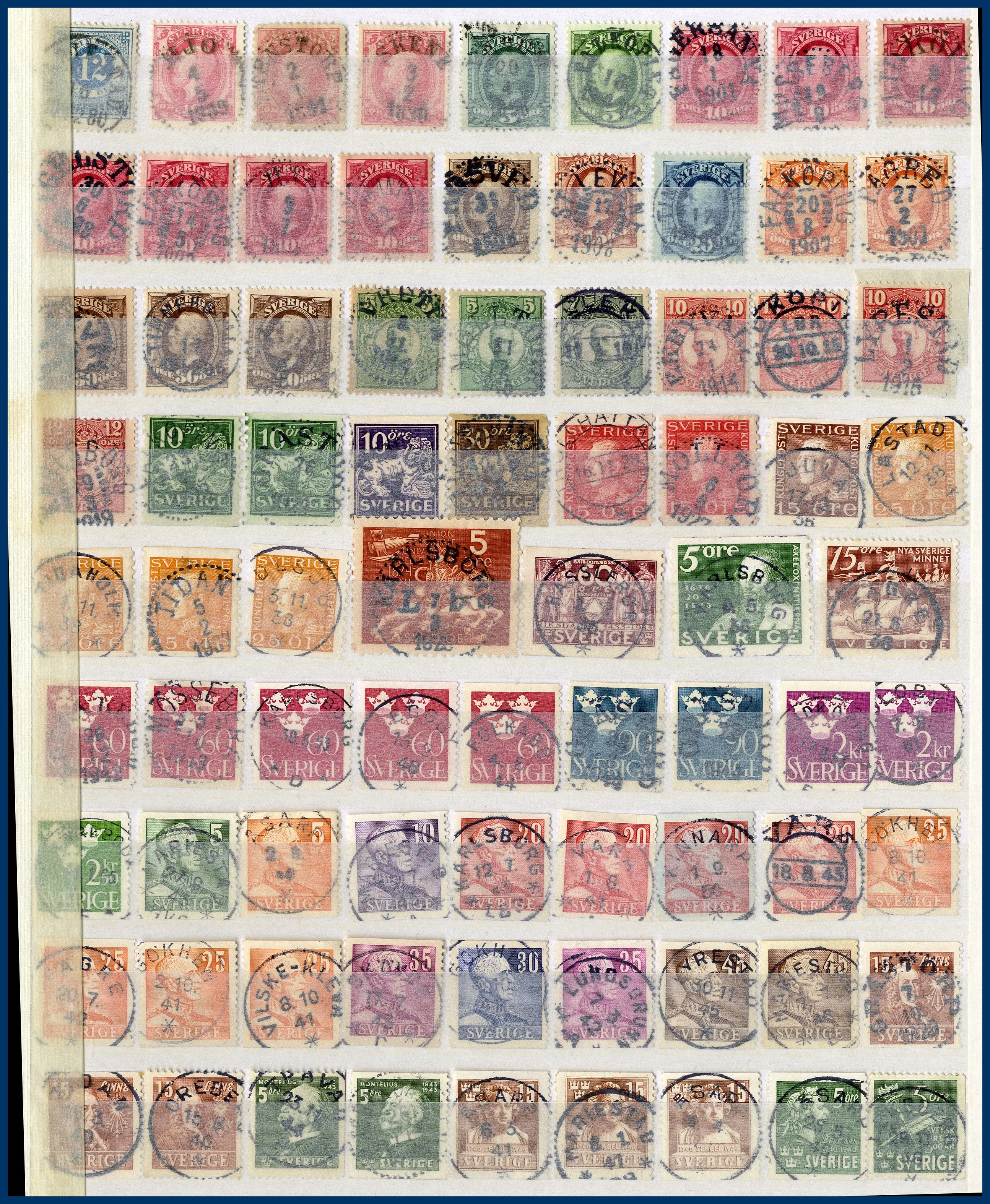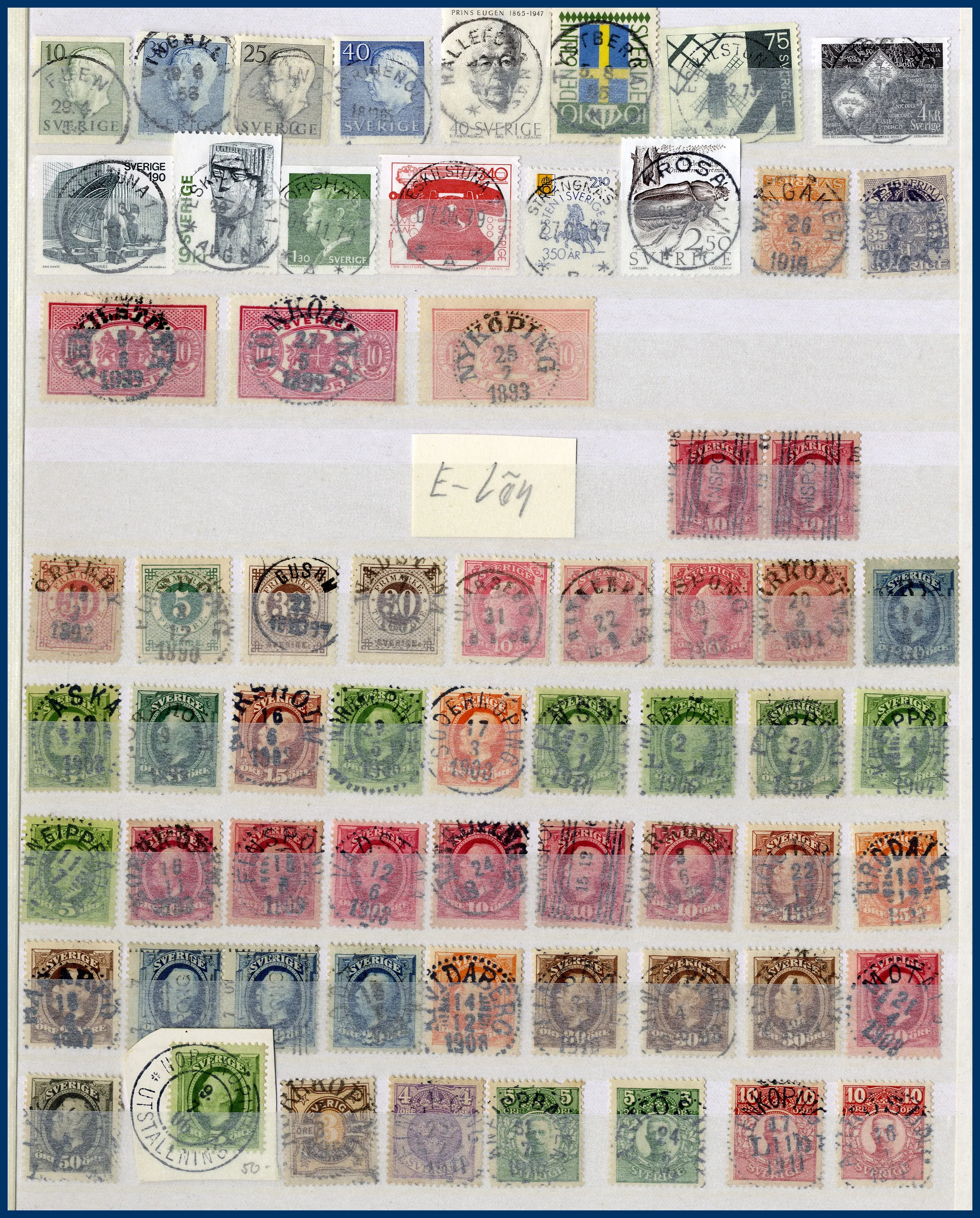 Även många 10-öres Oscarsmärken på instickskort samt modernt Prakt/Lyx i 4 urvalshäften. Totalt ca 4.000 st stämplar. I lådan ingår även några album FN, hela världen tvättat i 3 pepparkaksburkar samt en ask med 100-tals ** svenska automathäften.