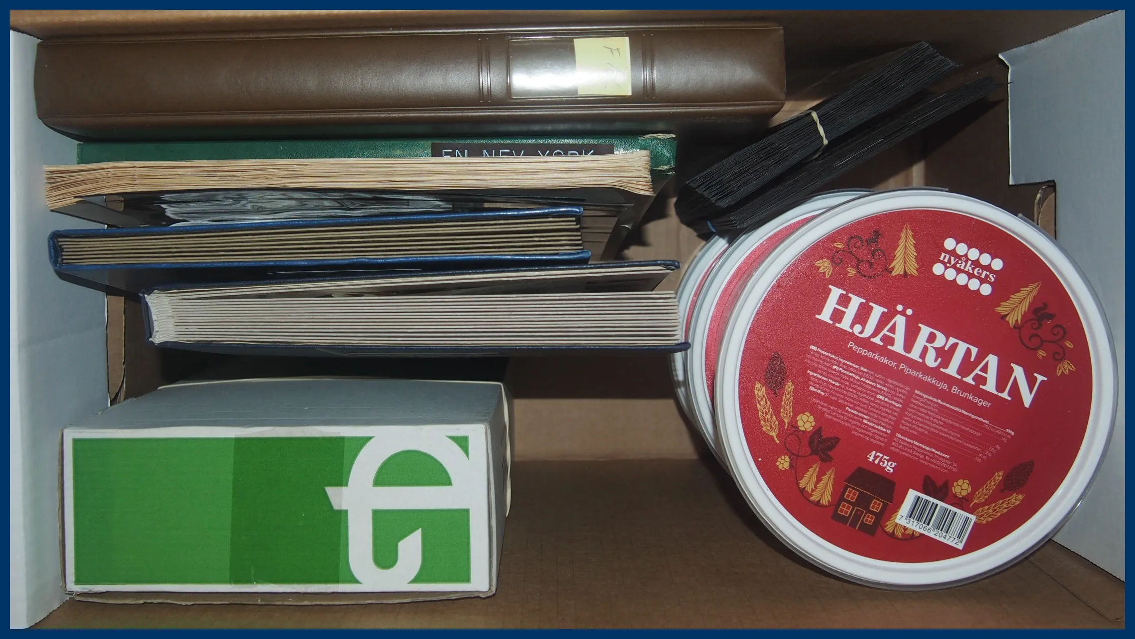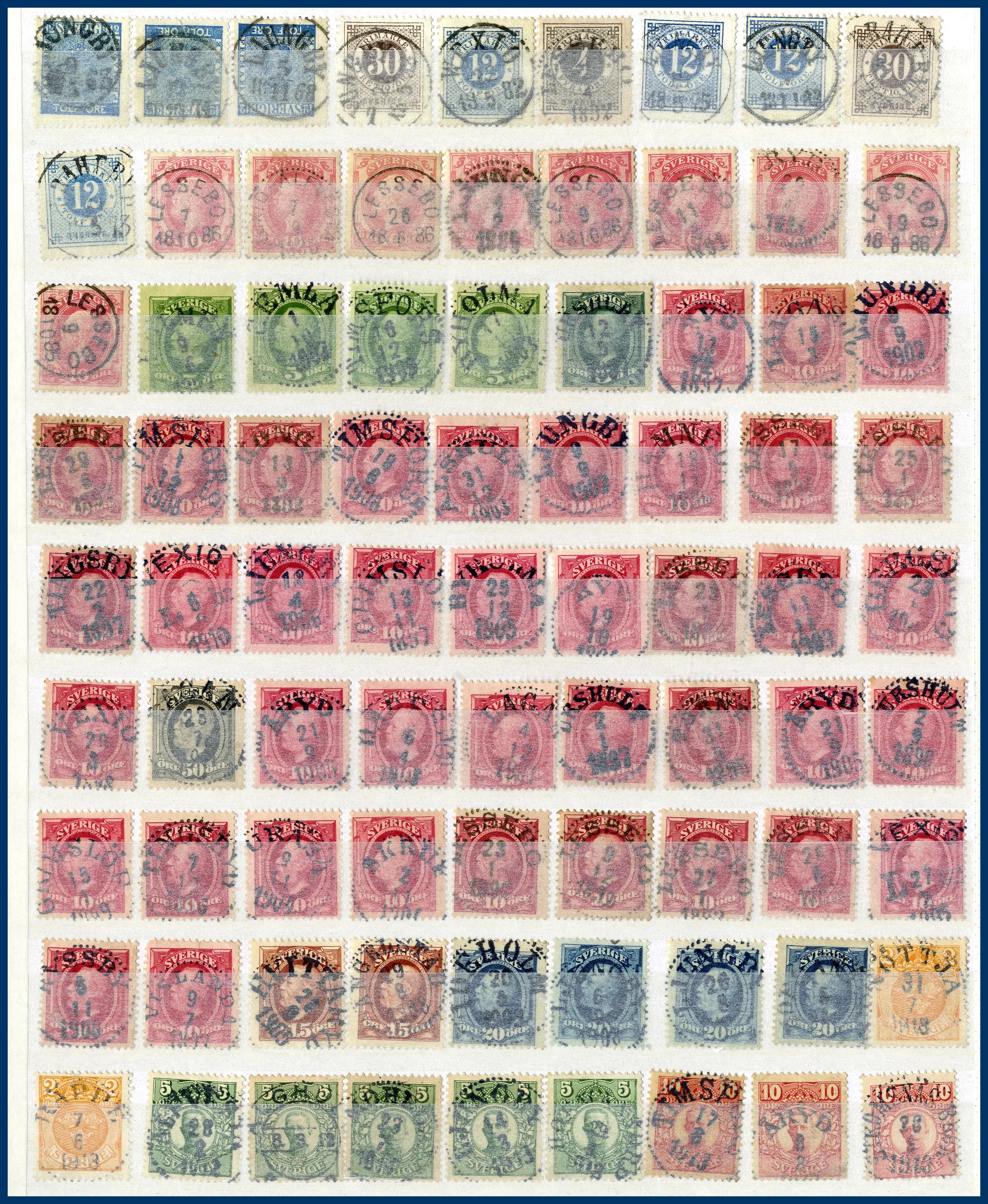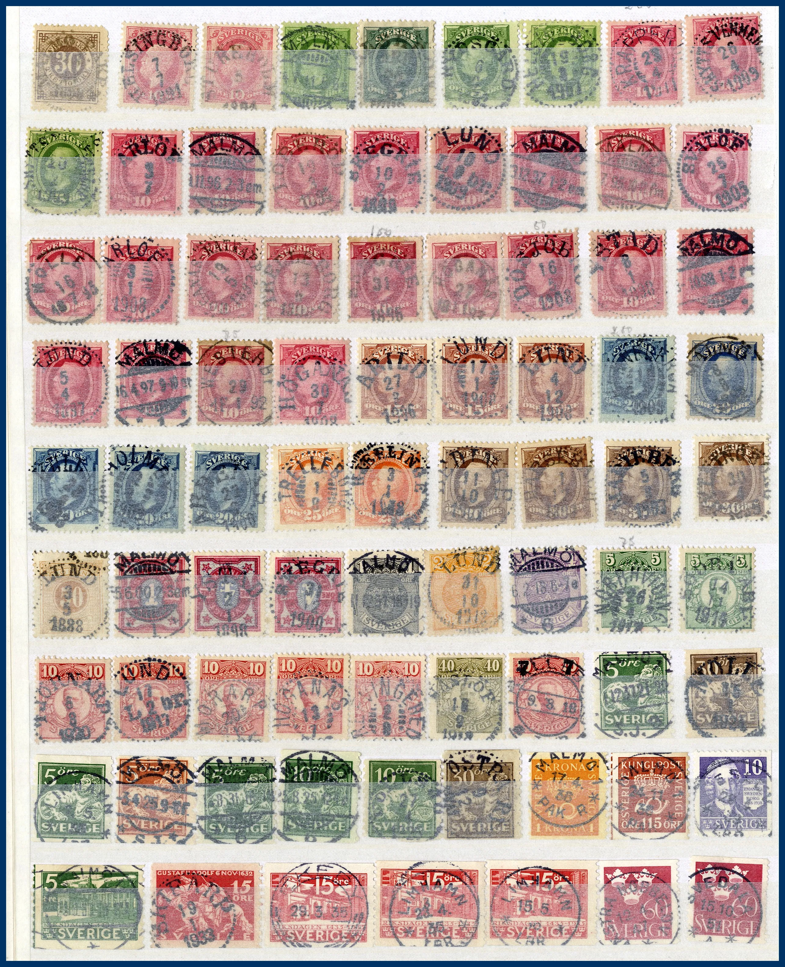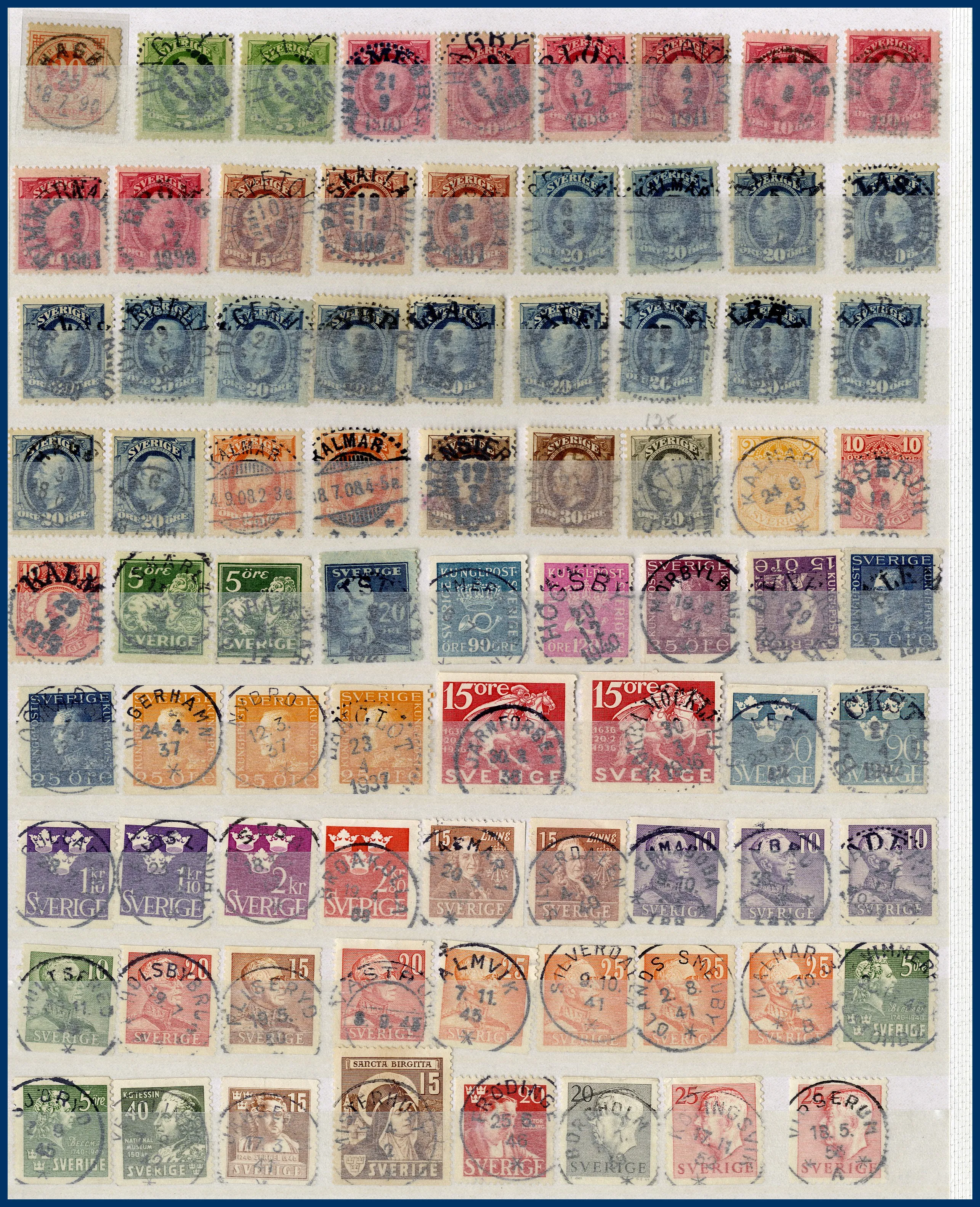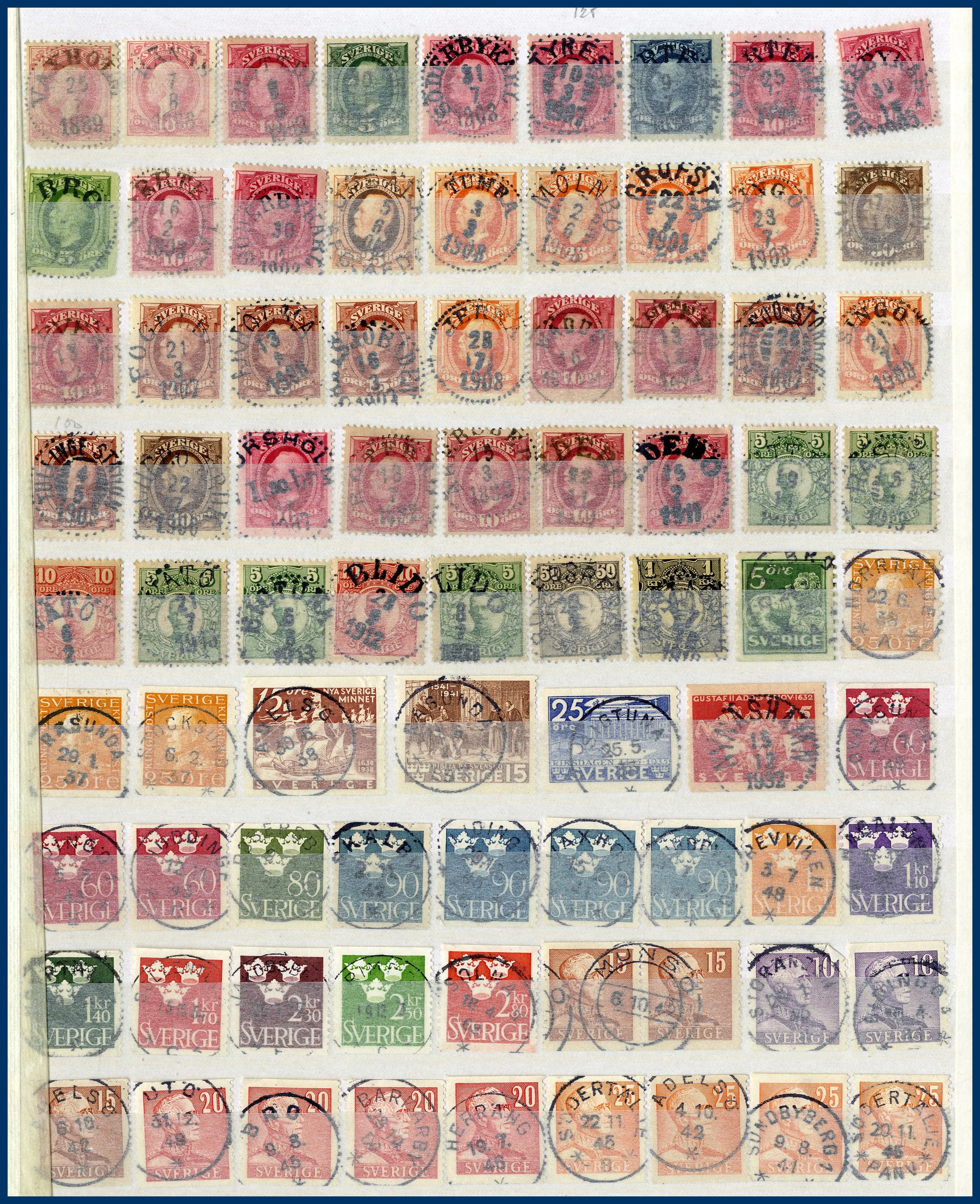 Även många 10-öres Oscarsmärken på instickskort samt modernt Prakt/Lyx i 4 urvalshäften. Totalt ca 4.000 st stämplar. I lådan ingår även några album FN, hela världen tvättat i 3 pepparkaksburkar samt en ask med 100-tals ** svenska automathäften.