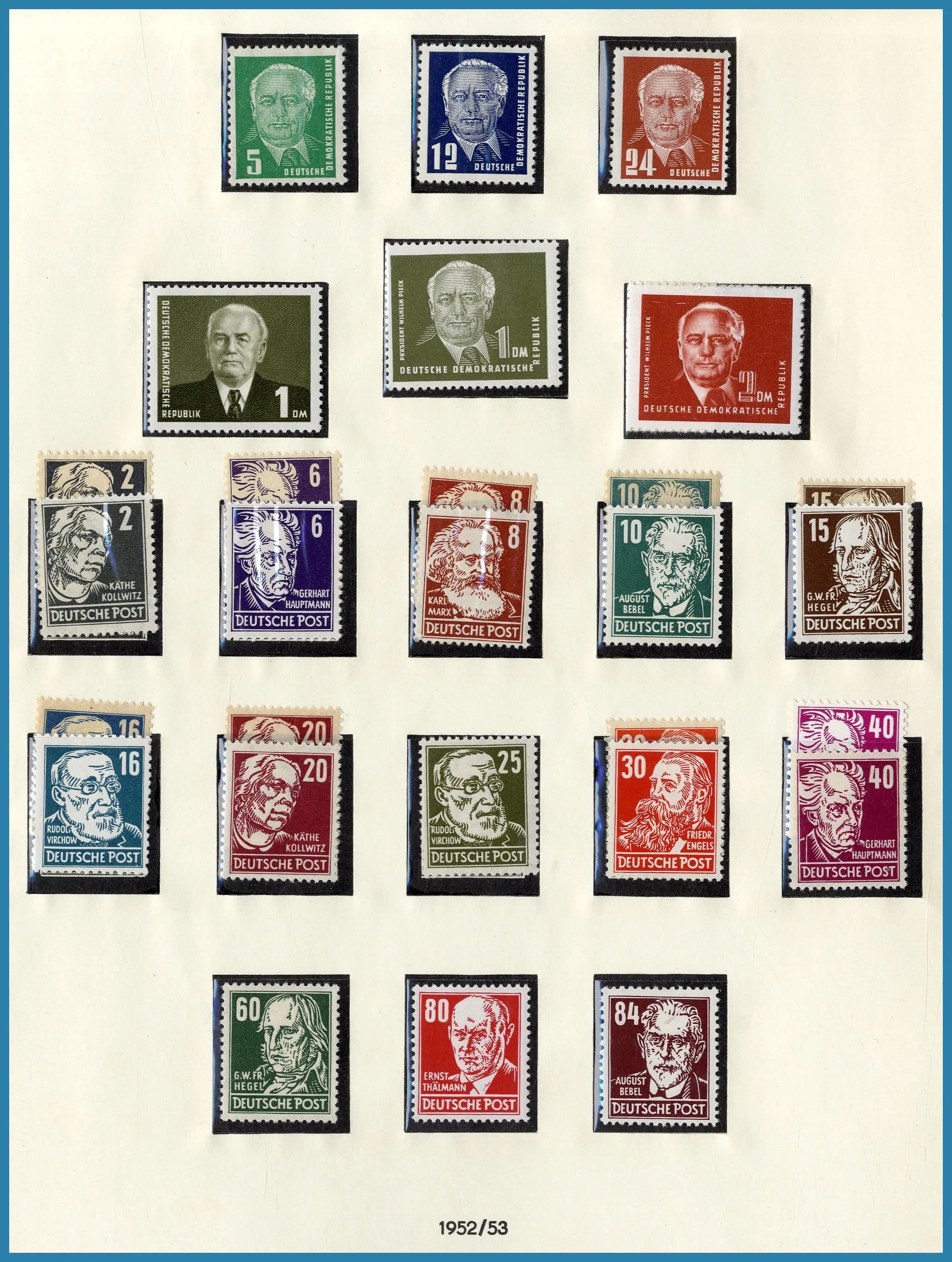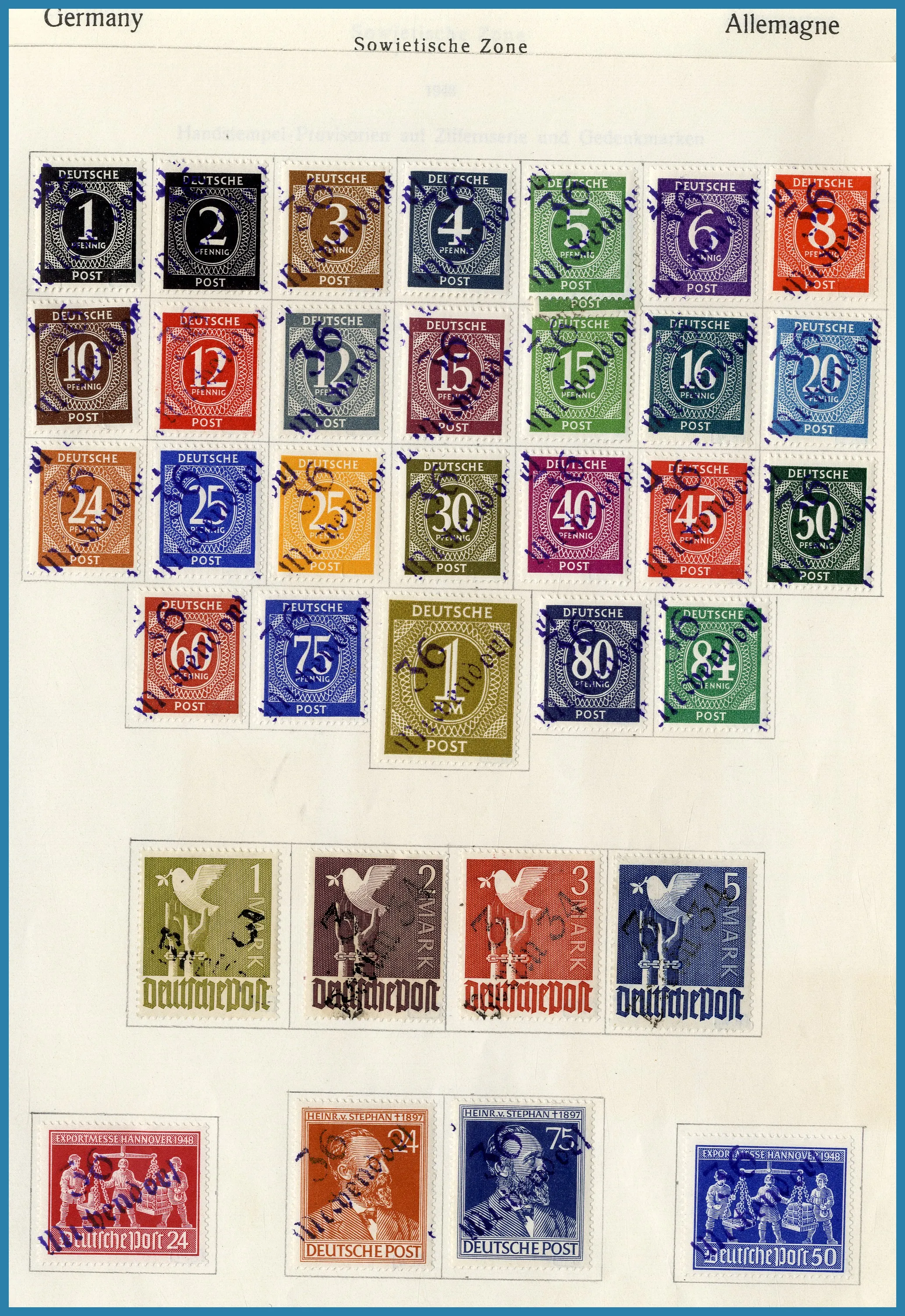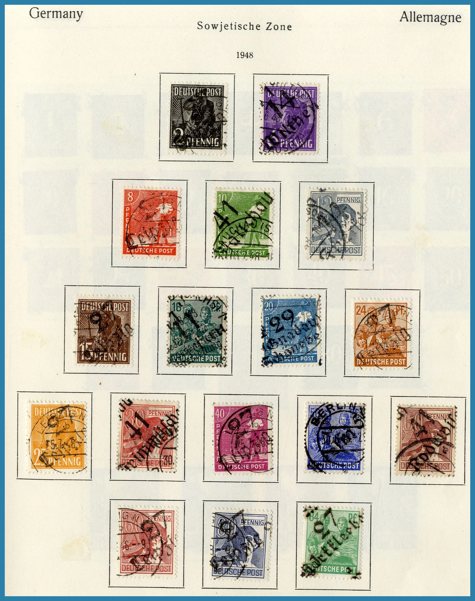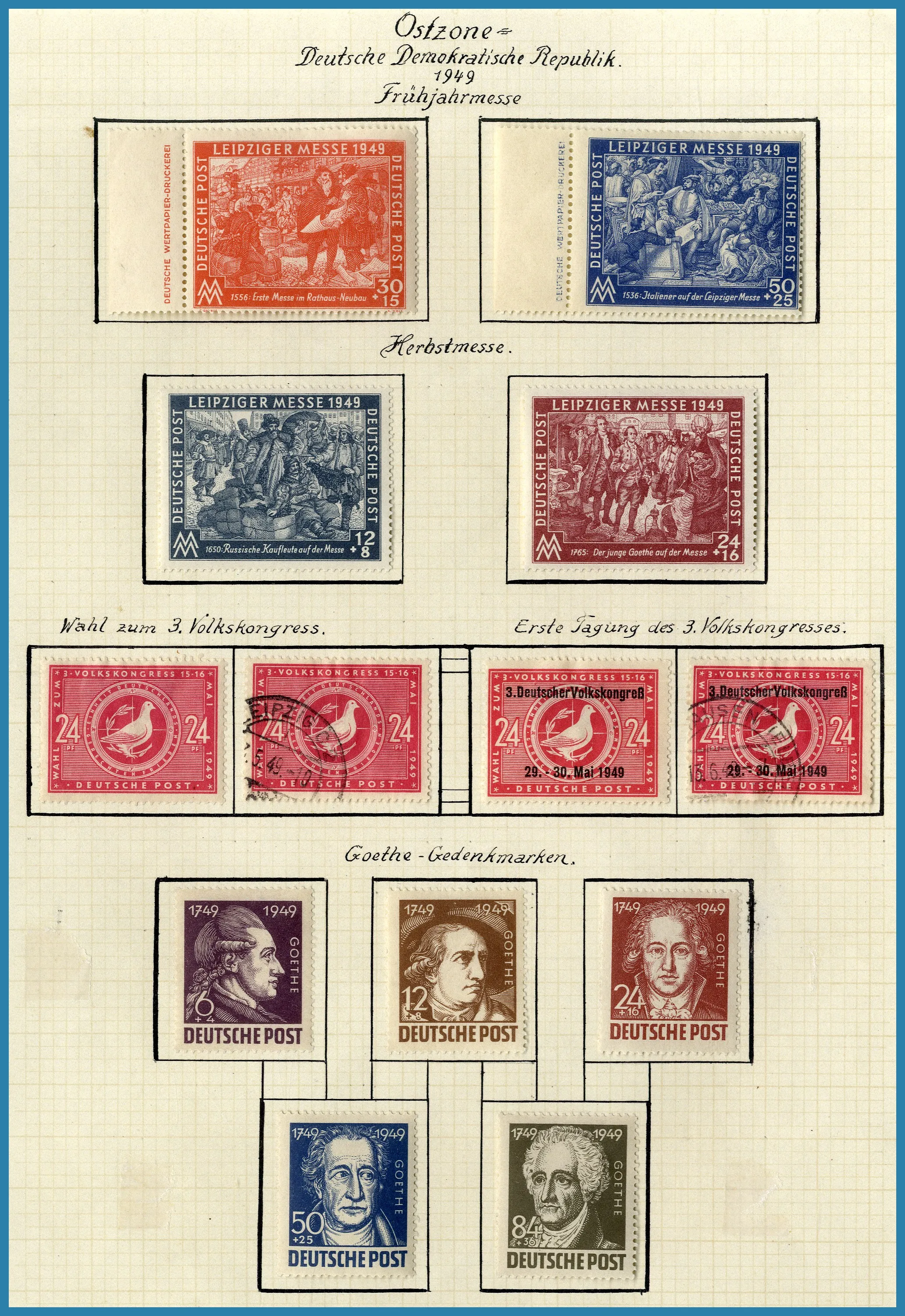 Omfattande samling övervägande **. Sovjet zonen 1945-49 är samlad både stämplat och ostämplat */**. DDR är komplett fram till 1990 troligen allt **, tjänstemärken är ej kompletta. Insticksböckerna innehåller stämplade frimärken. Sammanfattningsvis enormt mycket material. En samling som rekommenderas.
