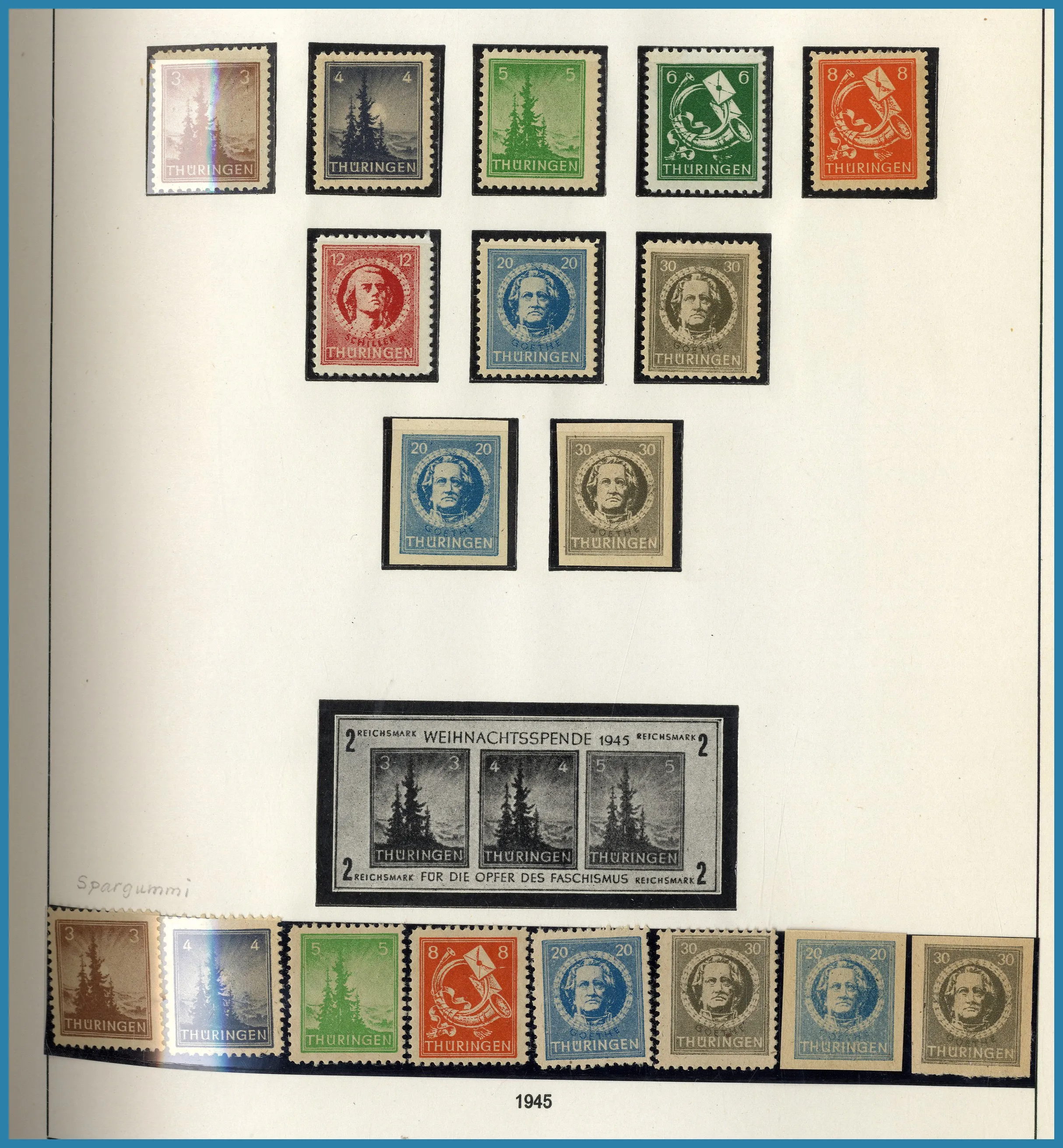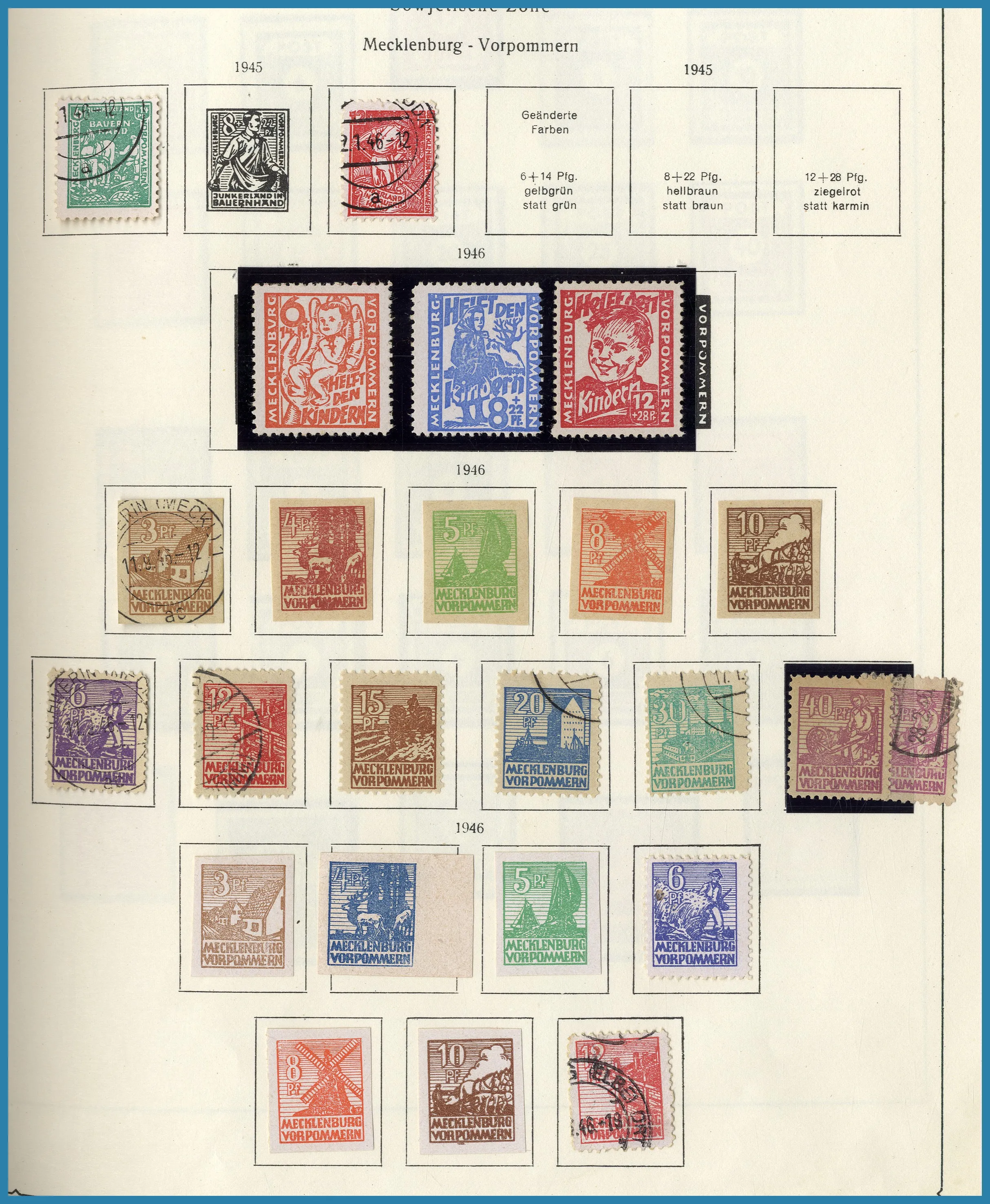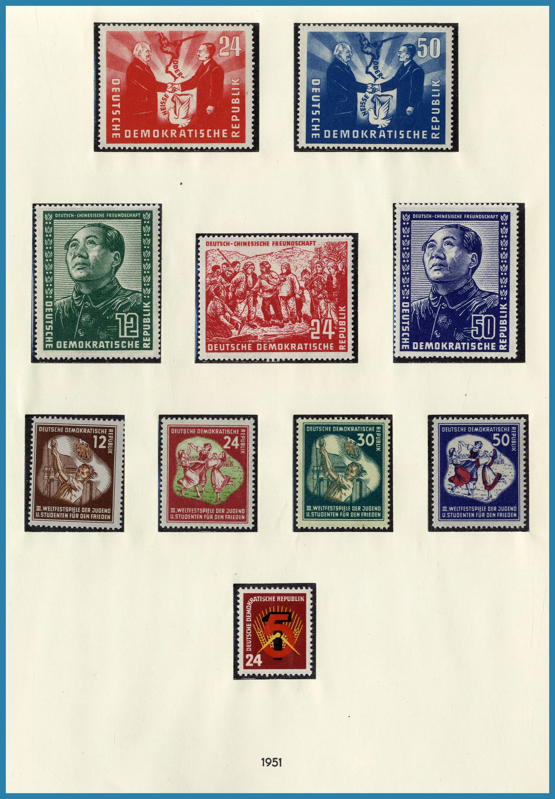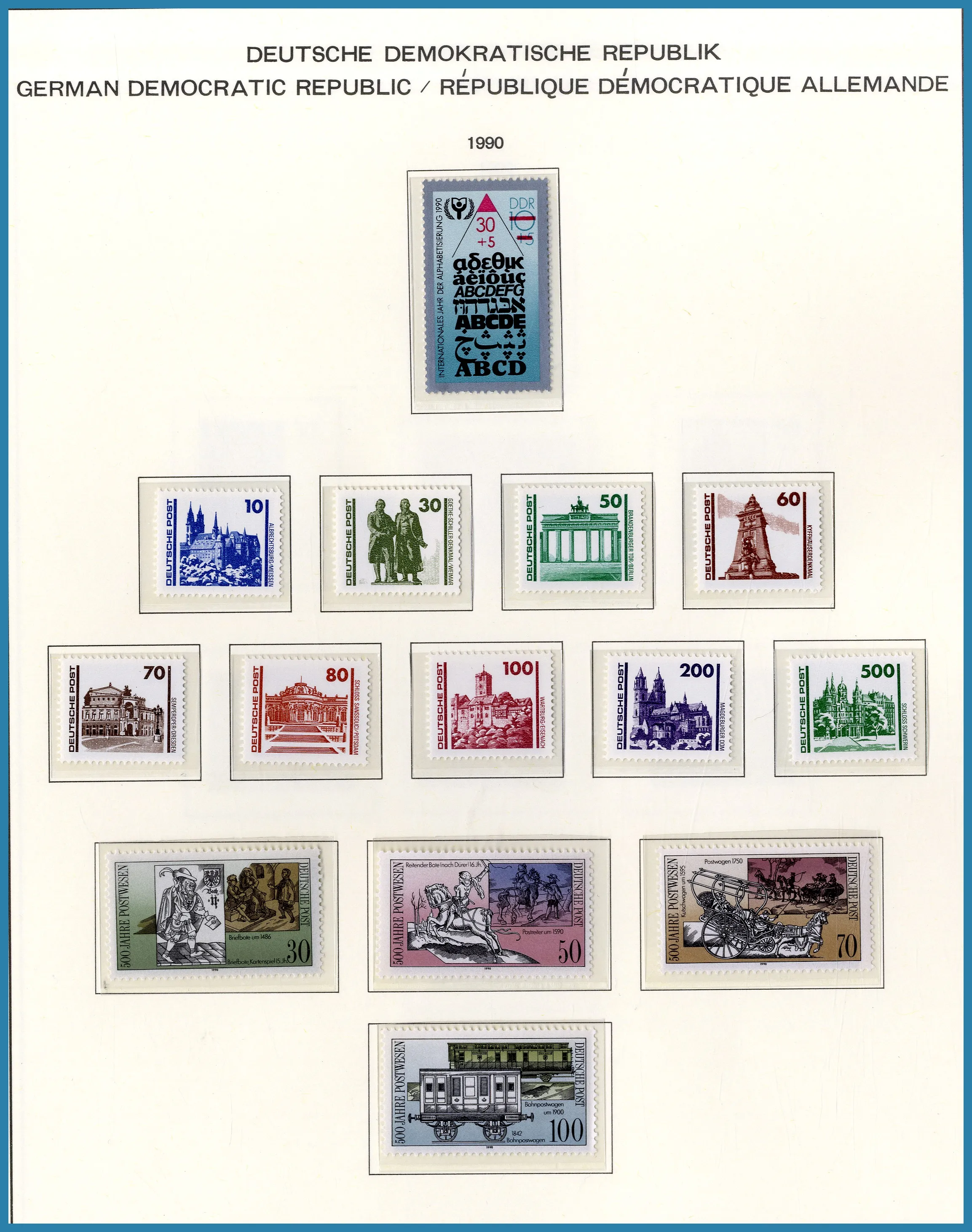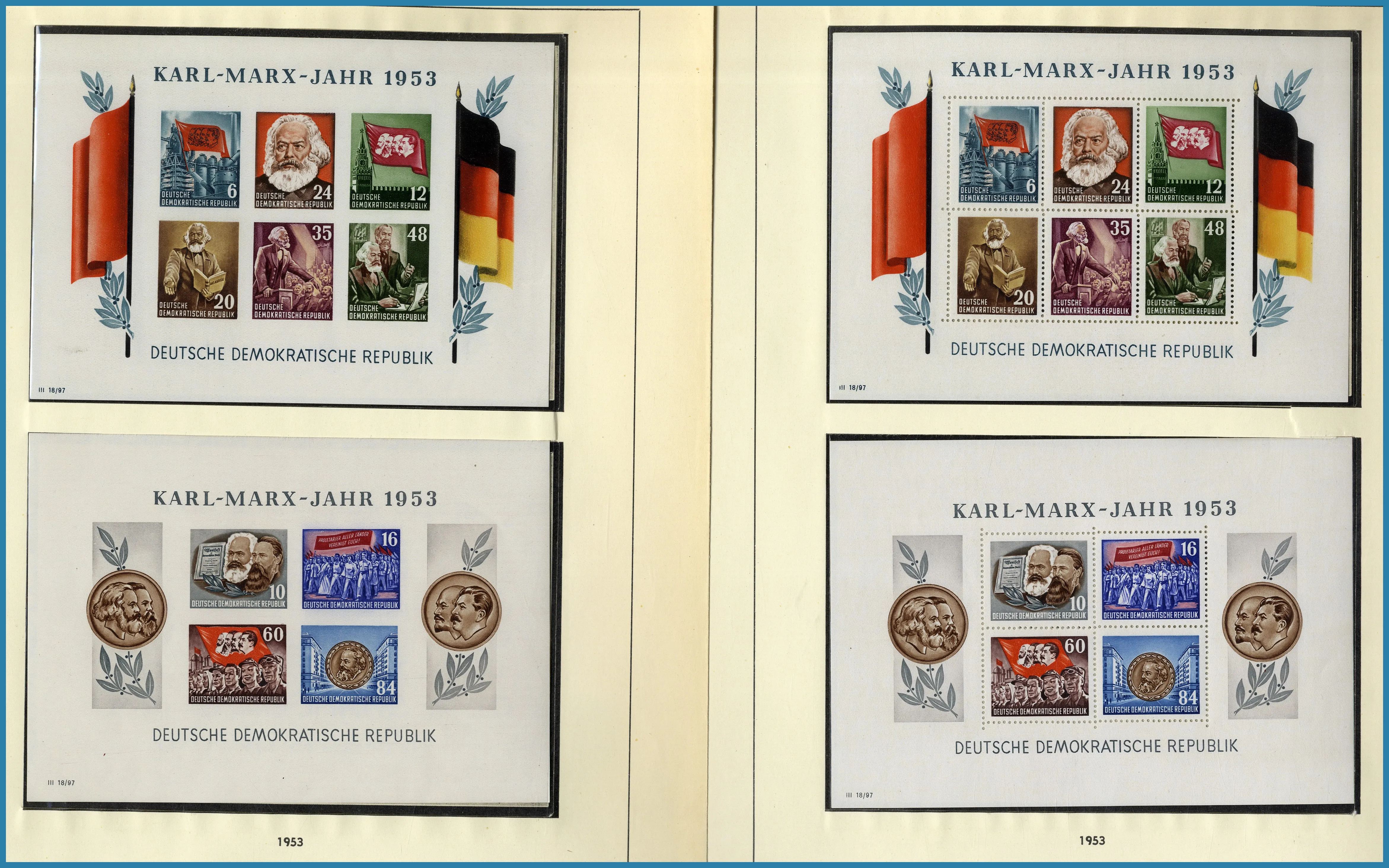 Omfattande samling övervägande **. Sovjet zonen 1945-49 är samlad både stämplat och ostämplat */**. DDR är komplett fram till 1990 troligen allt **, tjänstemärken är ej kompletta. Insticksböckerna innehåller stämplade frimärken. Sammanfattningsvis enormt mycket material. En samling som rekommenderas.