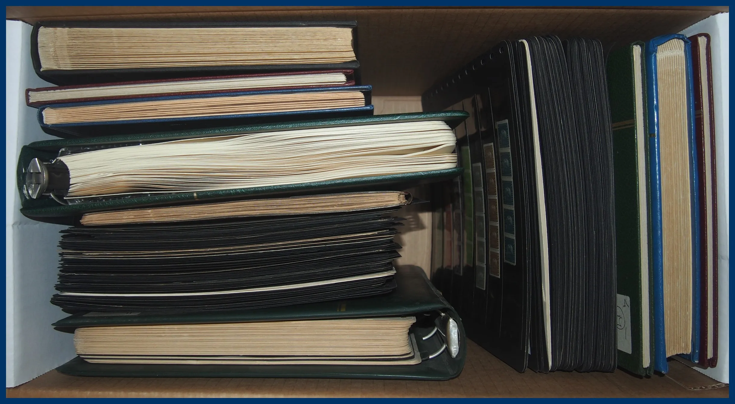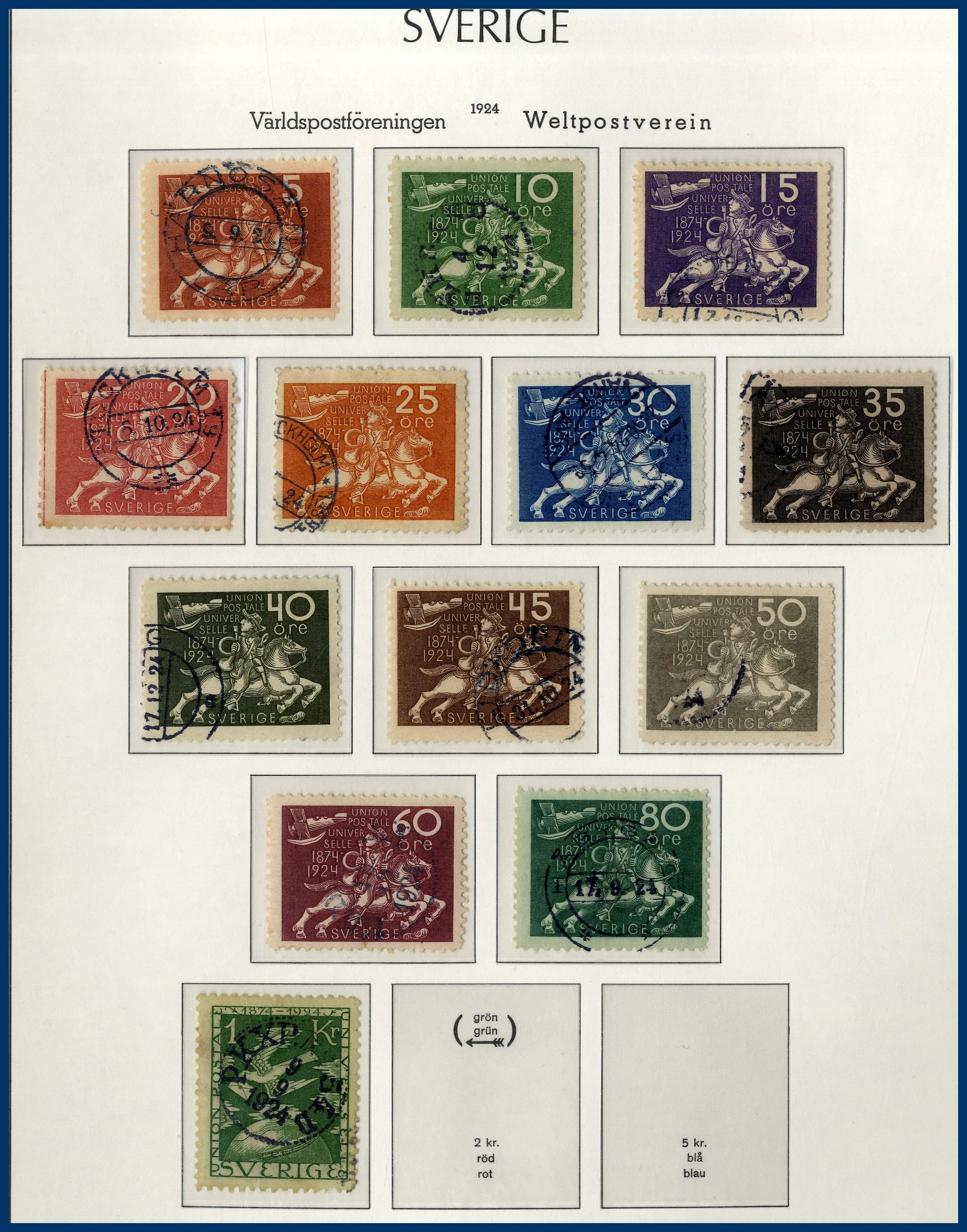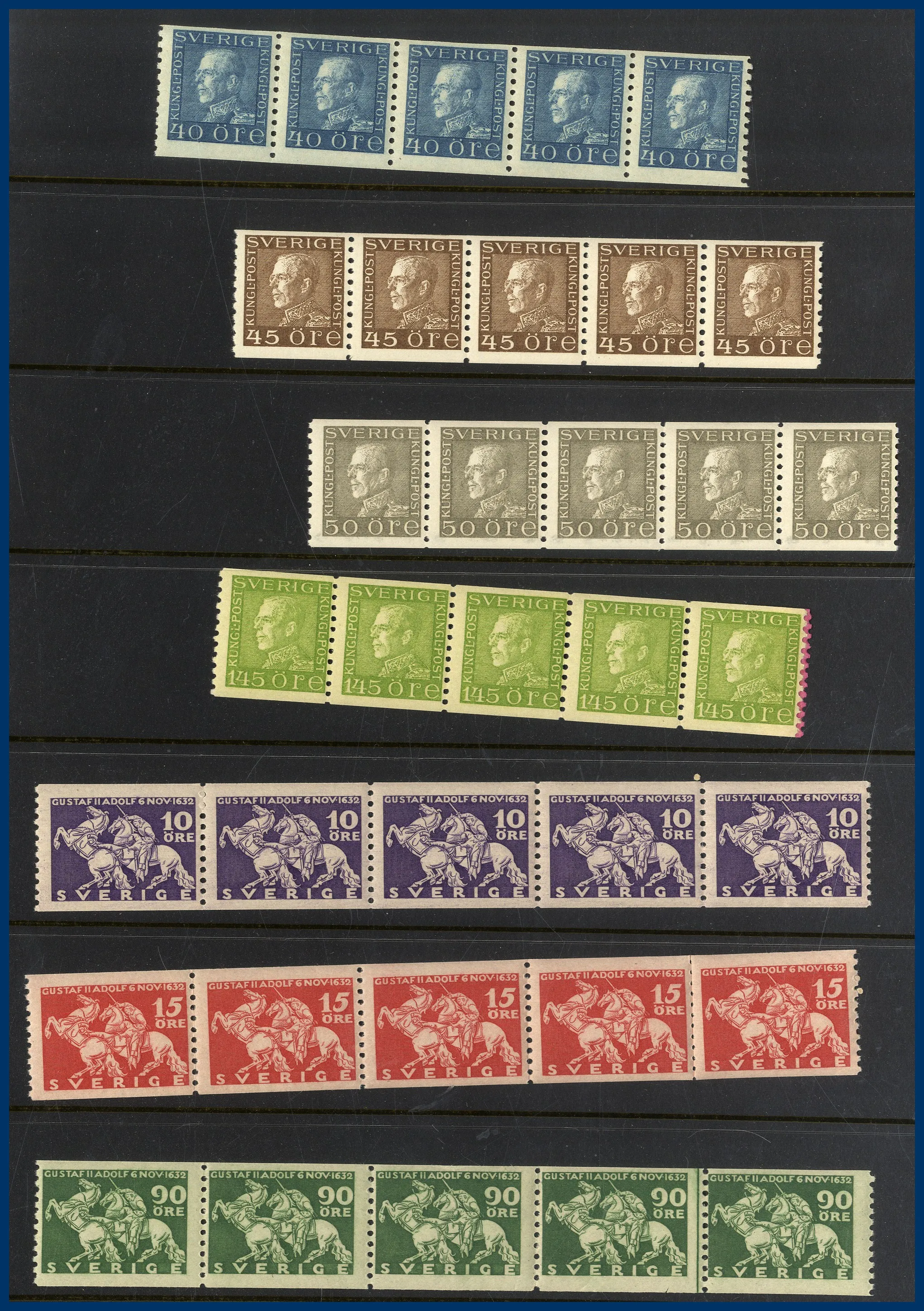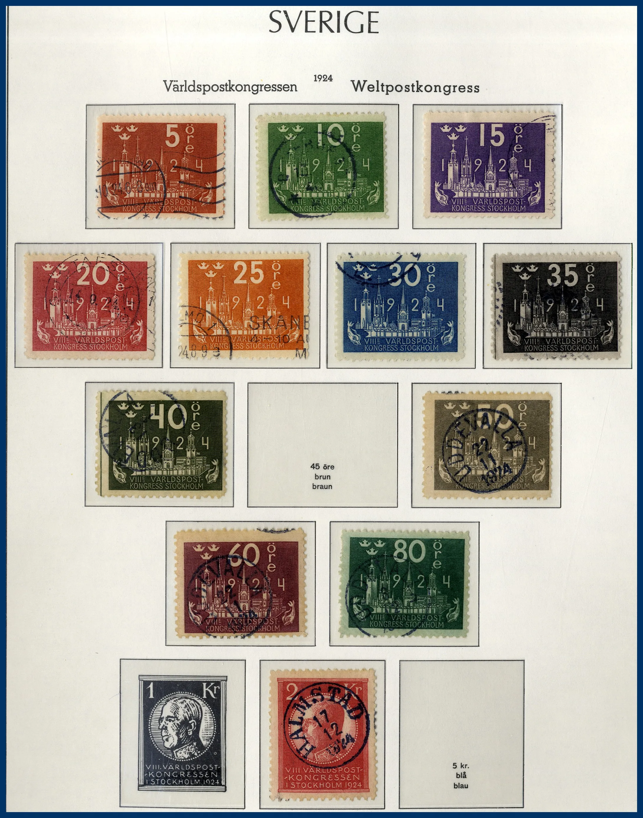 med en huvudsamling i Leuchtturmalbum med fickor, resten i 5 diversealbum + ca 100 st lösa visirblad. Även 3 album med mest ** 5-strip 1920-1960-talet.