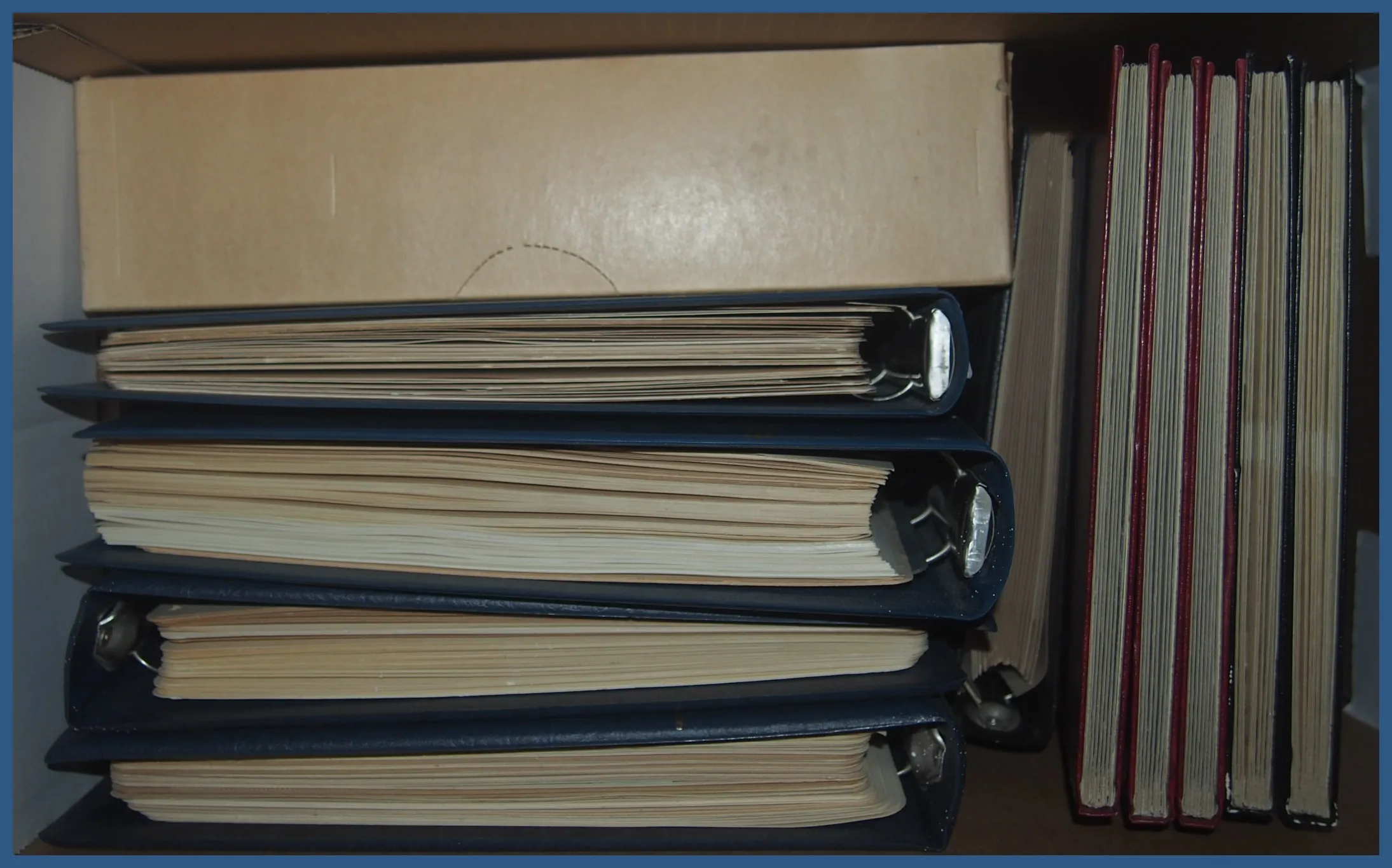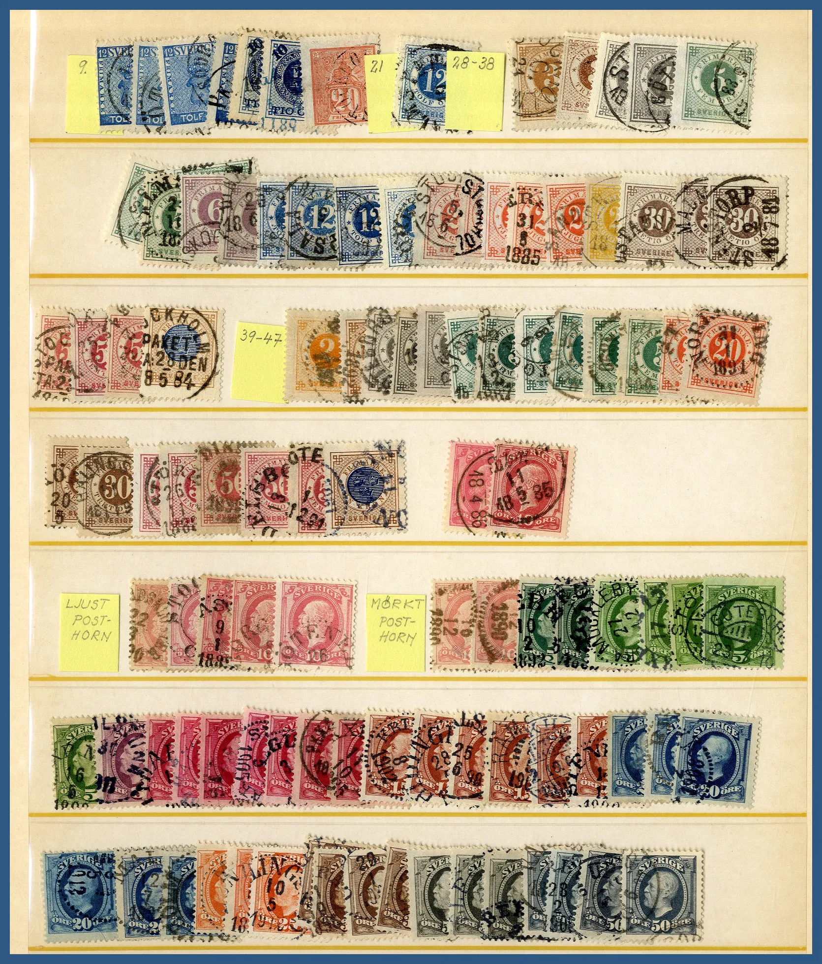 i 7 album och **/* i 3 album + mängder av pergamynkuvert med frimärken och häften i låda. Nominal drygt 4.500 kr.