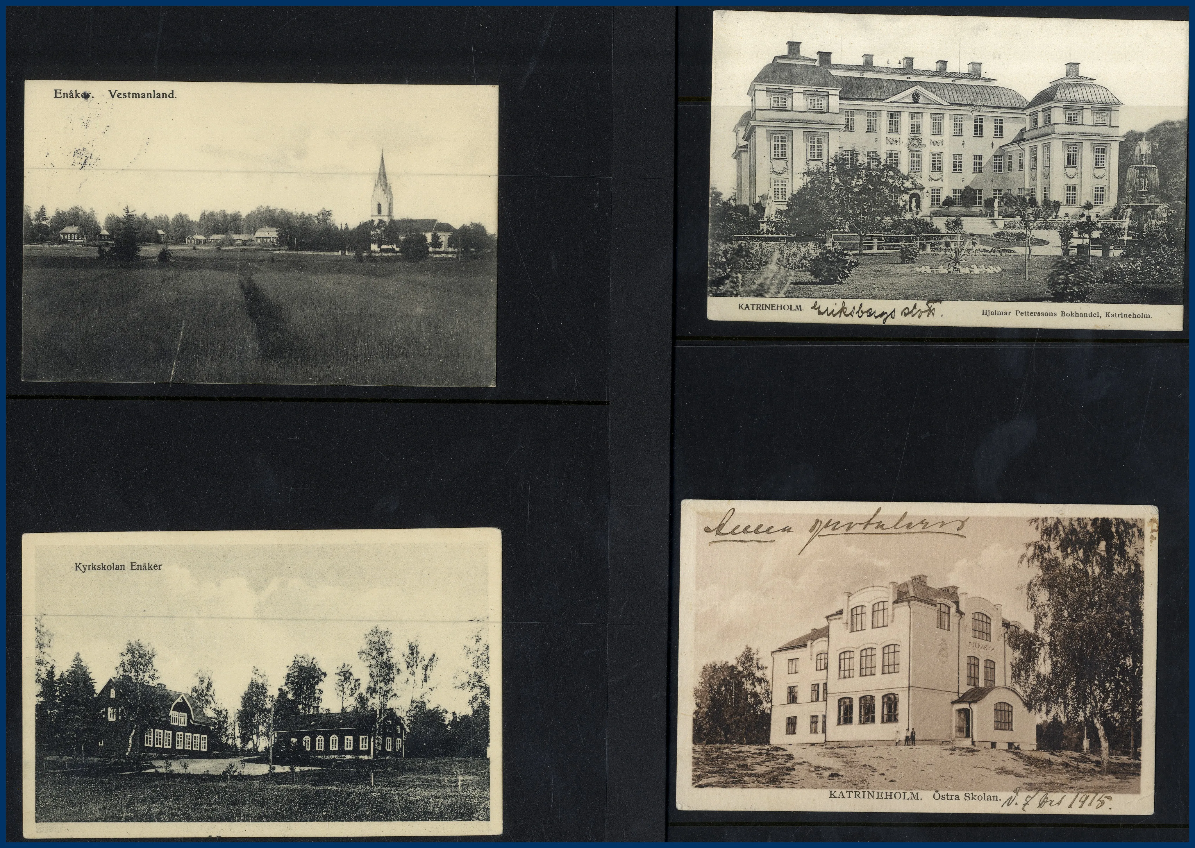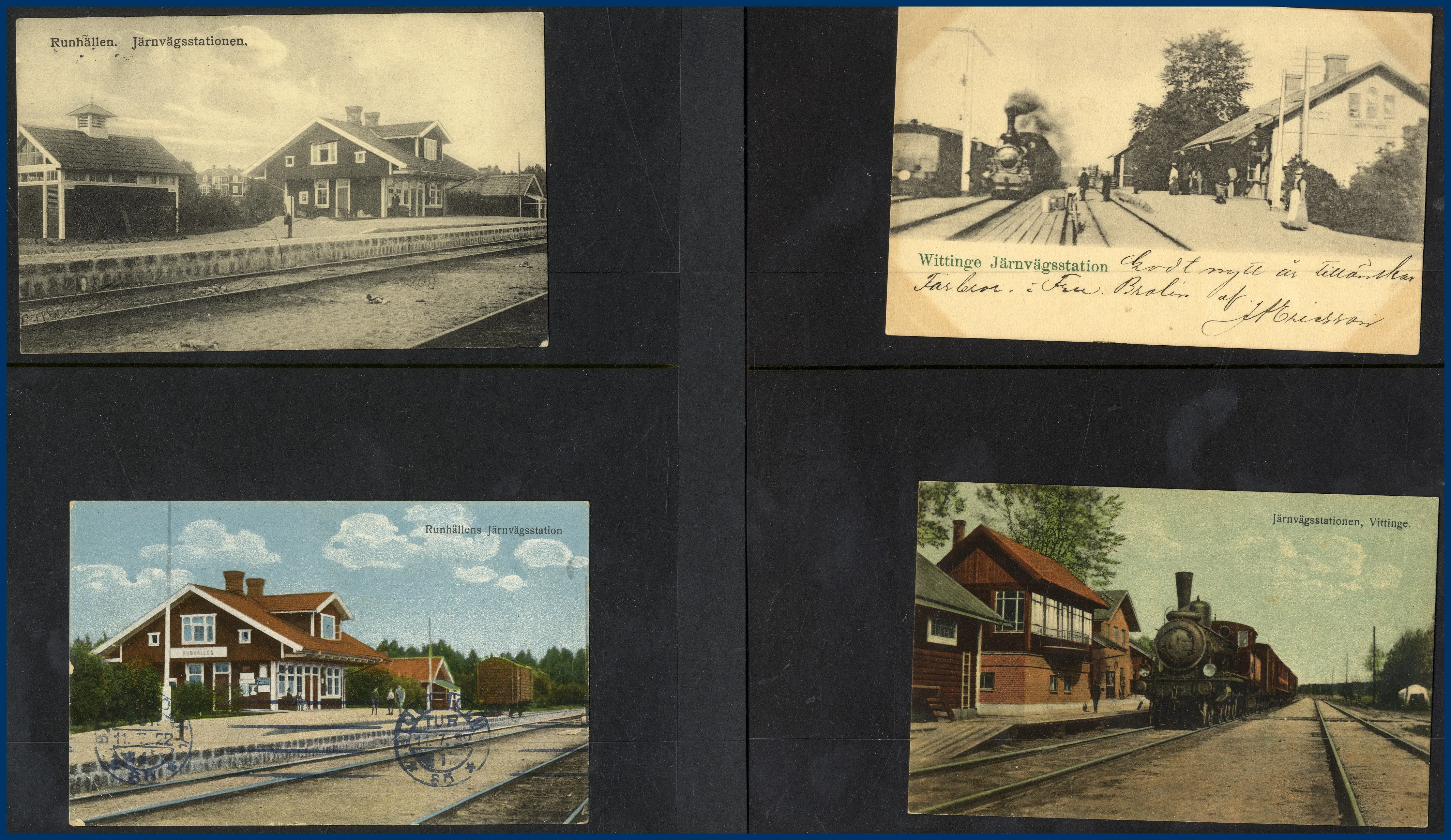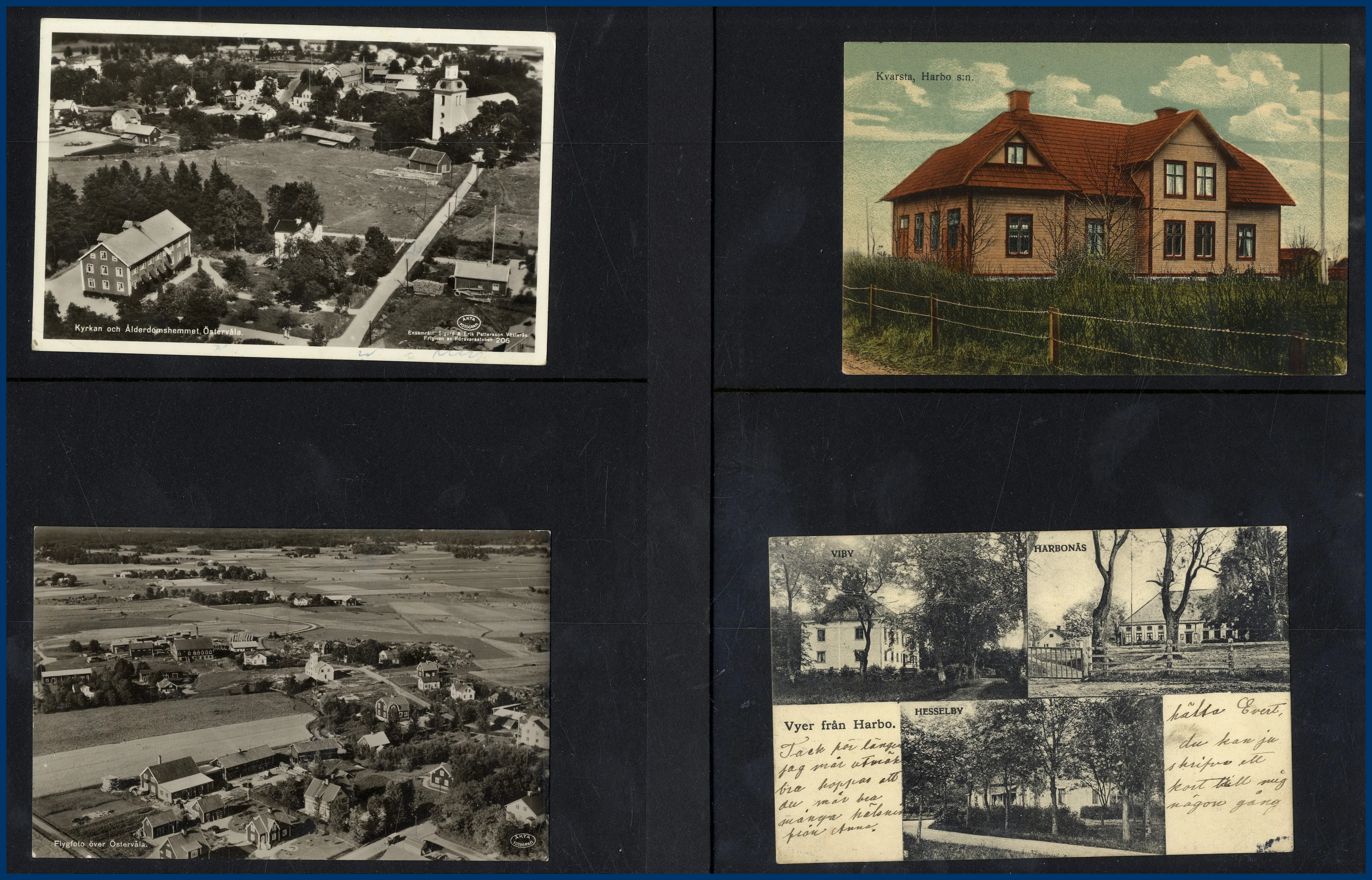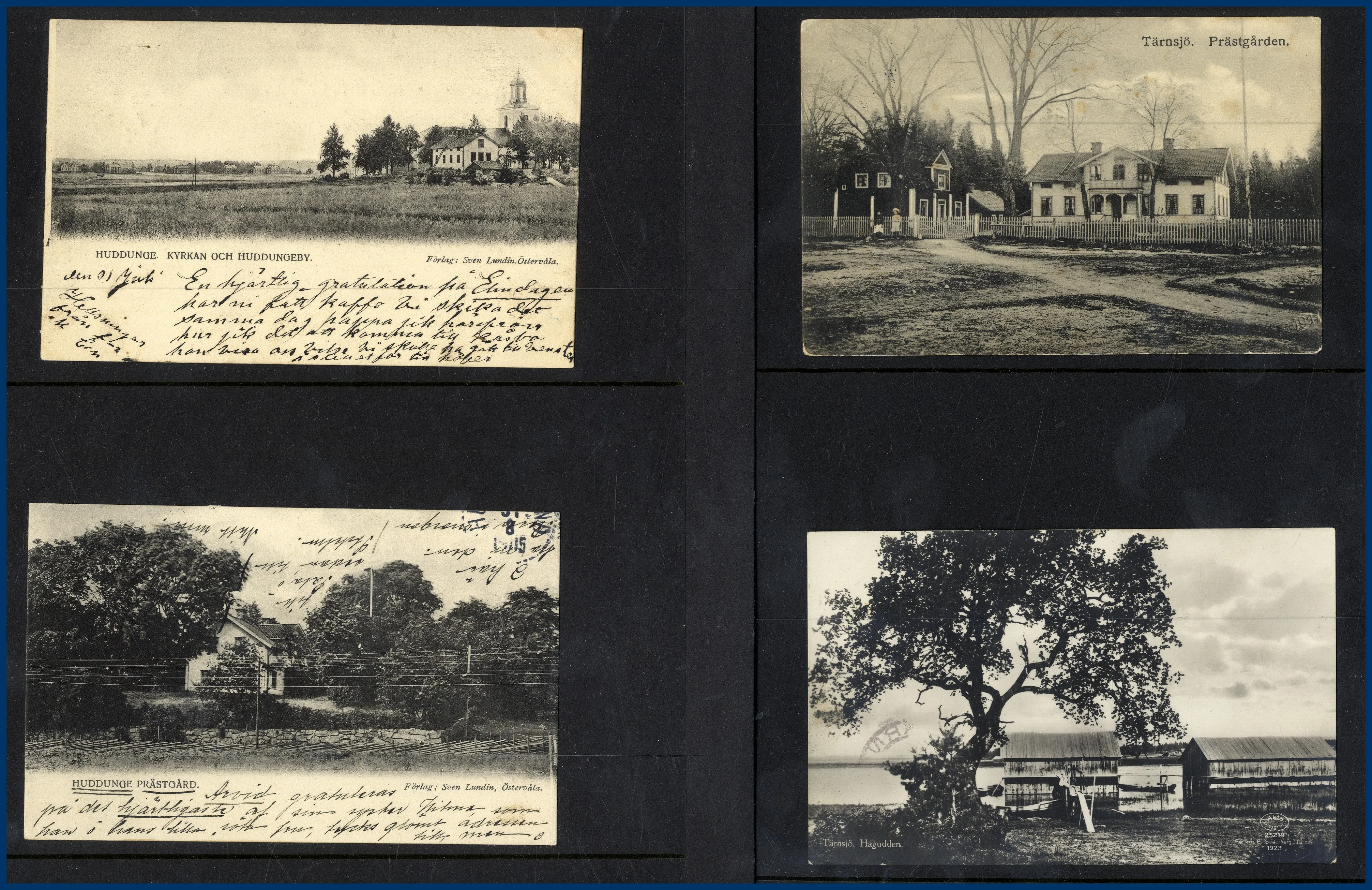 i Uppland och 1 i Södermanland (Katrineholm). Fördelning: Katrineholm 48 st, Huddunge 19 st, Tärnsjö 73 st, Morgongåva 34 st, Östervåla 23 st, Runhällen 13 st, Harbo 7 st, Vittinge 10 st, Enåker 15 st. En mycket klar majoritet av korten är av gamla formatet med enstaka dubbletter. Korten är i allmänhet monterade på visirblad med 2 fickor. Många lite bättre kort. Till den här posten hör också en plastlåda med några hundra vykort från hela Sverige sorterade landskapsvis, mestadels nya formatet.