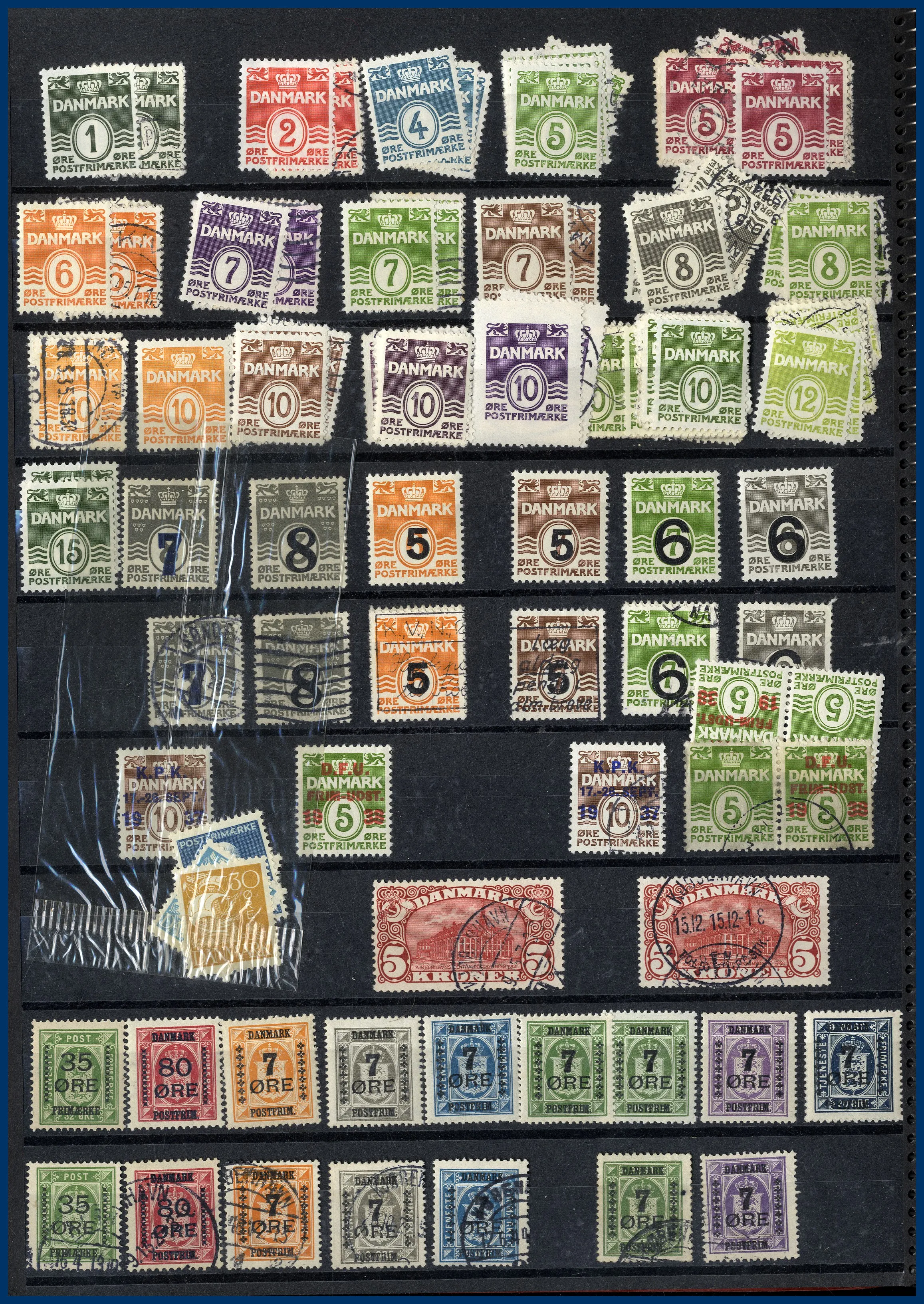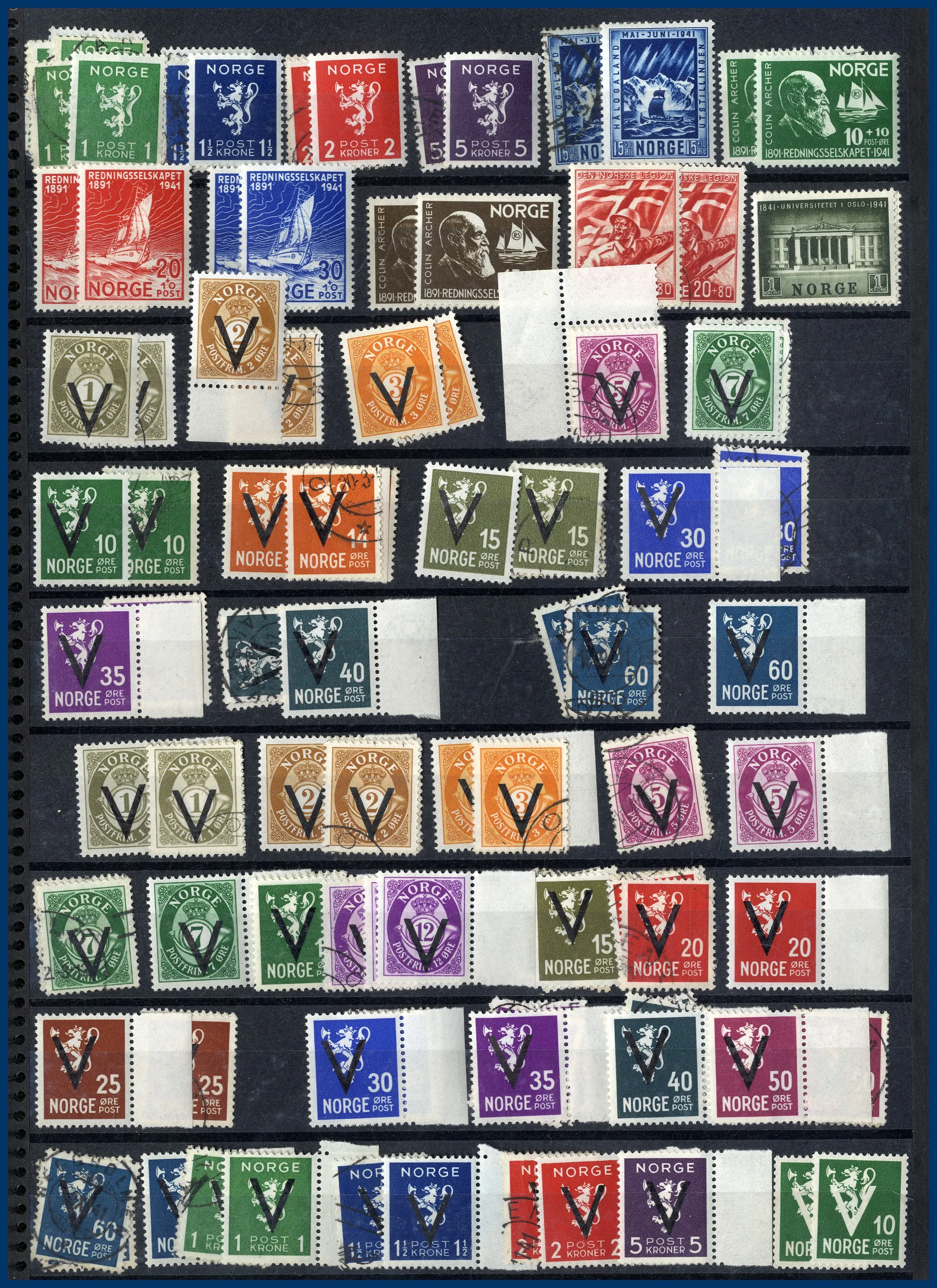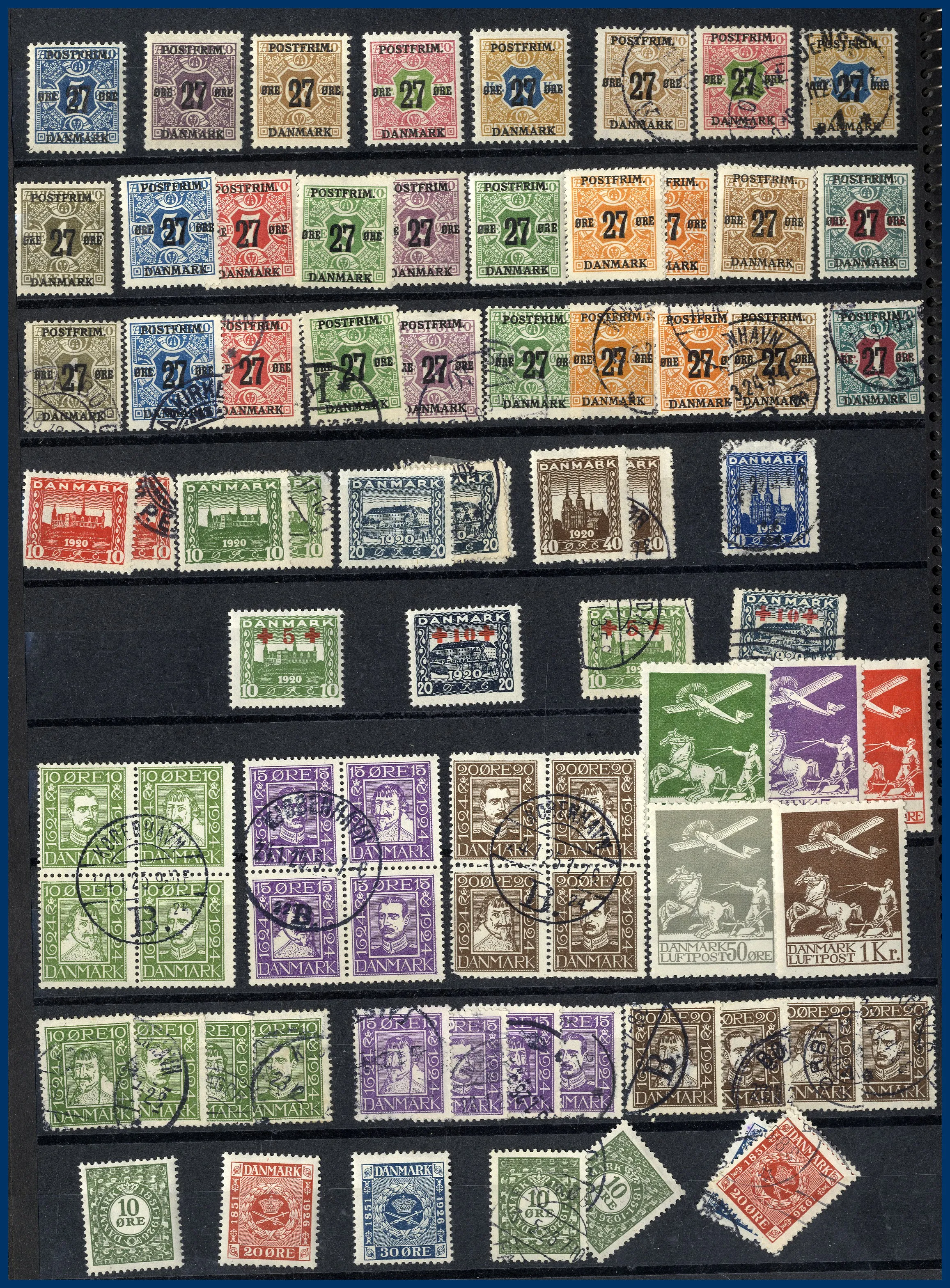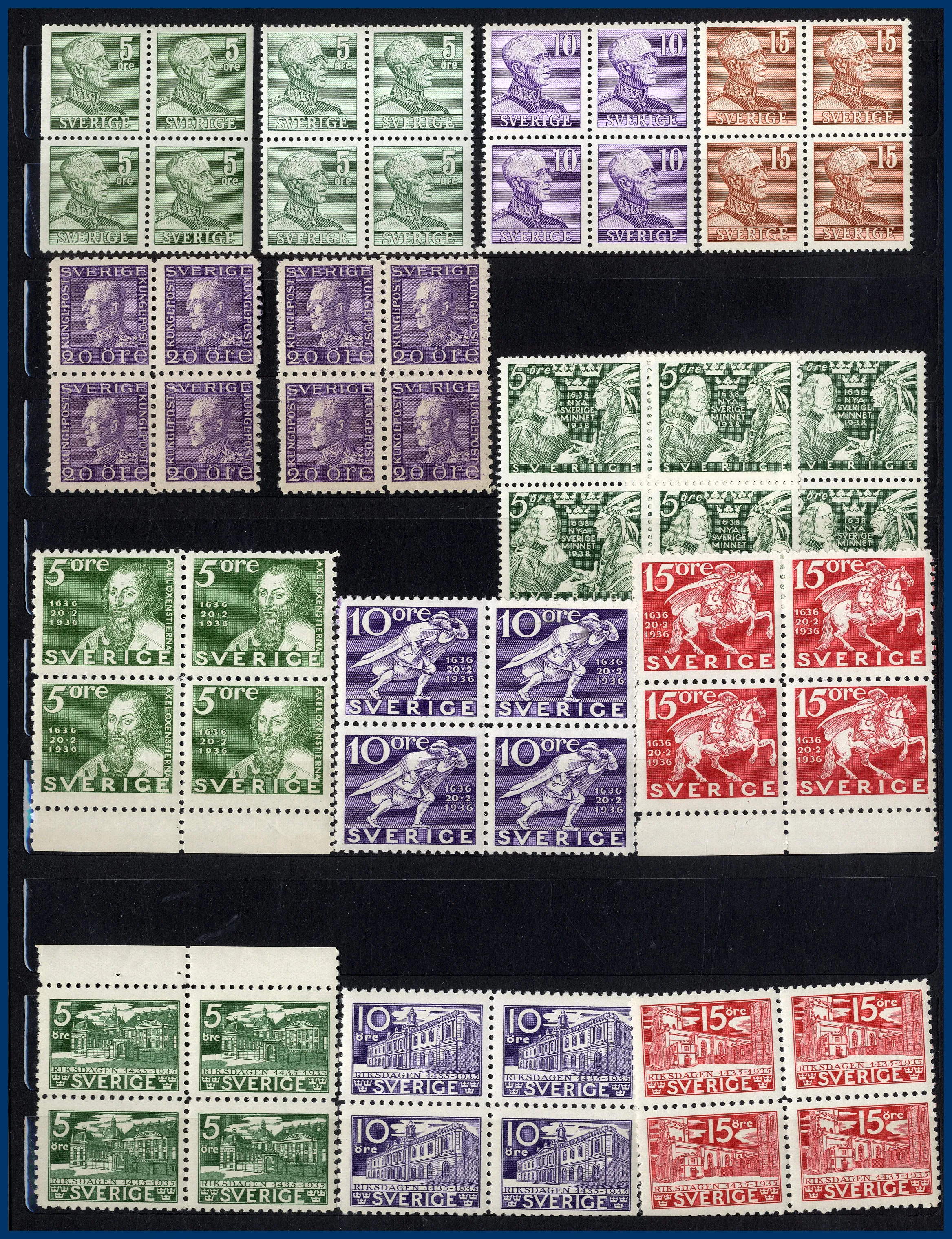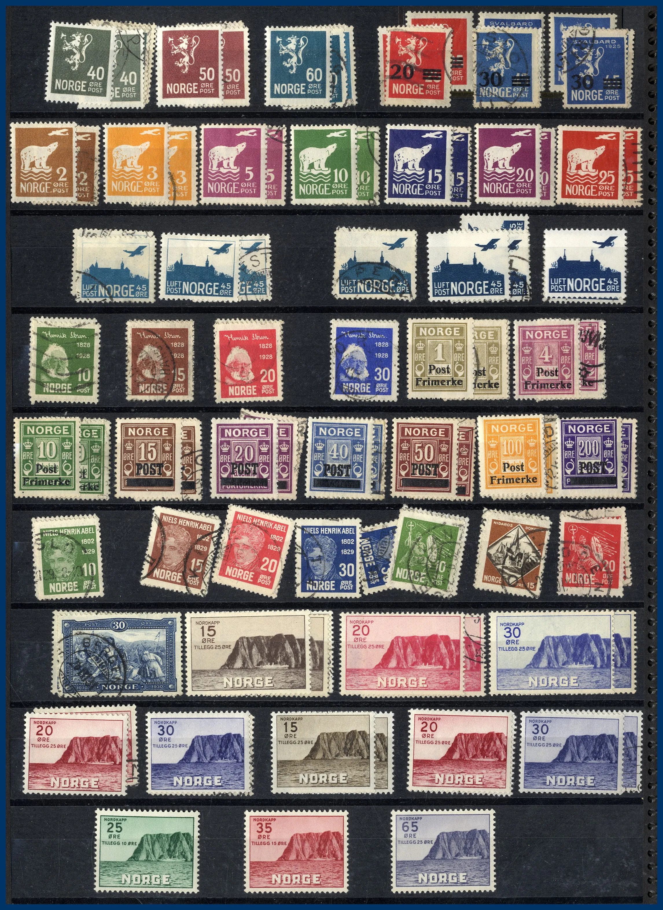 Klassiskt till 1960-talet + mapp med helark bl a Danmark 2 st 5 Kr Centralposthuset samt Luftpost 1925 * komplett etc. Även 2 pergamynlådor med stämplade dubbletter sorterade efter valör av Postemblem samt Profil vänster. 33 st svenska ** årssatser 1975-1986 med en Nominal av 2.900 kr. Även samling FN med block 1 samt Europa CEPT.