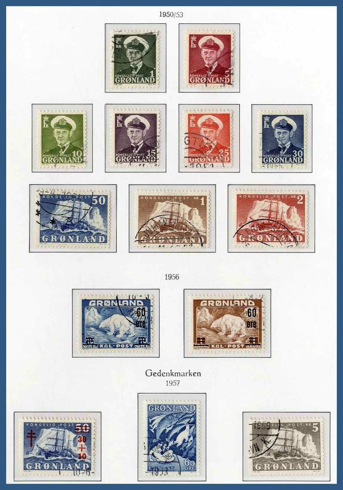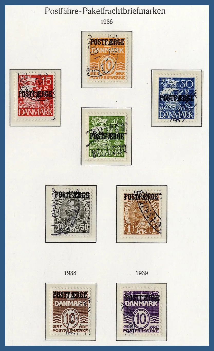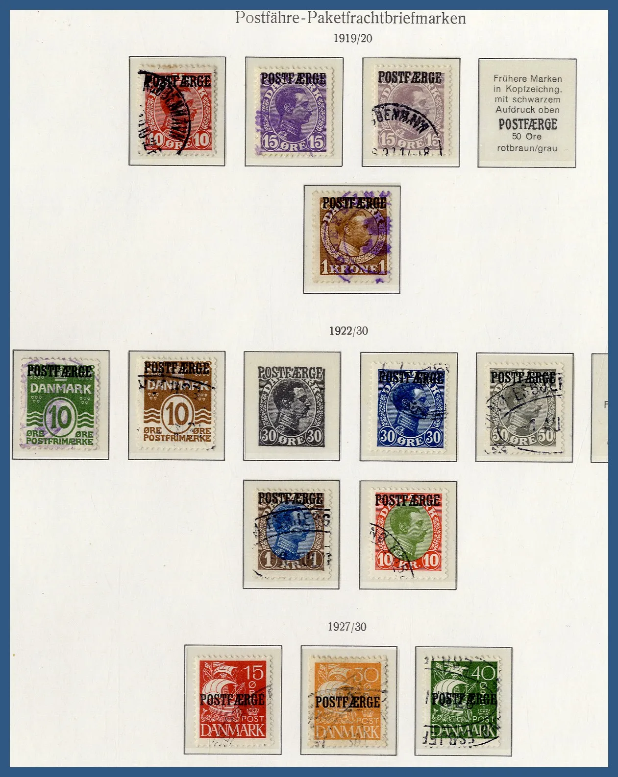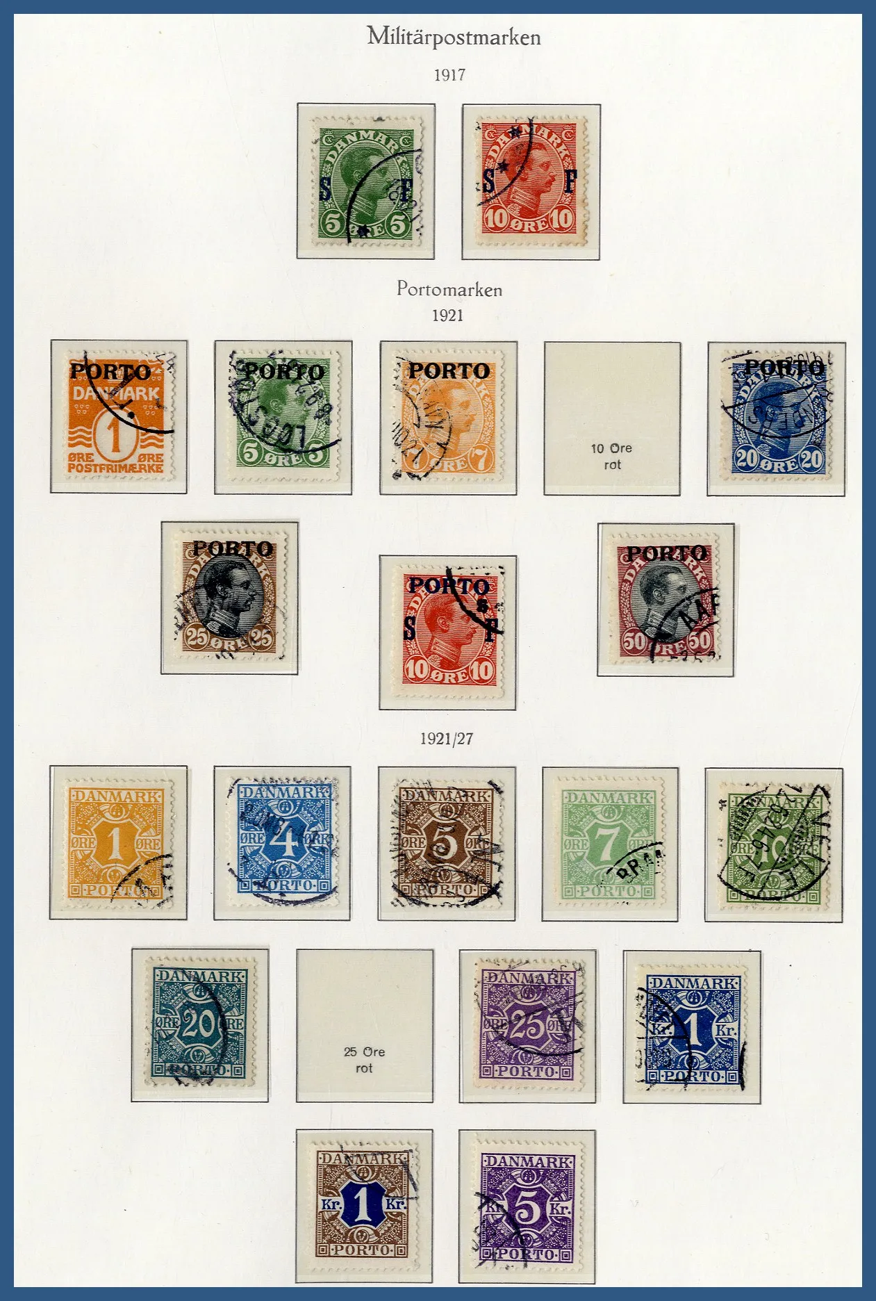 Färöarna i 5 röda KABE-album. Danmark inleds med 16 st skillingmärken. Därefter är samlingen mycket glest besatt t.o.m. 1969, men fr.o.m. 1970 fram till 1999 i det närmaste komplett. Även starka avsnitt Lösen-, Tidnings- och Postfärjemärken. Danska Västindien med en hel del märken, Grönland t.o.m. 1999 med bl a 6 st PAKKEPORTO-märken och komplett serie Olika motiv, Färöarna med F 4-8 (påtryck på danska märken) samt 1975-1999 till synes komplett.